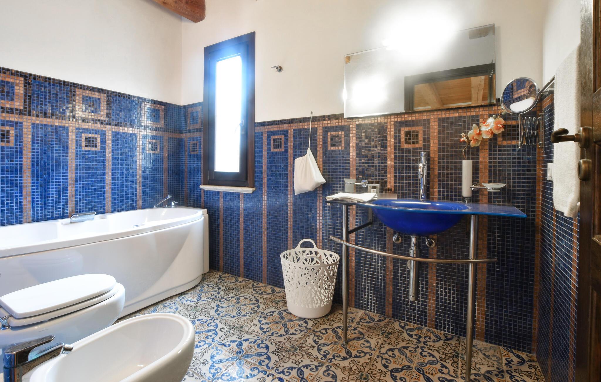 Dette indbydende feriehus i Partinico kombinerer moderne komfort med traditionel stenhuscharme. I kan glæde jer til den høje kvalitet og det smarte design på husets to etager og finde jeres yndlingsrum. Den smagfulde indretning skaber en hyggelig atmosfære, mens I kan slappe af på den store terrasse og nyde udsigten til den velholdte ejendom. Den fælles pool, legehuset og legepladsen er perfekte til familier og byder på masser af plads til sjov og afslapning. Om aftenen kan I fyre op i den fælles grill og tilberede lækre måltider. Her kan I opleve en harmonisk balance mellem privat afslapning og selskabelige stunder året rundt.