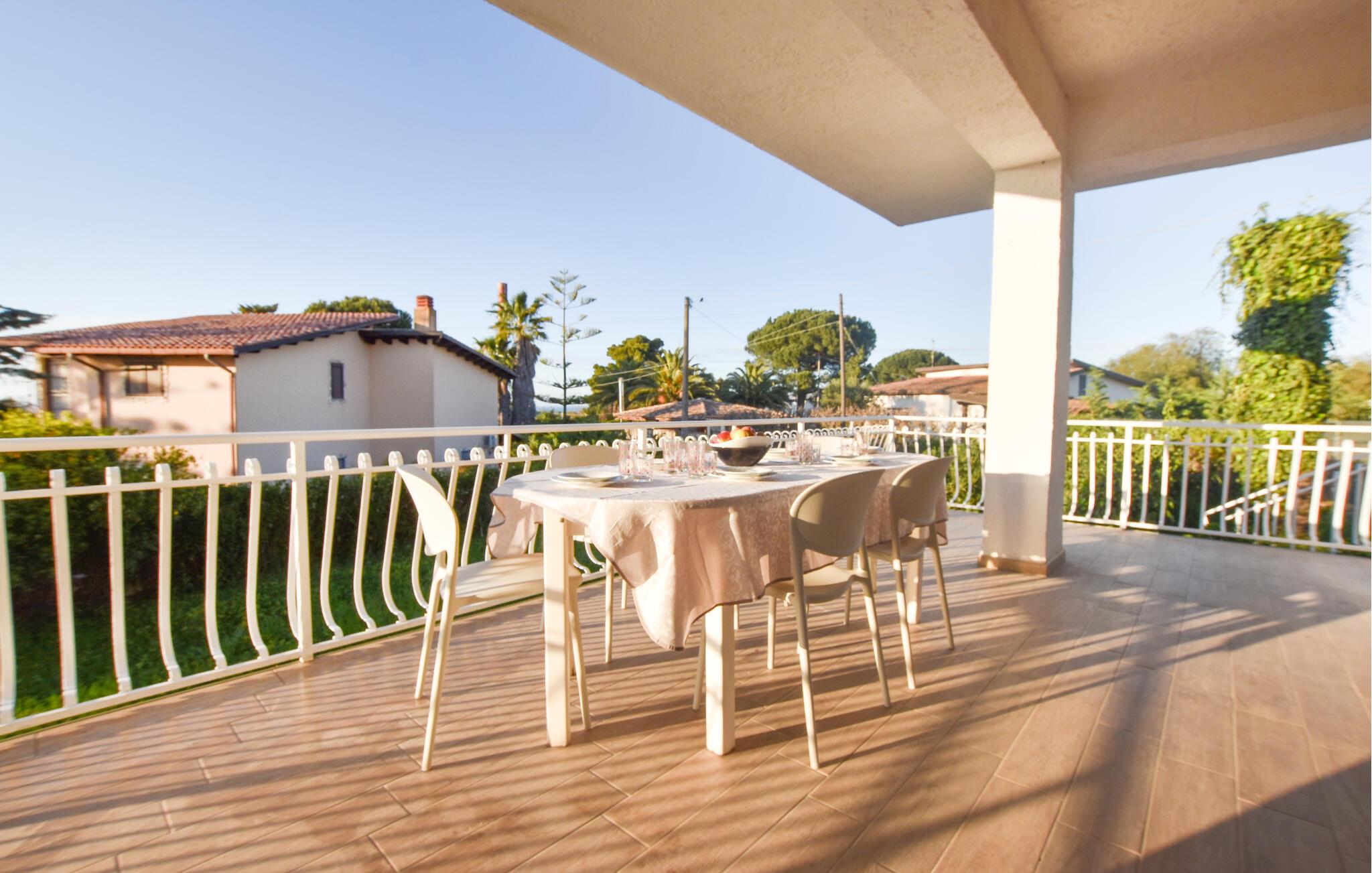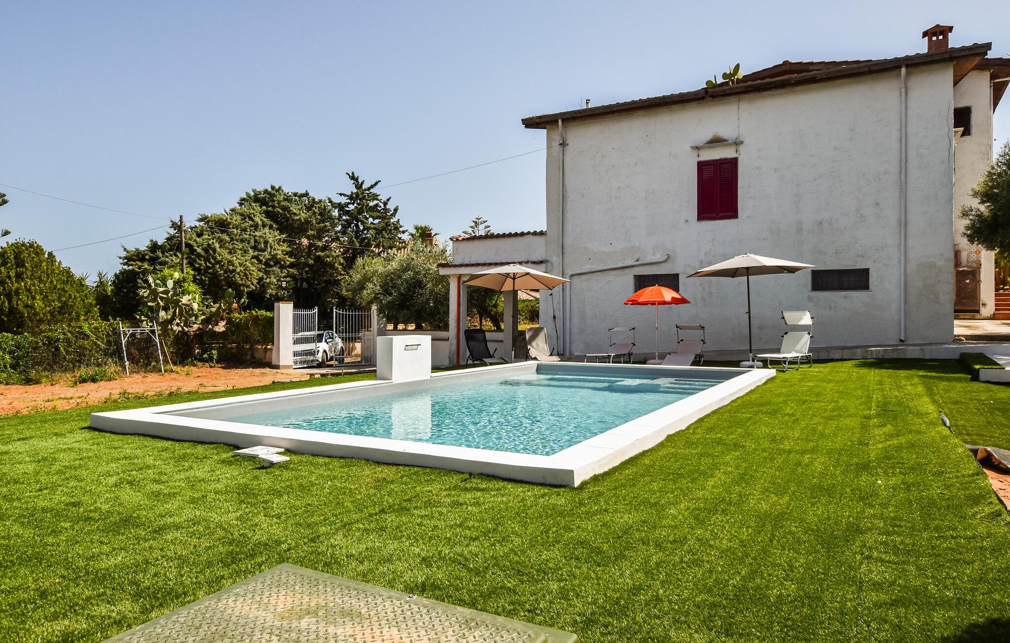 Planlæg en hyggelig ferie i dette rummelige feriehus med pool og havudsigt.