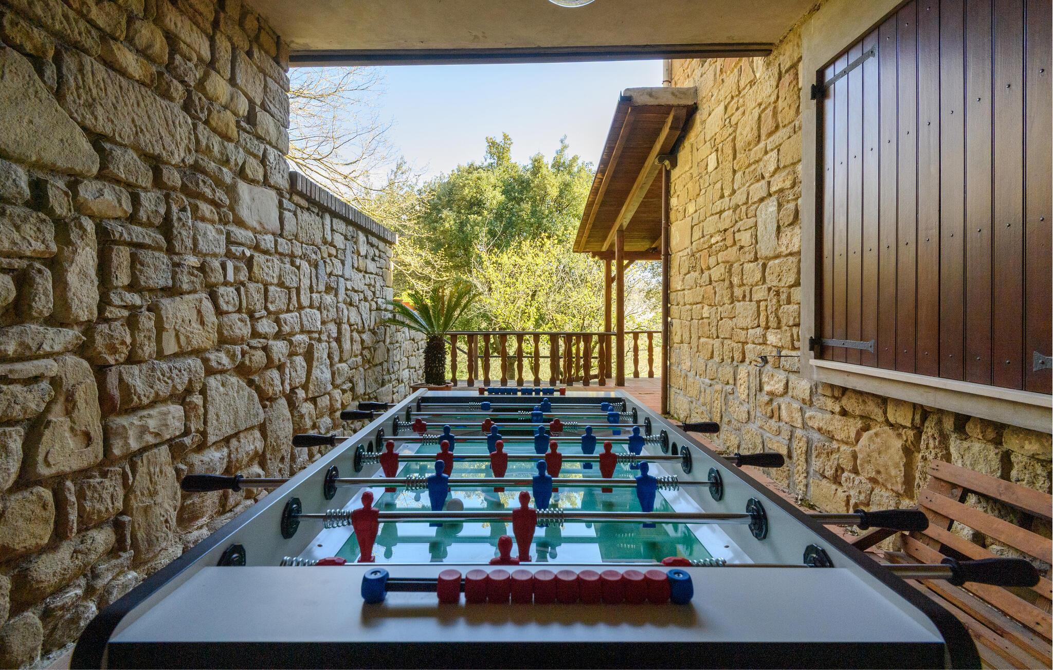 Dette rummelige naturstenshus med rustik charme giver jer masser af plads til at nyde en social ferie med en bred vifte af fritidsaktiviteter med en større familie eller venner. Fejr dagens måltider ved det lange spisebord og planlæg jeres aktiviteter her. Arranger glade spilleaftener, udfordr jer selv med bordfodbold eller slap af sammen med en hyggelig filmaften.