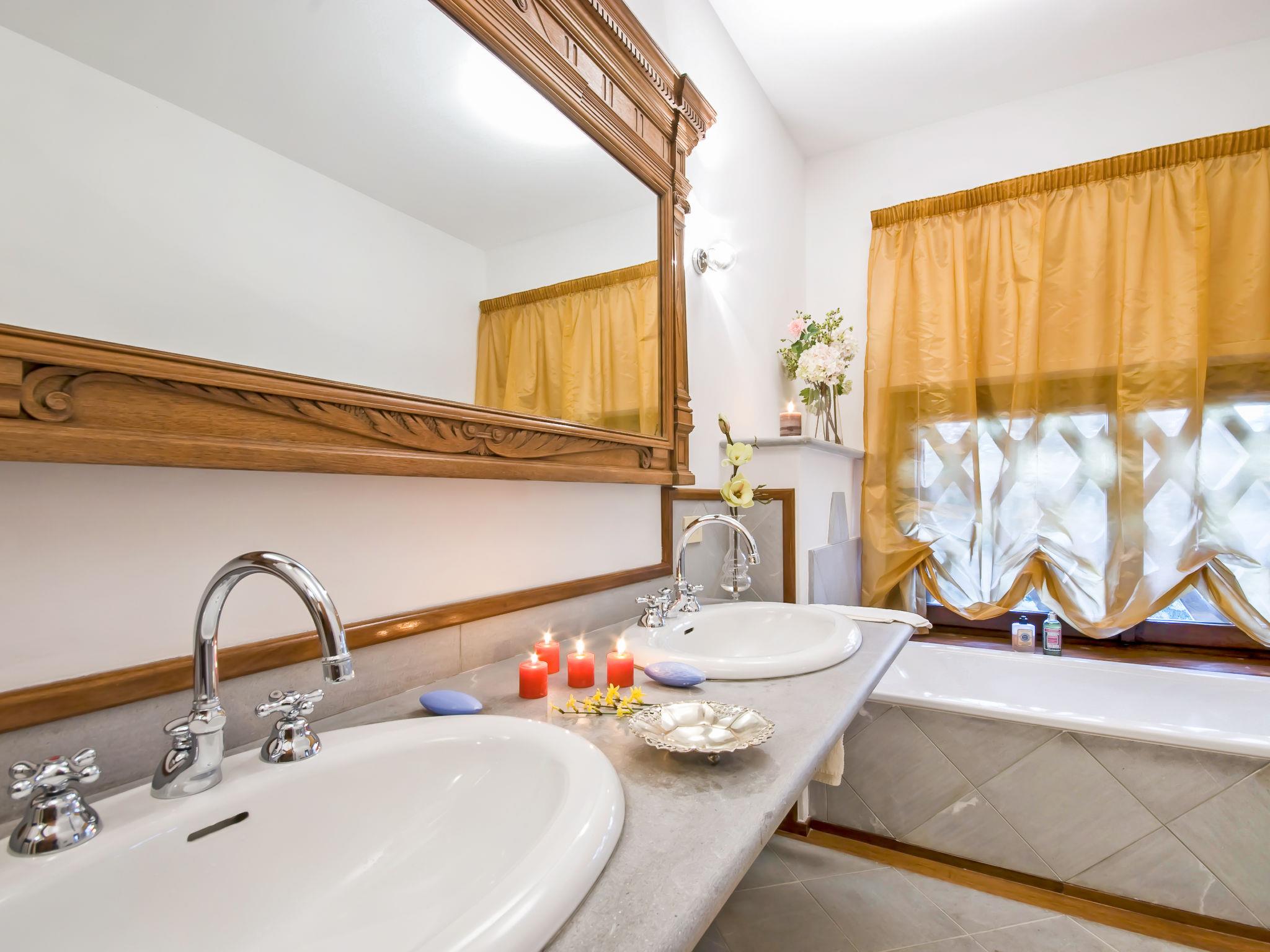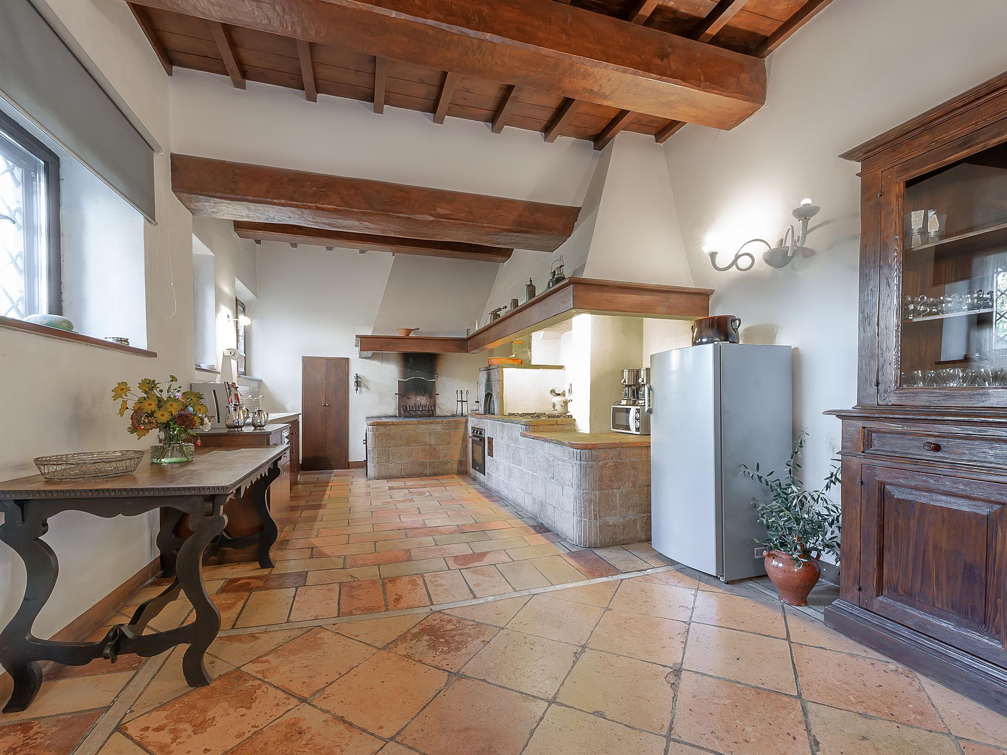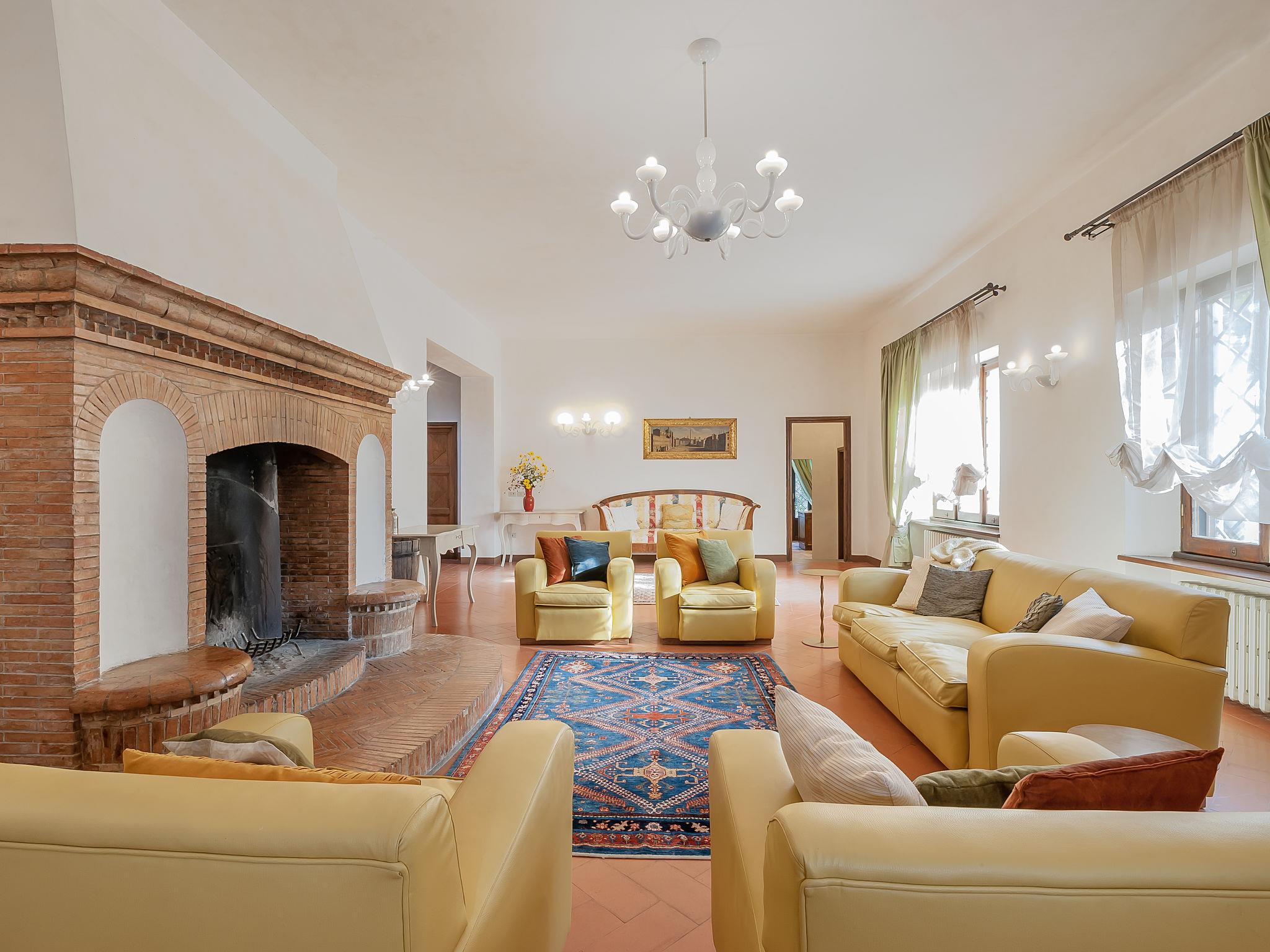 13-room villa 700 m2 on 3 levels. Spacious, tasteful and stylish furnishings: large entrance hall with open-hearth fireplace. Exit to the garden. Large dining room. Exit to the garden. Lounge with satellite TV (flat screen), DVD. Exit to the garden. Computer room 18 m2. Exit to the garden. Kitchen 37 m2 (6 hot plates, oven, dishwasher, microwave, freezer, electric coffee machine, Capsules for coffee machine (Segafredo)) with open-hearth fireplace, dining table and satellite TV (flat screen). Sep. WC. Upper floor: large lounge with panoramic window with open-hearth fireplace and library. Exit to the balcony. 1 large double bedroom 40 m2, window onto the living room with bath/bidet/WC and satellite TV (flat screen). 1 room 30 m2 with 2 beds, bath/shower/bidet/WC and satellite TV (flat screen). Exit to the balcony. 1 double bedroom 27 m2 with 2 beds and bath/shower/bidet/WC. 1 double bedroom 17 m2 with bath/shower/bidet/WC and satellite TV (flat screen). 2nd upper floor: 1 large double bedroom 35 m2 with panoramic window with open-hearth fireplace, shower/bidet/WC, double hand-basin and satellite TV (flat screen). 1 double bedroom 16 m2 with shower/bidet/WC and satellite TV (flat screen). 1 room 15 m2 with 2 beds and bath/shower/bidet/WC. 1 double bedroom 15 m2. 1 room 23 m2 with 2 beds and satellite TV (flat screen). Bath/bidet/WC. Gas heating (extra). Heating available only from 15.10. to 15.04. Panoramic view of the countryside. Facilities: washing machine, dryer, safe, iron, mosquito net, children's high chair, hair dryer, logs (free). Internet (WiFi, free). Parking (fenced). IT054039B902016521