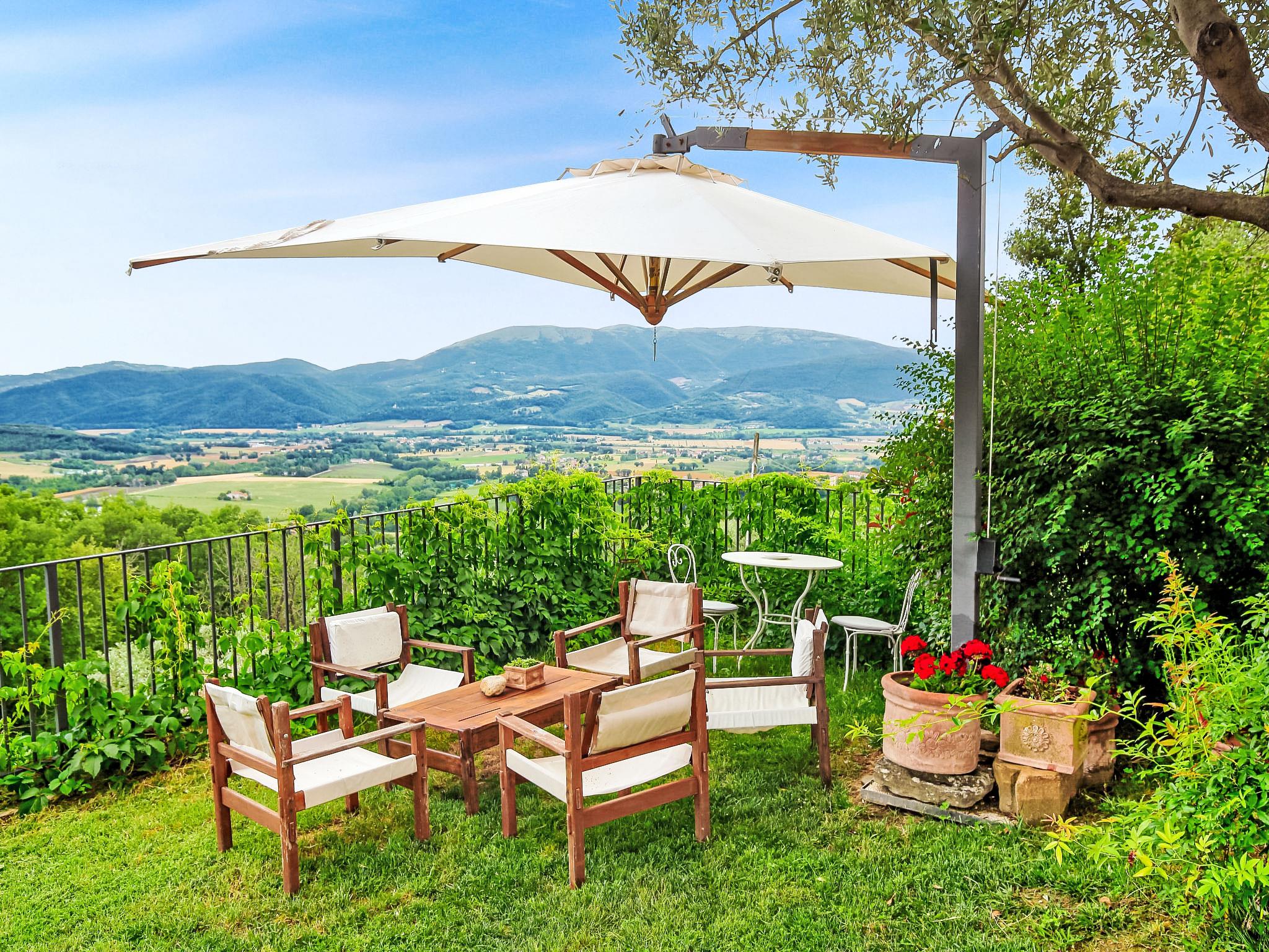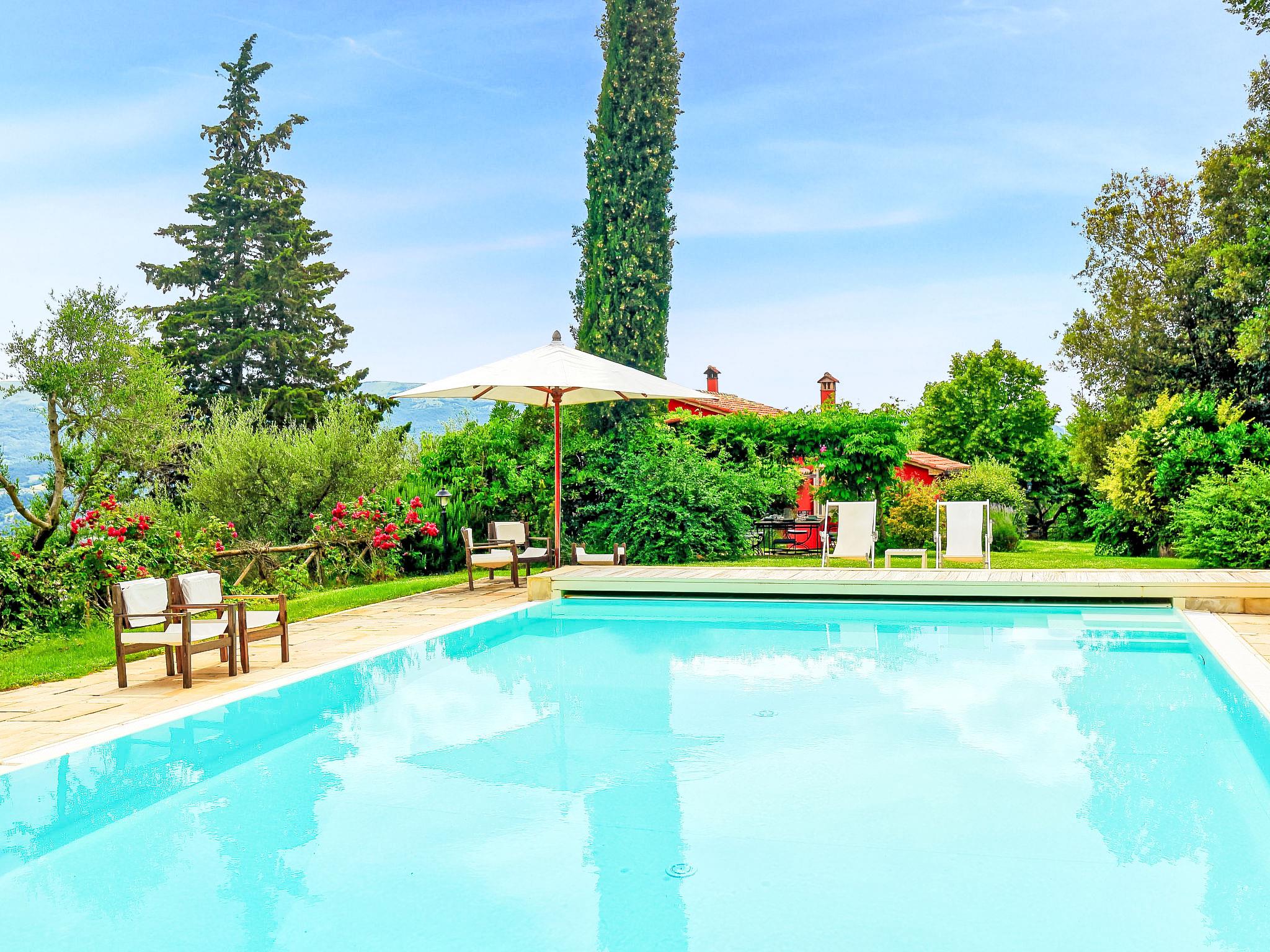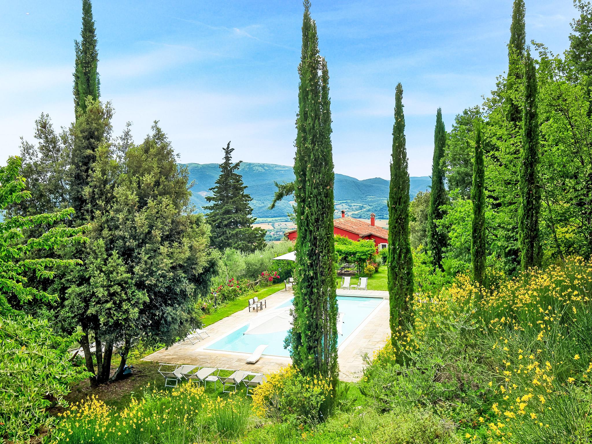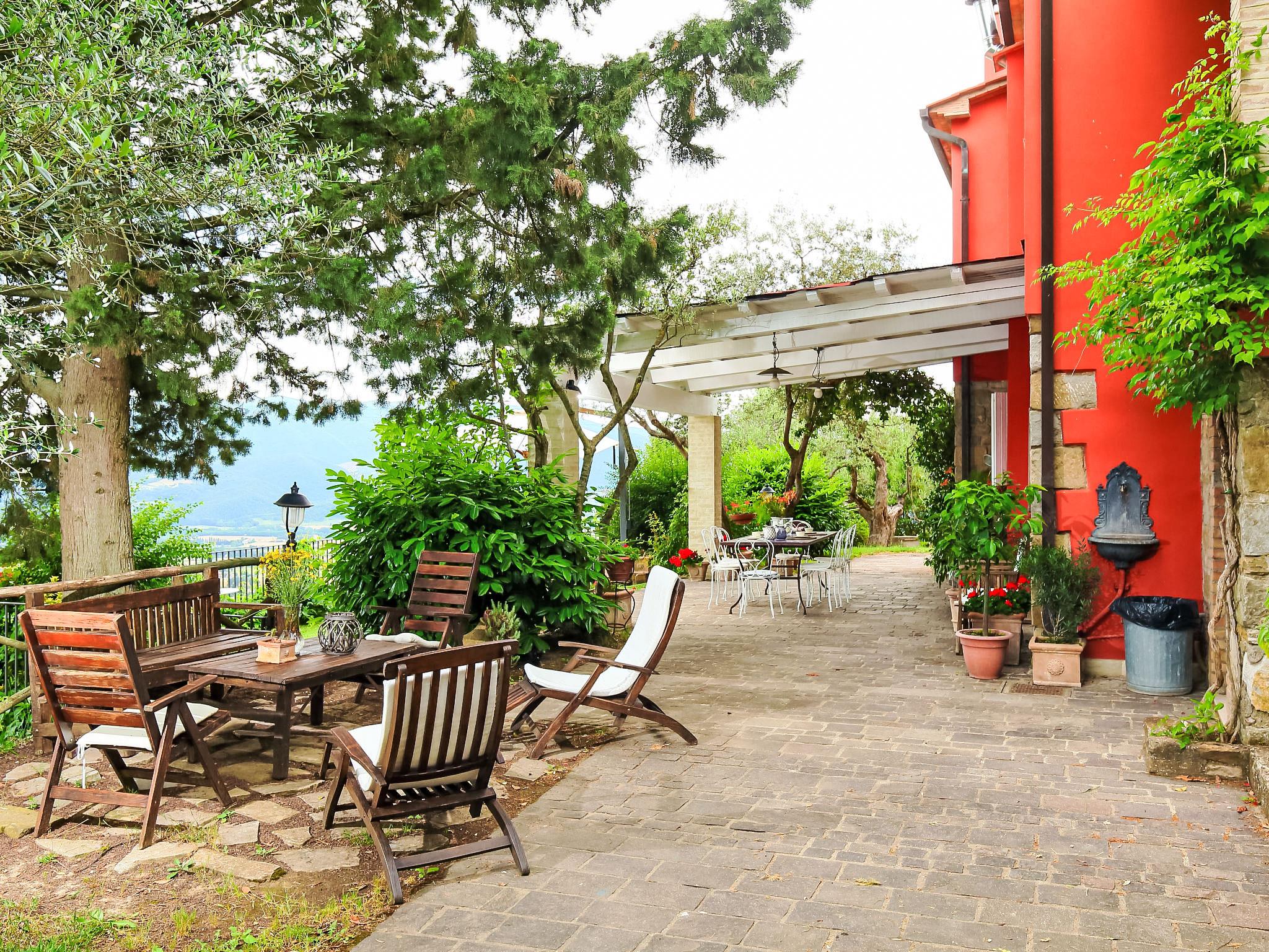 Situated at the top of a beautiful hill in the heart of Umbria, well connected to the main service centers, this house has an incomparable view of the valley. Ideal for relaxing holiday and with beautiful nature, without lacking of any kind of comfort. Villa " Paradiso", 330 m a.s.l., detached, surrounded by trees, meadows and fields. Property composed of main house and outbuilding 24 km from the centre of Perugia, in a secluded, sunny, elevated position, 36 km from the lake. Private: property 3 ha, wildlife garden and flowers, beautiful garden to relax, swimming pool (6 x 14 m, depth 120 - 250 cm, seasonal availability: 01.May. - 30.Sep.). Outdoor shower, garden furniture, barbecue, pool maintenance by the owner/gardener. In the house: WiFi. Parking at the house. E-charging station. Grocery 5 km, restaurant 5 km, bar 4 km, thermal baths "Terme Francescane" 40 km, bathing lake "Trasimeno" 36 km. Golf course (18 hole) 12 km, riding stable 7 km. Nearby attractions: Gubbio 35 km, Città di Castello 40 km, Assisi 40 km, Passignao sul Trasimeno 40 km, Arezzo 75 km. Please note: car recommended. Groups of teenagers on request only. Inside the park under the pergola there is a barbecue area with a refrigerator, wood oven, oven, gas stove and a large dining table. According to the season it is possible to taste the vegetable garden products.