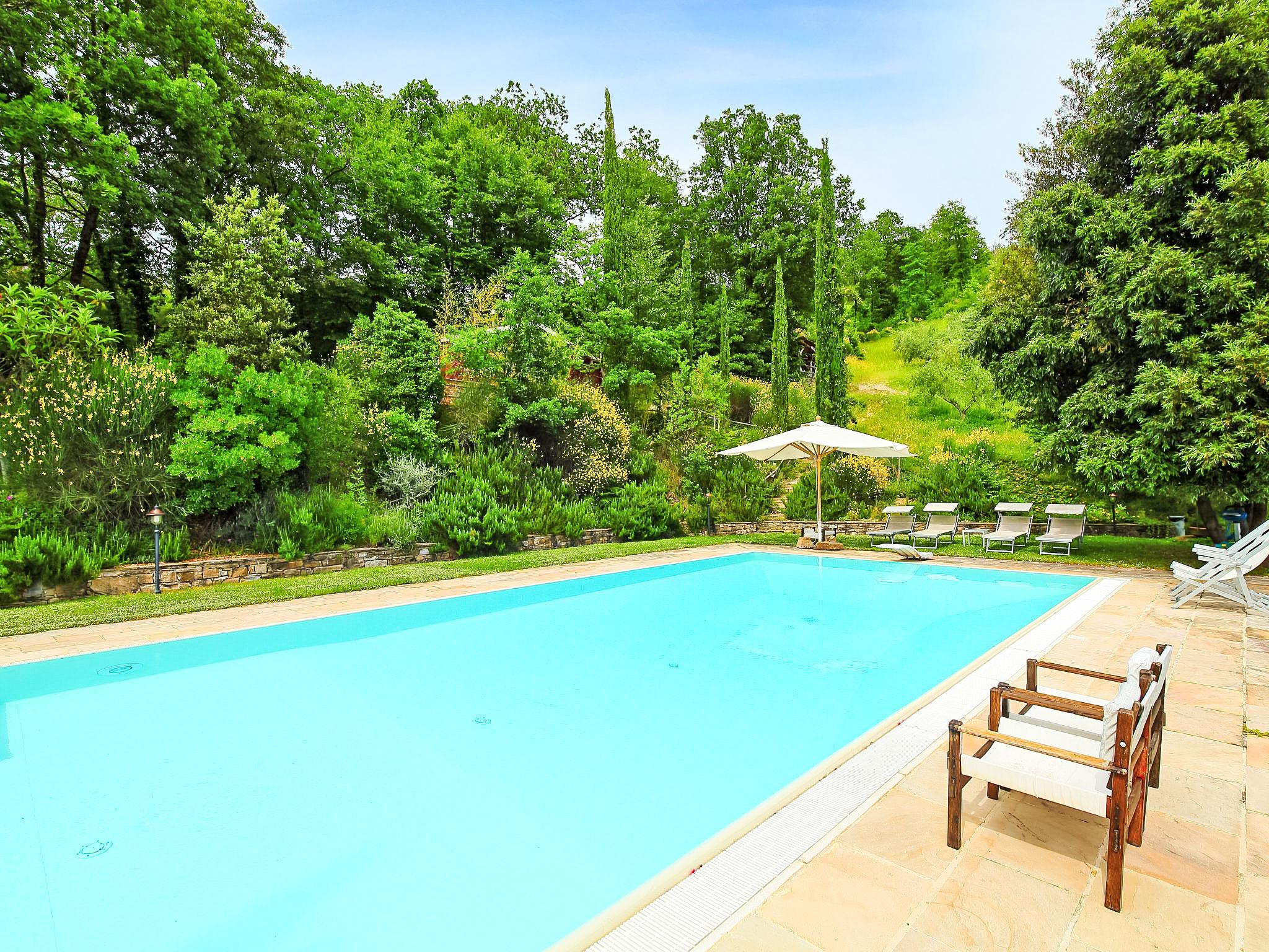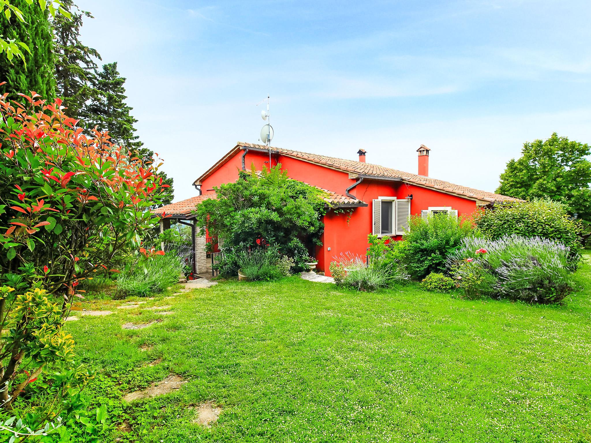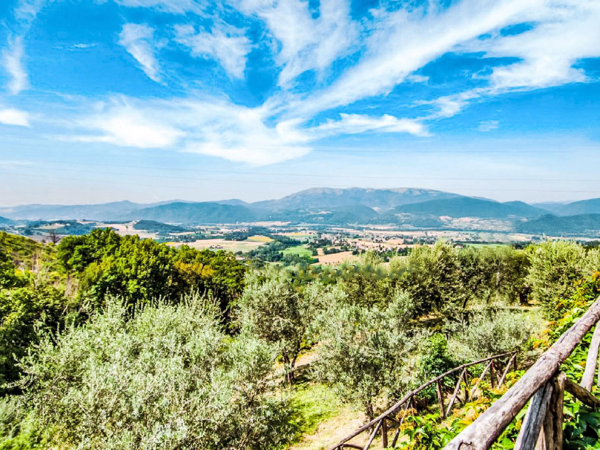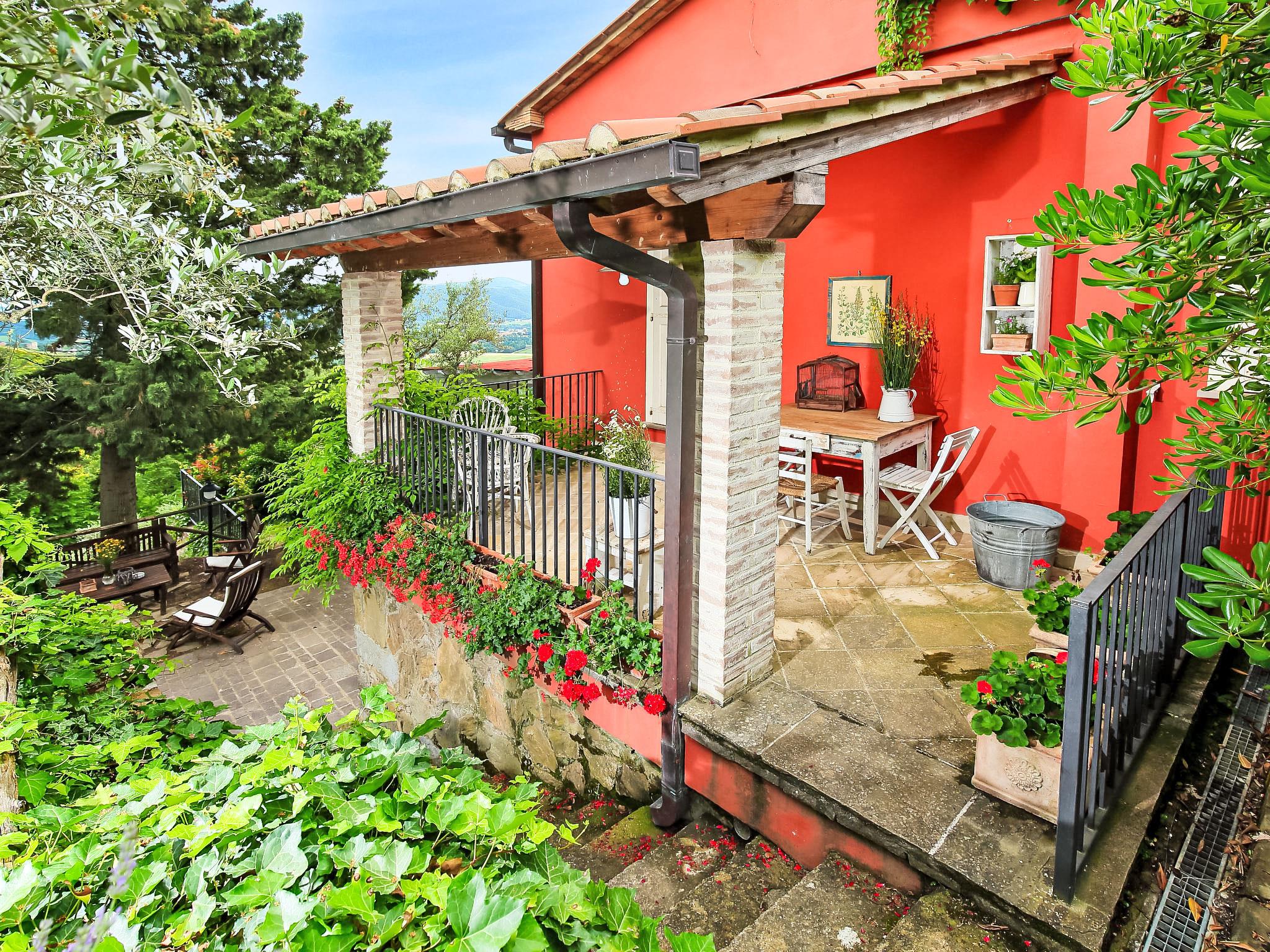 Situated at the top of a beautiful hill in the heart of Umbria, well connected to the main service centers, this house has an incomparable view of the valley. Ideal for relaxing holiday and with beautiful nature, without lacking of any kind of comfort. Villa " Paradiso", 330 m a.s.l., detached, surrounded by trees, meadows and fields. Property composed of main house and outbuilding 24 km from the centre of Perugia, in a secluded, sunny, elevated position, 36 km from the lake. Private: property 3 ha, wildlife garden and flowers, beautiful garden to relax, swimming pool (6 x 14 m, depth 120 - 250 cm, seasonal availability: 01.May. - 30.Sep.). Outdoor shower, garden furniture, barbecue, pool maintenance by the owner/gardener. In the house: WiFi. Parking at the house. E-charging station. Grocery 5 km, restaurant 5 km, bar 4 km, thermal baths "Terme Francescane" 40 km, bathing lake "Trasimeno" 36 km. Golf course (18 hole) 12 km, riding stable 7 km. Nearby attractions: Gubbio 35 km, Città di Castello 40 km, Assisi 40 km, Passignao sul Trasimeno 40 km, Arezzo 75 km. Please note: car recommended. Groups of teenagers on request only. Inside the park under the pergola there is a barbecue area with a refrigerator, wood oven, oven, gas stove and a large dining table. According to the season it is possible to taste the vegetable garden products.