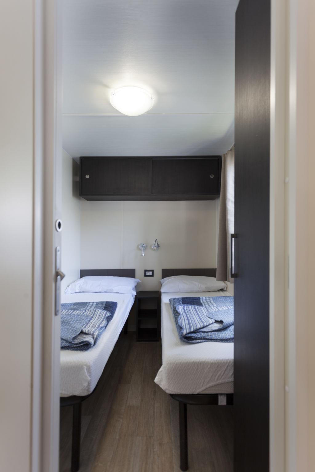 "Baia Relax New Plus", 3-room mobile home 25 m2. Modern furnishings: living/dining room with dining table and TV. 1 room with 1 french bed (140 cm). 1 room with 2 beds (70 cm), 1 x 1 bunk beds (65 cm, length 170 cm). Kitchenette (4 gas rings, freezer). Shower/WC. Air-conditioning, forced-air heating (extra). Terrace roofed. Terrace furniture. Facilities: baby cot for up to 2 year olds (extra). Parking (1 car). Please note: non-smokers only. Bed layout is flexible. There are more sleeping options available than the maximum number of people allowed which may, however, not be exceeded. IT023022B1P4KHX4L9