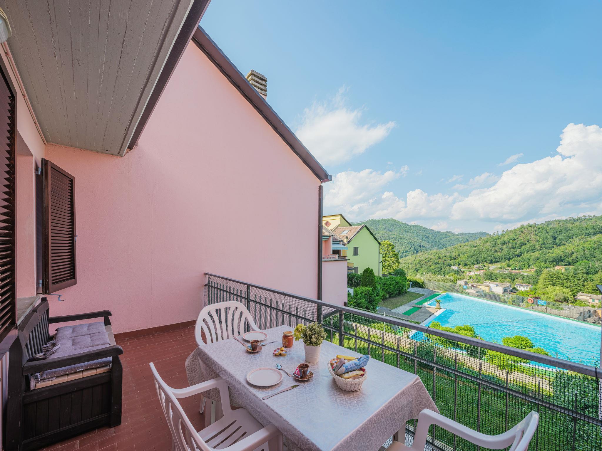 Large residence "Villaggio 5 Terre", 460 m a.s.l., surrounded by trees. In the hamlet Puin 6 km from the centre of Pignone, 11 km from the centre of Levanto, 22 km from the centre of La Spezia, in a quiet, elevated position, 9 km from the sea, 9 km from the beach. For shared use: park (fenced), swimming pool angular (400 m2, depth 170 - 220 cm, seasonal availability: 15.Jun. - 15.Sep. pool opening hours: 09:30-19:30). Children's pool, outdoor shower, tennis, table tennis, boccia, barbecue house, children's playground, pool maintenance by the owner/gardener. In the house: central heating system, heating to be paid on the spot (22.Mar. - 31.Oct.), heating available only from 01.Nov. - 21.Mar.. Parking on the premises. Grocery 6 km, supermarket 6 km, shopping centre 22 km, restaurant, bus stop 100 m, railway station "Monterosso / Levanto" 10 km, sandy beach 9 km. Nearby attractions: Monterosso al Mare 9 km, Vernazza 10 km, Corniglia 13 km, Santa Margherita 72 km, Levanto 26 km, Riomaggiore 31 km. Hiking paths: Parco Nazionale delle Cinque Terre. Please note: car recommended. Suitable for families. The owner does not accept any youth groups. Neighbourhood highly sensitive to noise. Quietness and good behaviour expected. Obligation to wear bathing caps.