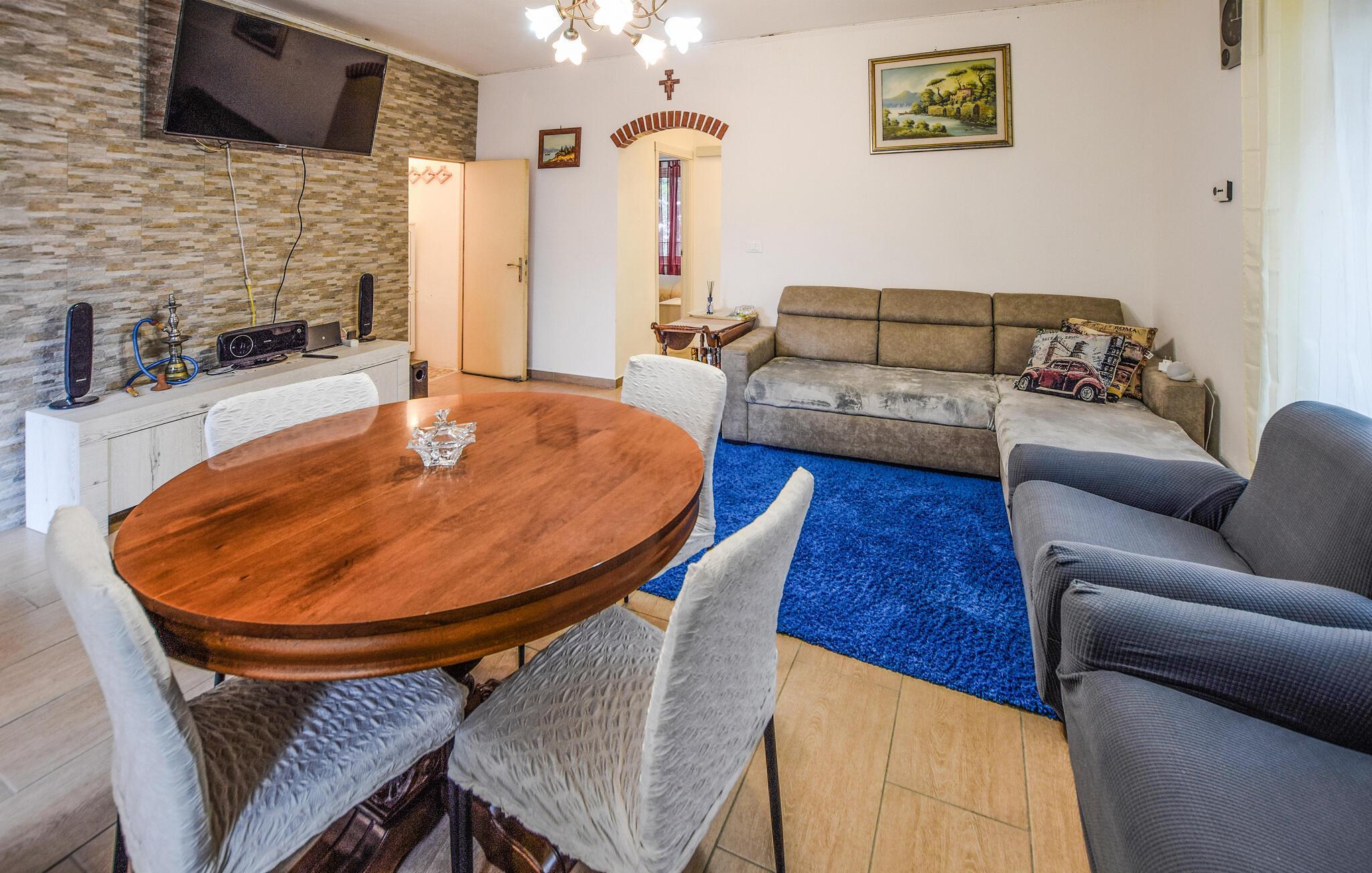 Dette rummelige feriehus tilbyder jer et charmerende tilflugtssted, hvor I kan nyde en afslappende pause fra hverdagen med venner eller familie. Tilbered jeres yndlingsmåltider i det moderne køkken, og sæt jer ned i de komfortable sofaer efter en lang dag for at slappe af med en film eller en hyggelig spilleaften.