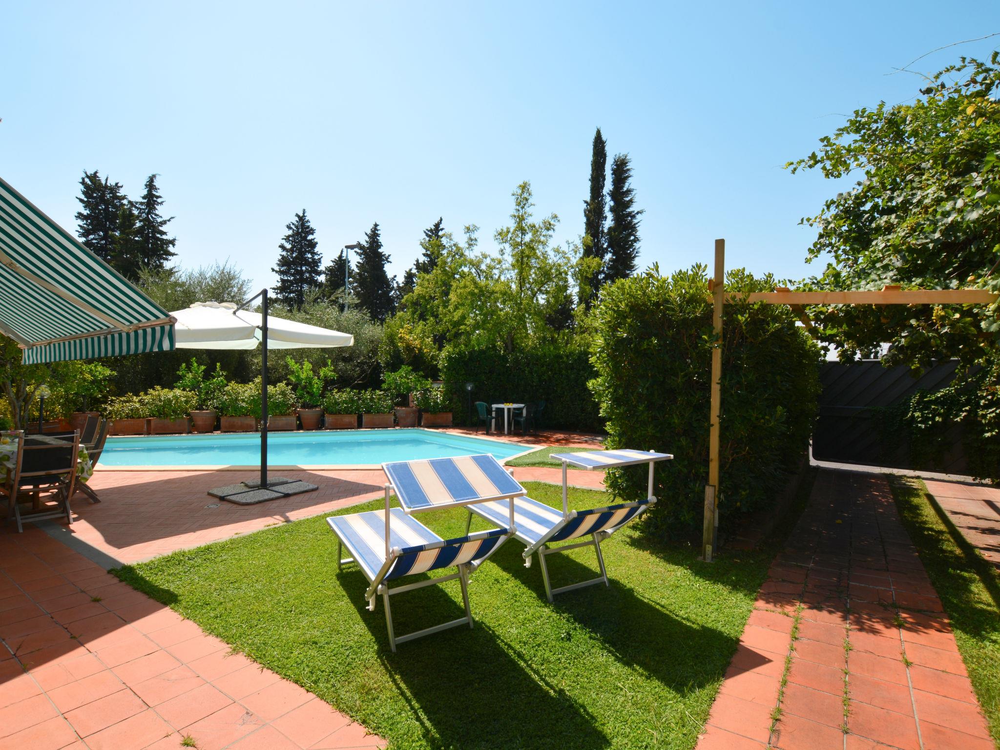 Very comfortable 2-family house "Villa Lucia", 2 storeys. 3 km from the centre of Prato, 1 km from the centre of Coiano, 20 km from the centre of Florenz, residential area (villas). For shared use: property (fenced), terraced garden with lawn and trees. Private: swimming pool (10 x 5 m, seasonal availability: 03.Apr. - 23.Oct.). In the house: washing machine (for shared use), heating available only from 01.Nov. - 15.Apr.. Parking. Shop 1 km, supermarket 3 km, bus stop 500 m, railway station "Prato" 3 km. Please note: the owner lives in the same residence.