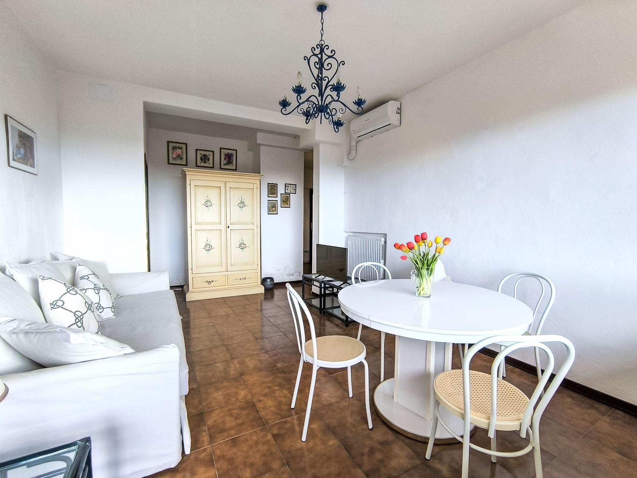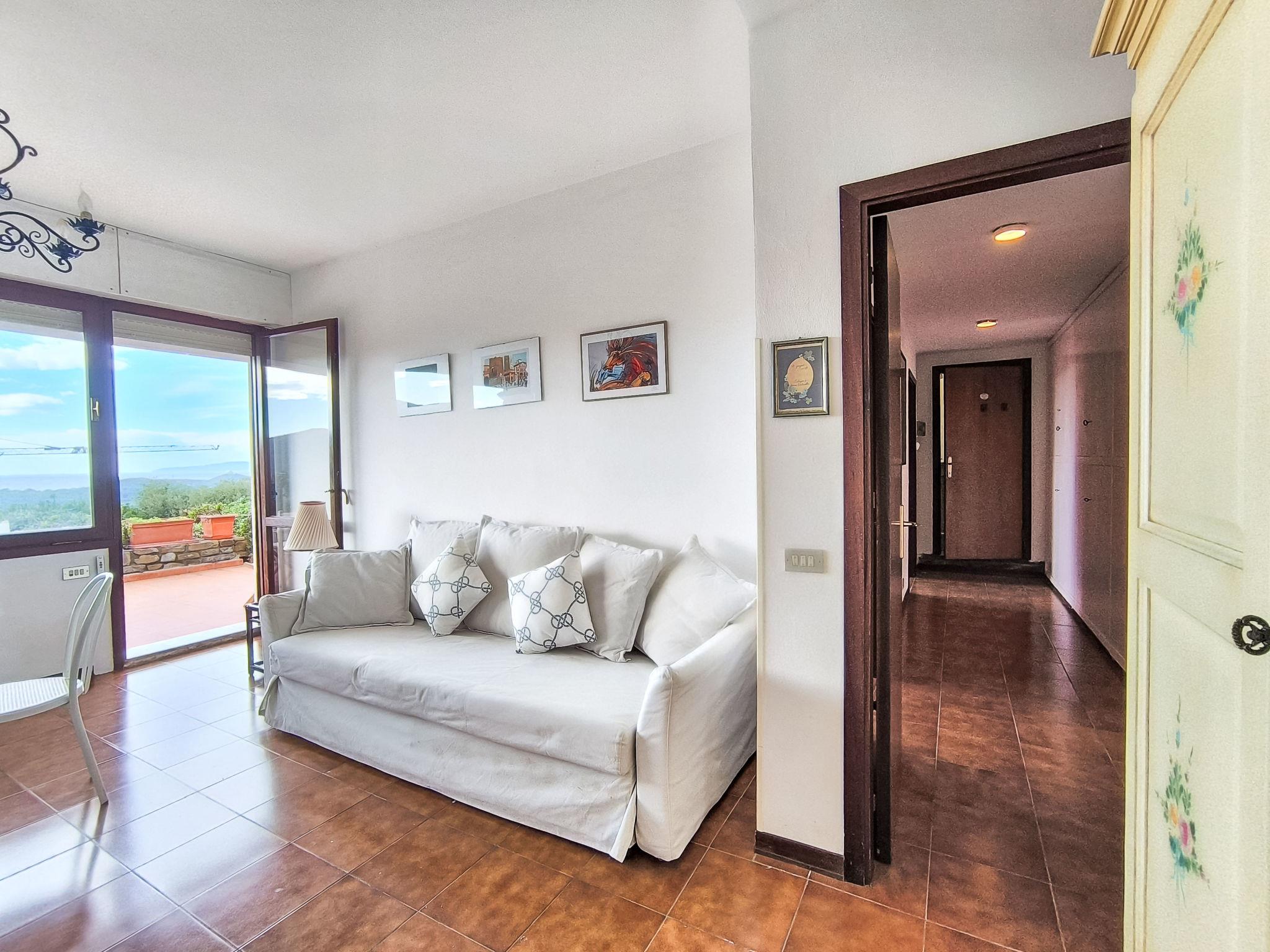 "Montparnasse", 3-room apartment 70 m2, on the upper ground floor. Simple and cosy furnishings: living/dining room with panoramic window with 1 double sofabed and TV. Exit to the terrace. 1 double bedroom. Exit to the terrace. 1 room with 2 beds. Exit to the terrace. Open kitchen (oven, dishwasher, microwave, electric coffee machine). 2 baths/bidet/WC. Air-conditioning, forced-air heating. Large terrace partly roofed, patio. Terrace furniture, deck chairs. Marvellous view of the sea and the countryside. Facilities: washing machine. Internet (WiFi, free). Parking. Please note: non-smokers only. Maximum 1 pet/ dog allowed. Private entrance, smoke alarm, fire extinguisher. IT053006C2FEQWOM6R