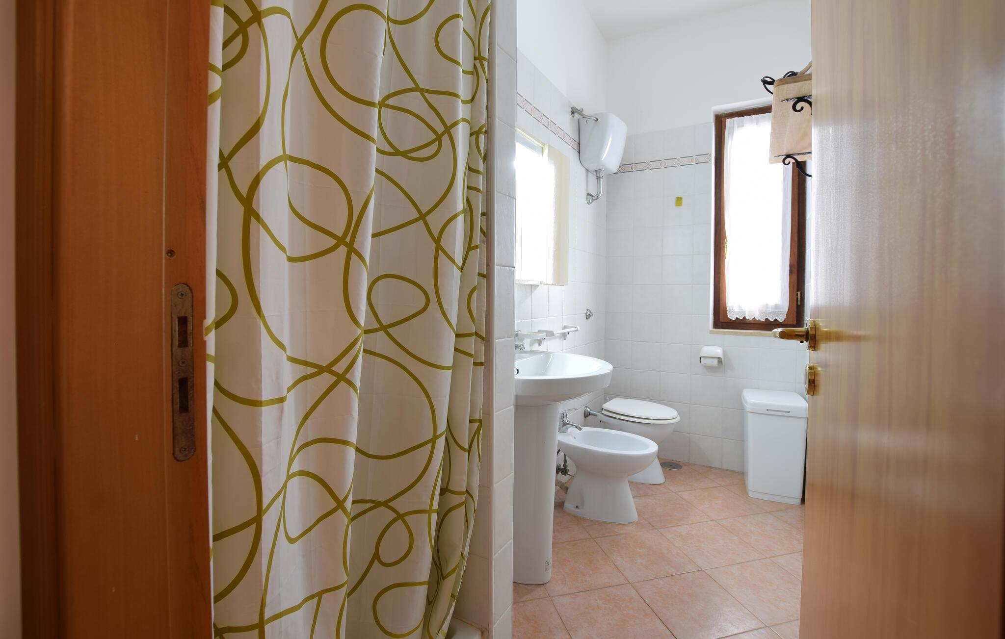 Tilbring jeres ferie i dette feriehus, omgivet af frodige grønne områder. Sæt jer til rette i den lyse, enkelt og funktionelt indrettede opholds- og spisestue. Tilbered middelhavsretter i det åbne køkken, og dæk derefter det tilstødende bord til et fælles måltid. Lad terrassedørene stå åbne og nyd det naturlige lys. Slap af i sofaen med en bog eller planlæg jeres næste udflugter.