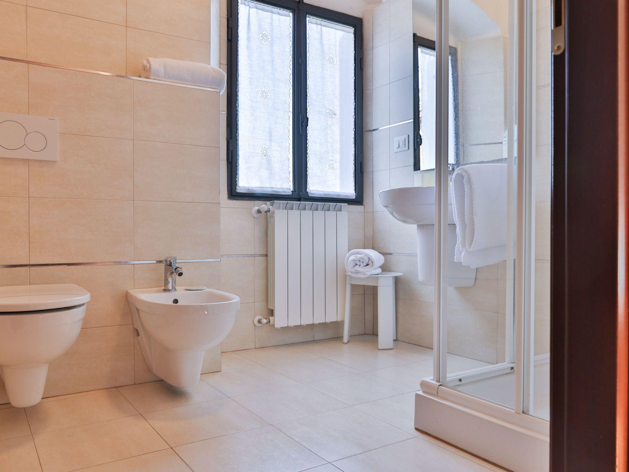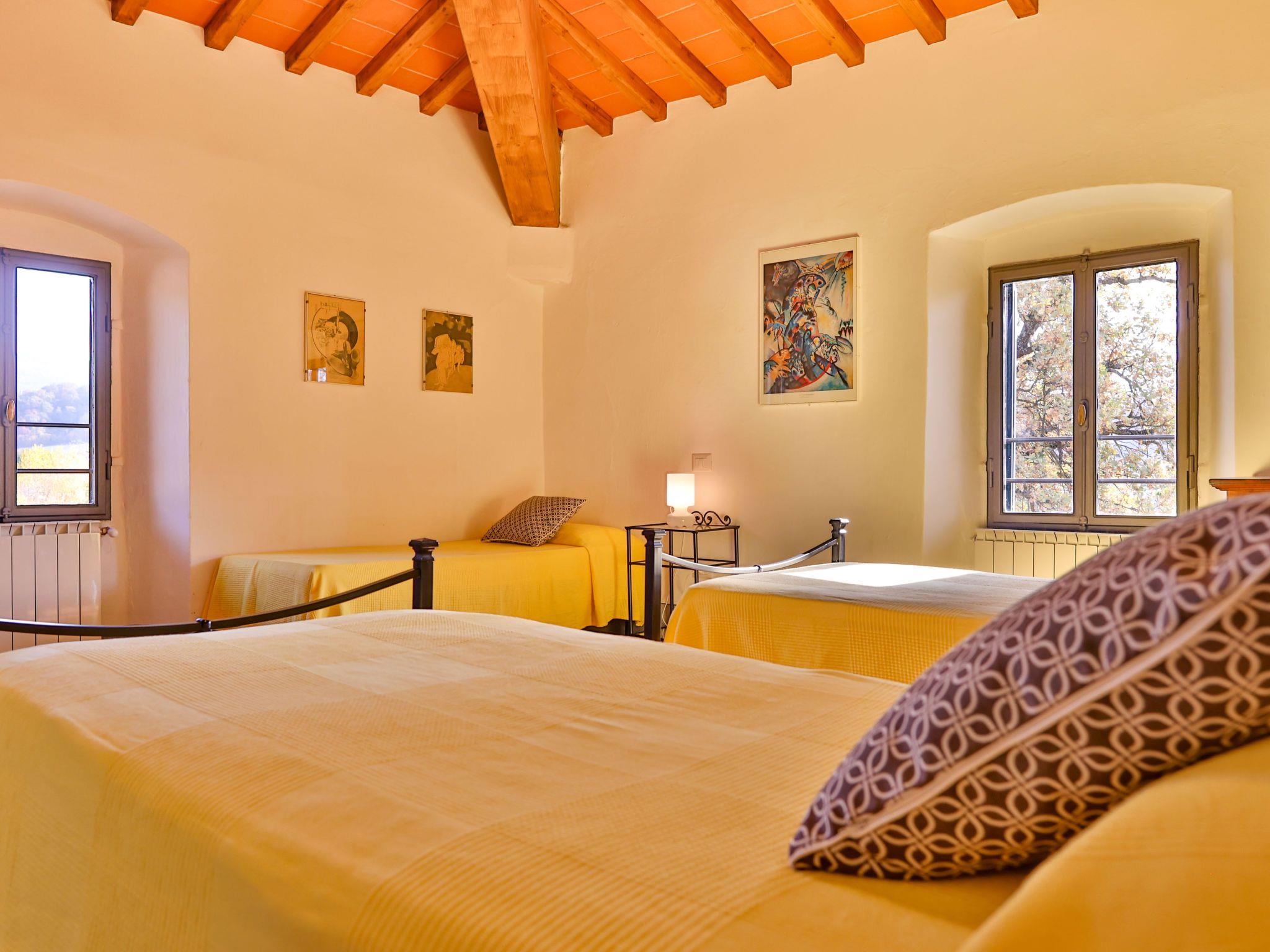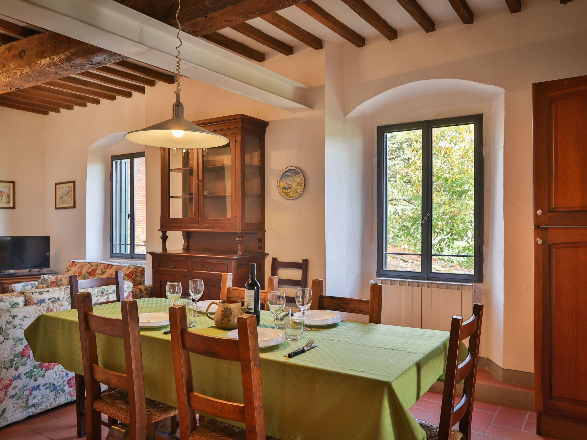 This newly renovated 100 m2 apartment located on the 1st and 2nd floor of one of the main buildings is presented with traditional Tuscan furnishings with modern bathrooms and a convenient open-plan kitchen. The 1st floor comprises: dining room and living room with dining table, open fireplace, cable-TV and kitchenette (4-burner gas hob, electric oven, fridge-freezer, dishwasher); and one double bedroom and bathroom (shower/bidet/WC). The 2nd floor is presented with beautiful high ceilings with Tuscan terracotta and large wooden beams, and comprises: a further double bedroom and a triple bedroom, both with en-suite bathrooms with shower/bidet/WC. Gas heating throughout the apartment. A washing machine is provided.