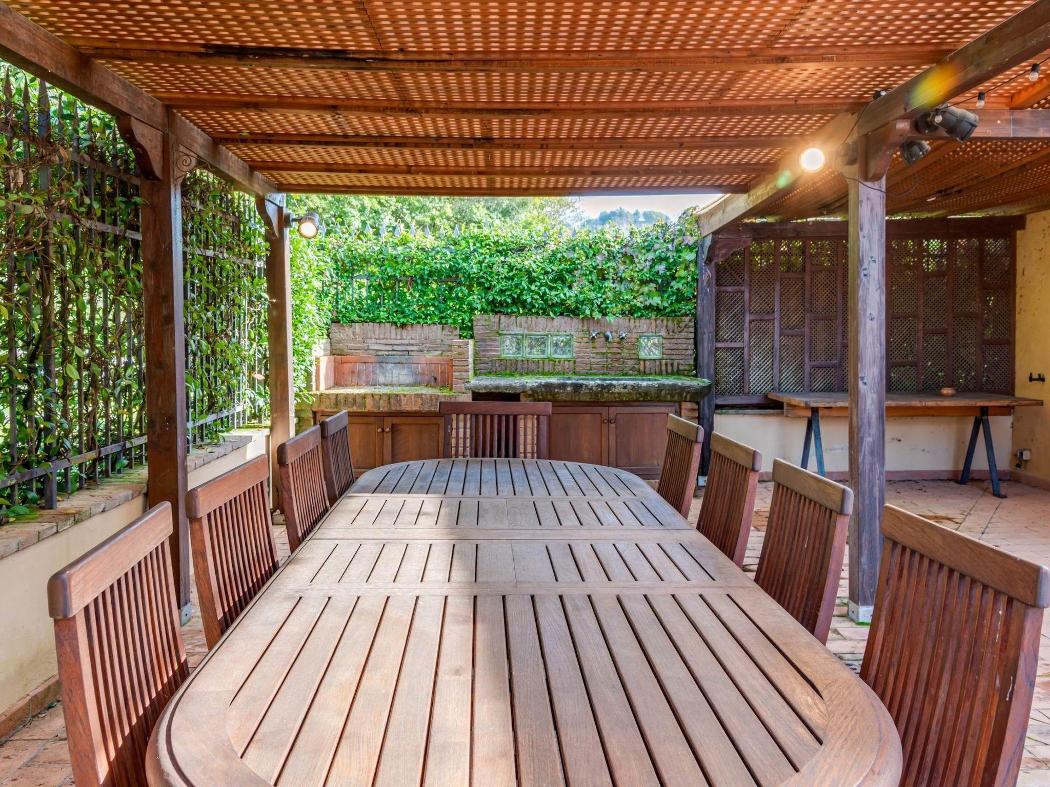 Outside, the garden houses a large saltwater swimming pool (14 x 6 m, depth 140 cm), which can be heated on request (extra charge), equipped with hydro-massage jets on the pool steps, a furnished solarium and gazebo, a dining area with table and barbecue, and a changing room with WC, shower and sauna.
