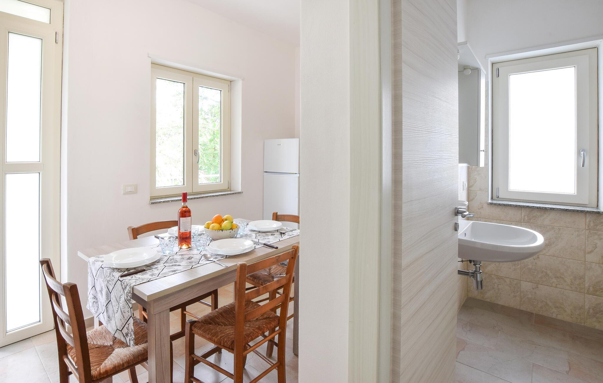 Denne lyse og praktisk indrettede ferielejlighed tilbyder et hyggeligt hjem, hvis I ønsker at kombinere afslappende øjeblikke med charmerende seværdigheder. Planlæg jeres aktiviteter over lækre pastaretter ved det indbydende spisebord, nyd en beroligende siesta, mens en behagelig brise blæser gennem værelserne, og glæd jer til afslappende spilleaftener eller stille læsetimer.