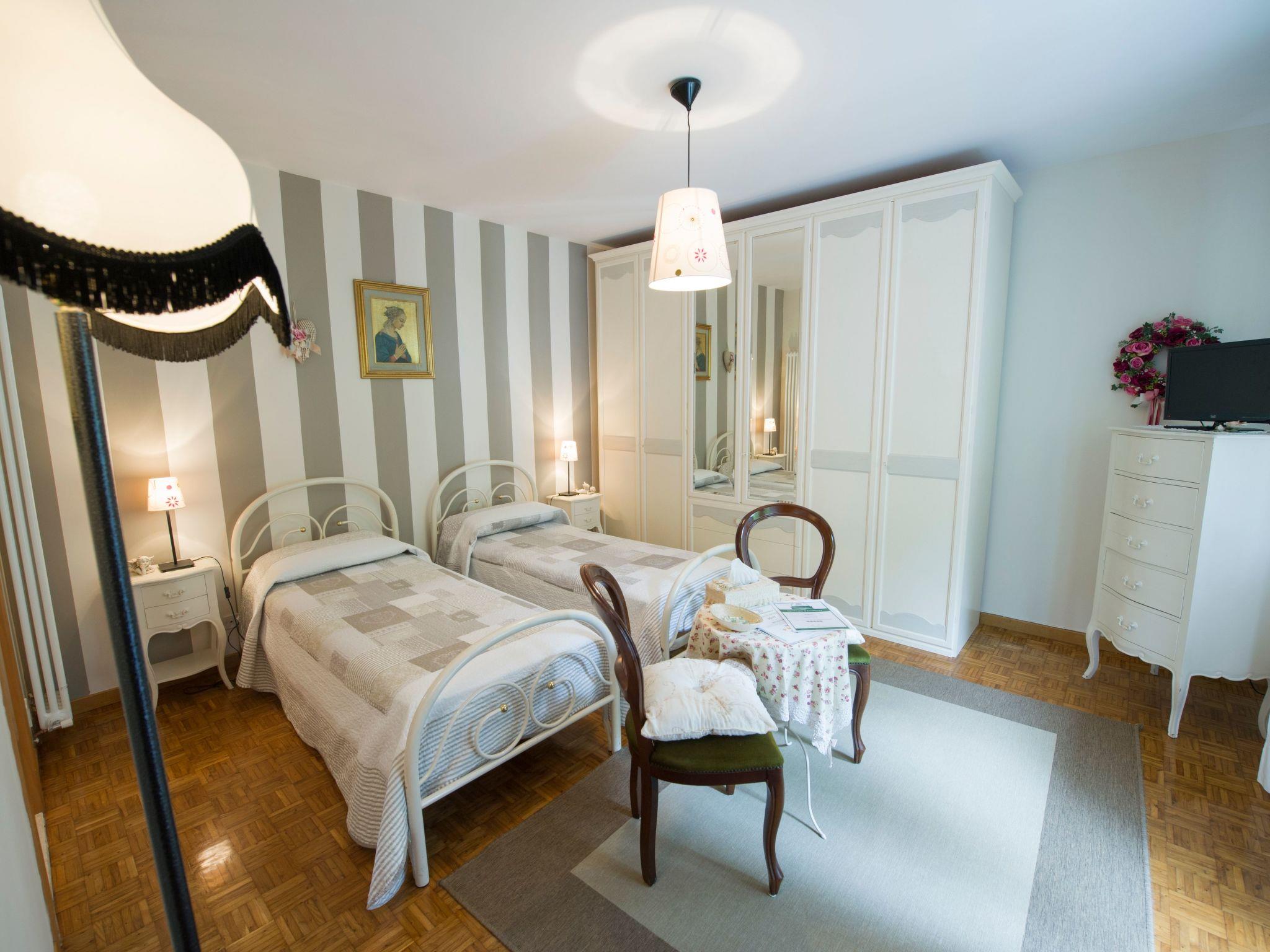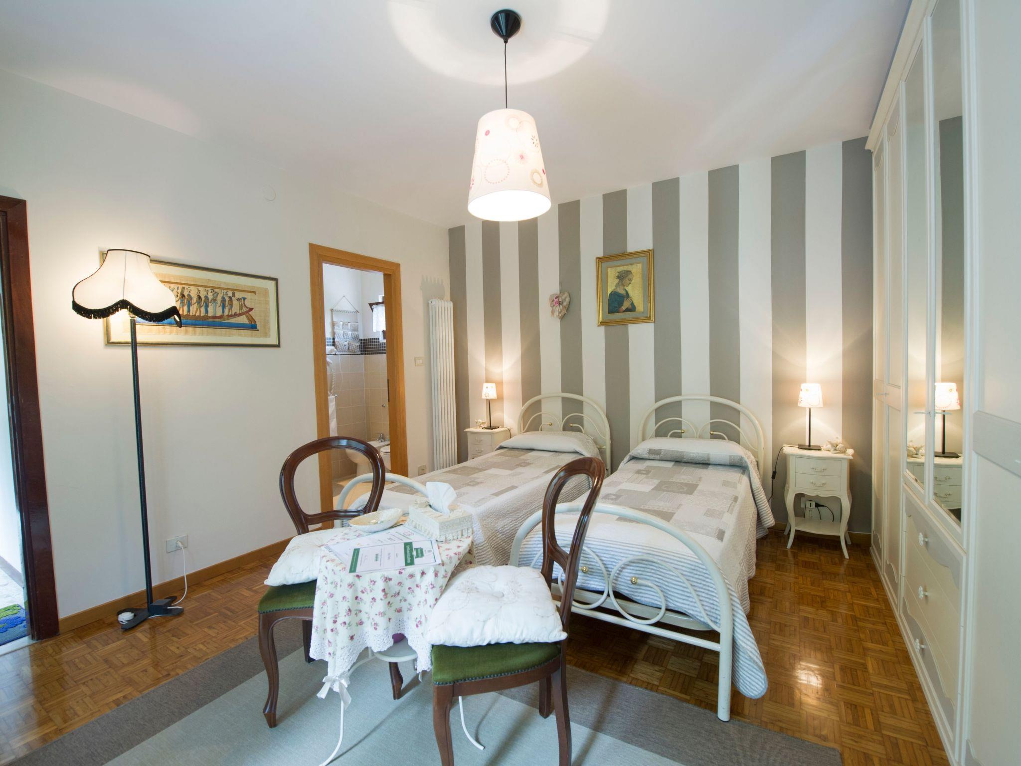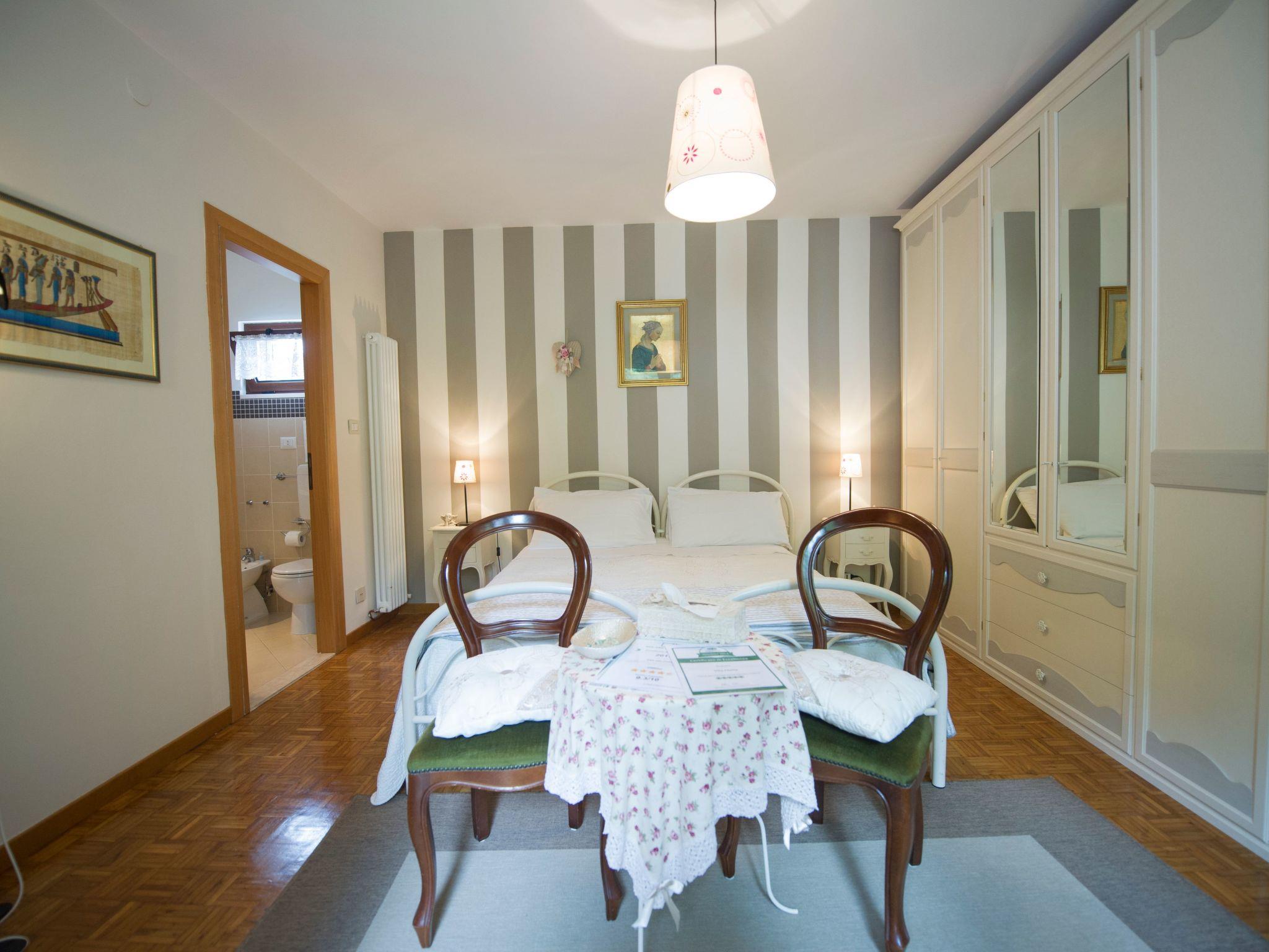 Splendid "Stanza dei Fiori" (Room of the Flowers) 25 sq.m. with separate entrance and lockable door, finely furnished with fine furniture and parquet floor, 2 m double bed, TV, private en-suite bathroom with window, complete with shower, washbasin, bidet and toilet, hairdryer, courtesy kit, bed linen and towels, separate room, balcony with table and chairs. Possibility of adding two more single beds