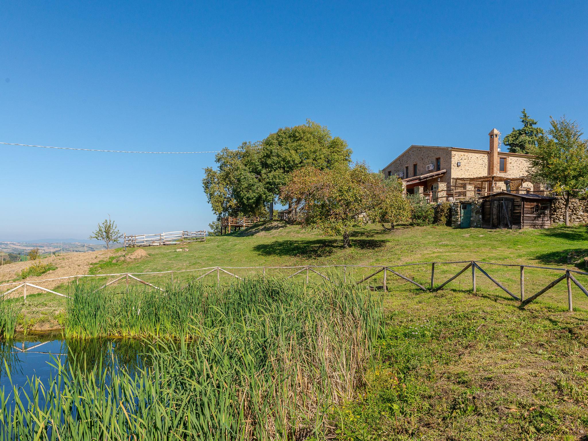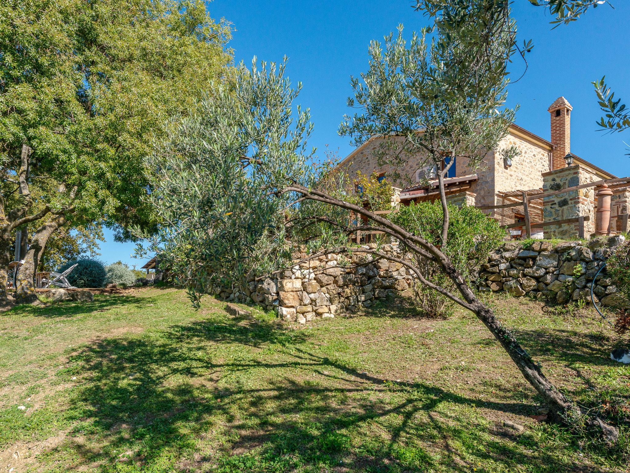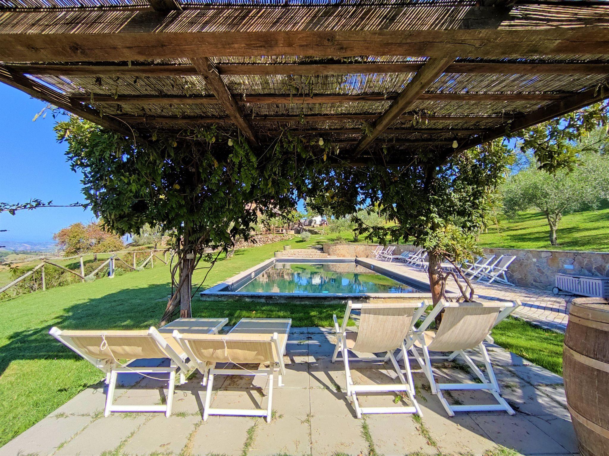 Very beautiful, cosy house "Meridiana", 2 storeys, detached, surrounded by meadows and vineyards. 4 km from the centre of Cana, 16 km from the centre of Roccalbegna, in a sunny position on top of a hill, 44 km from the sea, in the countryside. Private: property 2'000 m2, beautiful, well-kept terraced garden (not fenced) with lawn and trees, natural pond, swimming pool (14 x 7 m, depth 80 - 210 cm, seasonal availability: 15.Apr. - 15.Oct. pool opening hours: 07:00-22:00). Outdoor shower, pergola, pool maintenance by the owner/gardener. In the house: washing machine. Room cleaning on request (extra). Parking on the premises. Grocery 5 km, supermarket 25 km, shopping centre 32 km, restaurant 5 km, bar 5 km, bakery 5 km, bus stop 1.2 km, sandy beach "Marina di Grosseto" 44 km, thermal baths "Saturnia" 34 km. Nearby attractions: Grosseto 29 km, Campagnatico 23 km, Scansano 26 km, Monte Amiata 40 km, Pitigliano 47 km. Hiking paths: Riserva Naturale Pescinello 18 km, Riserva Naturale Bosco dei Rocconi 15 km, Parco Naturale della Maremma 43 km. Please note: car recommended. Object suitable for 8 adults + 2 children. Local sale of farm products.