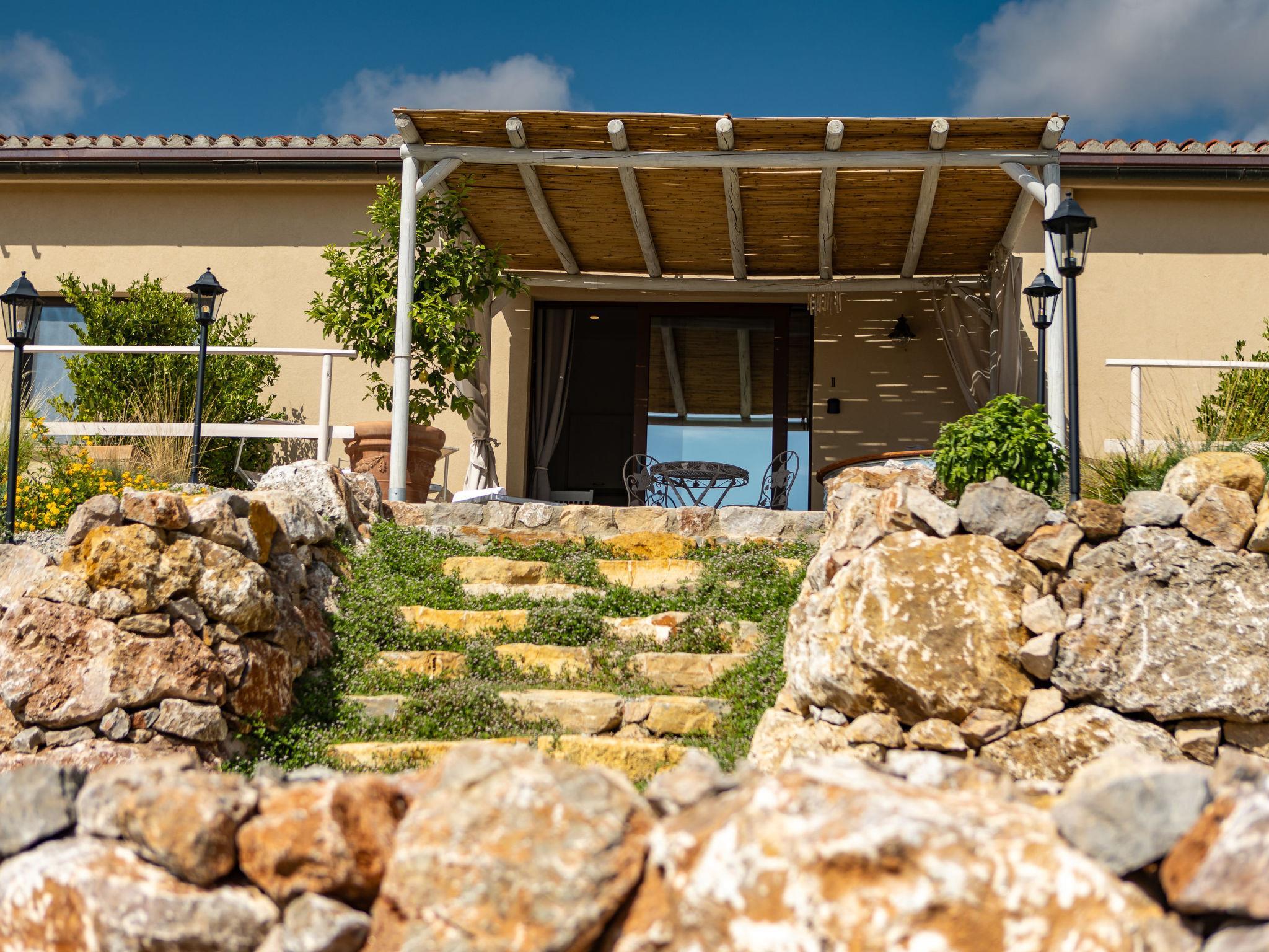 Agriturismo "Poggio Piero", renovated in 2025, surrounded by meadows and fields. 4 houses in the resort. 4 km from the centre of Ribolla, 5 km from the centre of Montemassi, in a quiet, sunny position on top of a hill, 30 km from the sea, 30 km from the beach, in the countryside. For shared use: park (fenced). Private: swimming pool (above ground) round (1,5 m diameter, depth 60 cm, seasonal availability: 01.May. - 15.Oct.). Garden furniture, pool maintenance by the owner/gardener. Breakfast possible on request (extra). Parking on the premises. Grocery 4 km, supermarket 4 km, restaurant 4 km, bar 4 km, bus stop 1.5 km. Please note: car recommended. The owner lives on the same property.