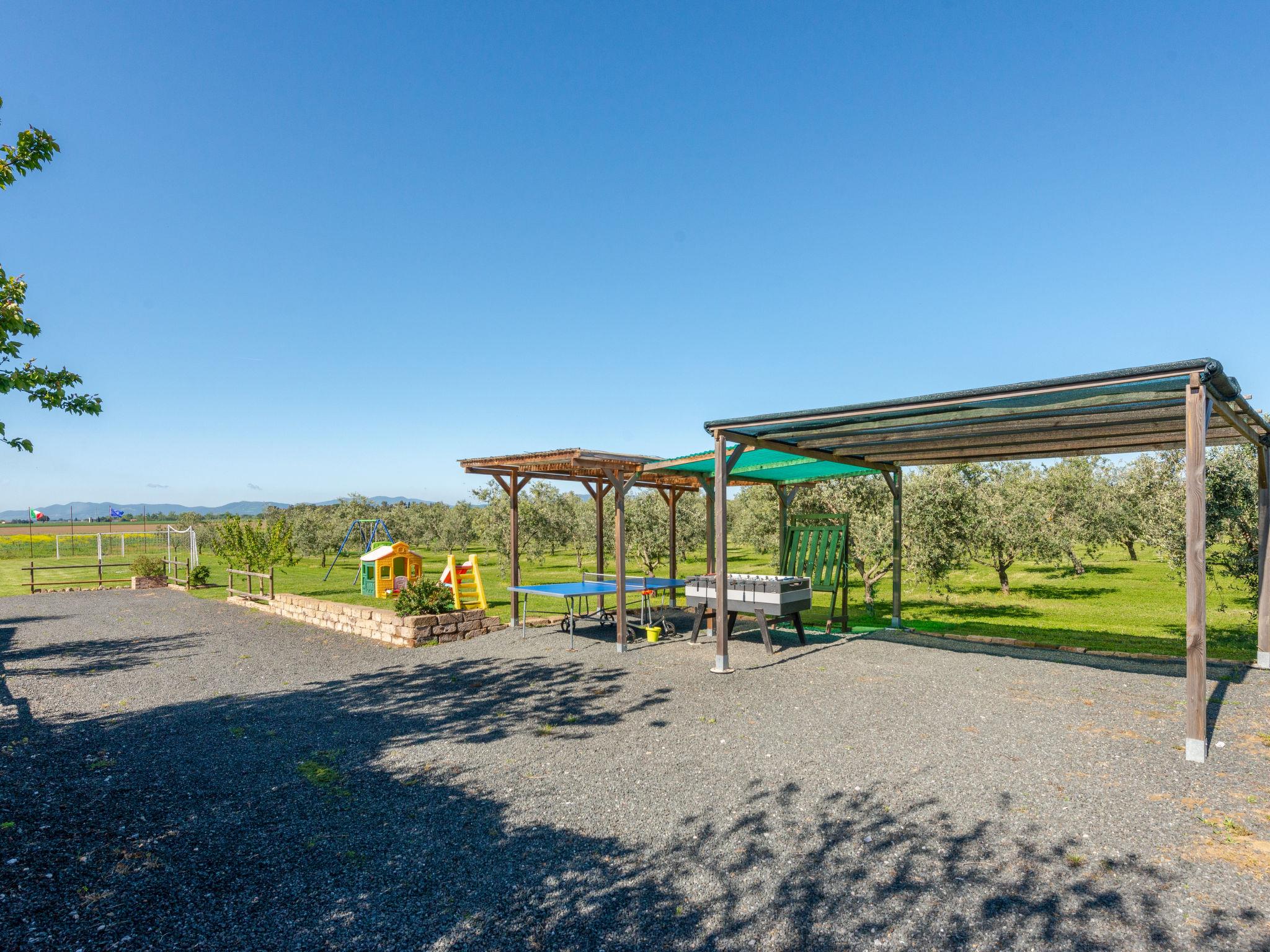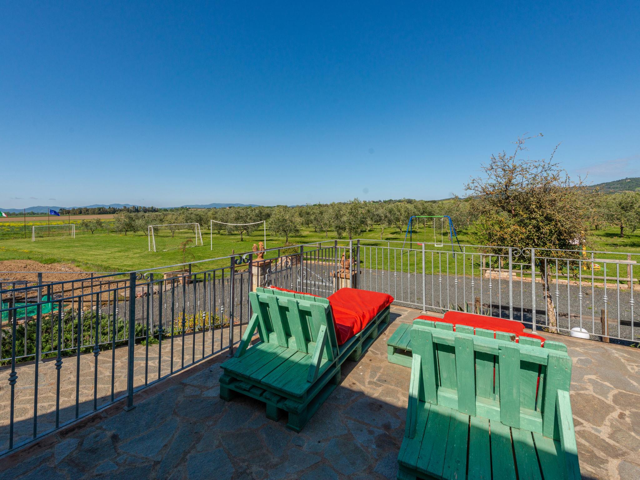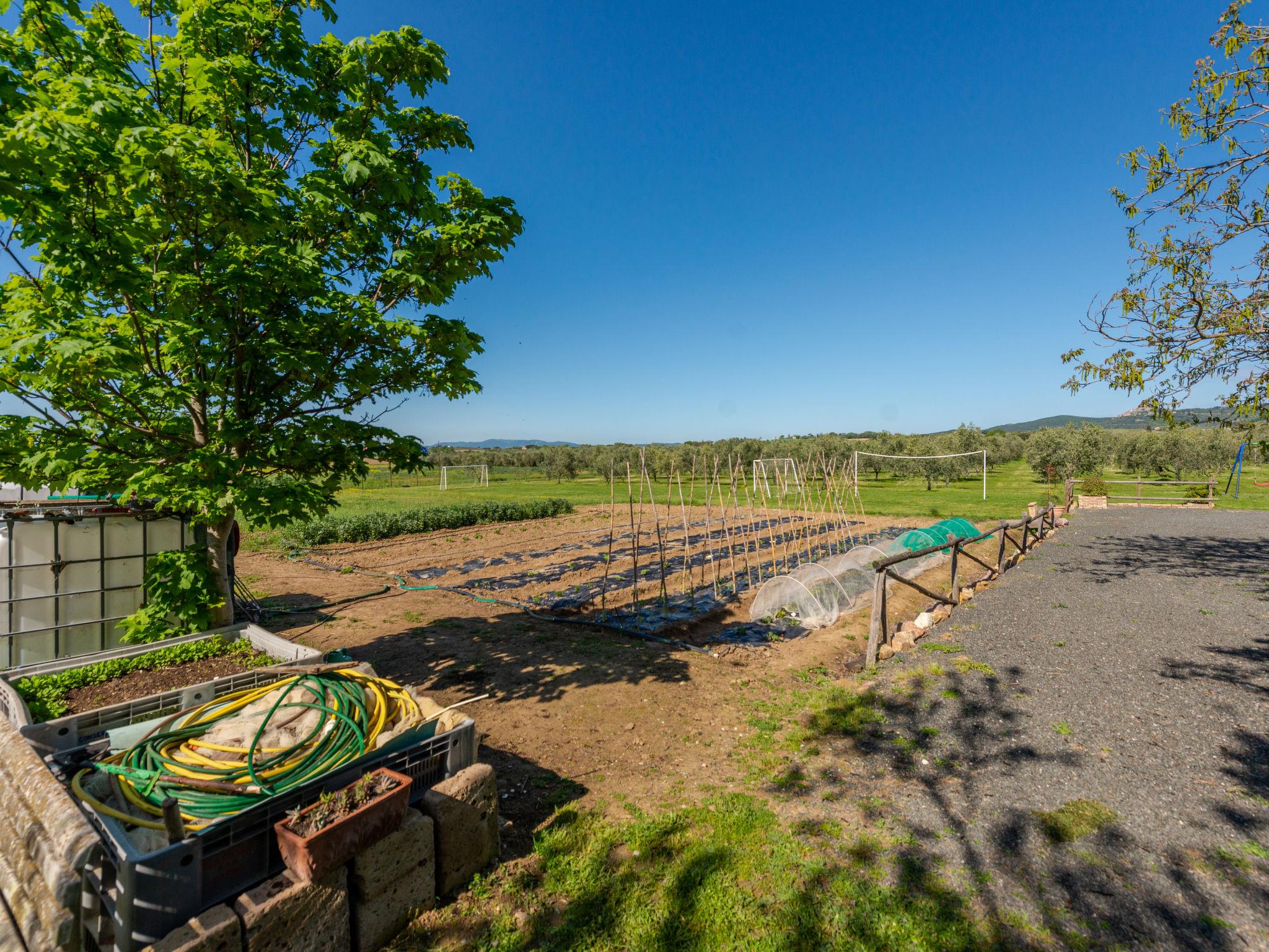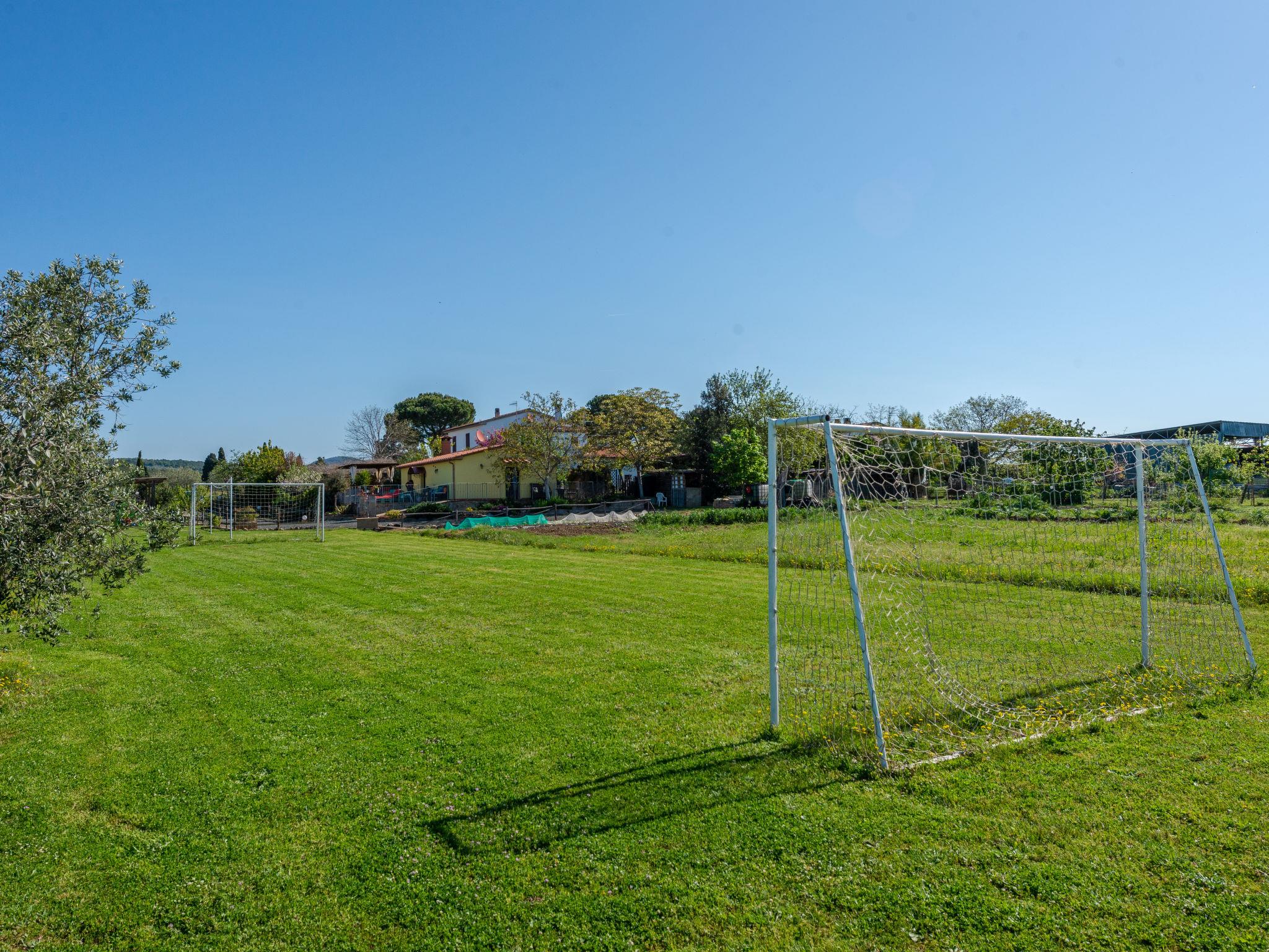 Beautiful country house "Bellosguardo", surrounded by trees and fields. 9 km from the centre of Roccastrada, 5 km from the centre of Montemassi, 35 km from the centre of Follonica, 35 km from the sea. For shared use: property 10 ha, orchard, swimming pool fenced (5 x 3 m, depth 120 cm, seasonal availability: 15.May. - 30.Sep.). Private: table tennis, volleyball court (swing). In the house: table football, heating available only from 12.Oct. - 26.Apr.. Parking on the premises. Shop 5 km, bus stop 500 m, railway station "Montepescali" 15 km, sandy beach 35 km. Golf course (18 hole) 26 km. Nearby attractions: Grosseto 28 km. Hiking paths: Mountain-bike 4 km. On the estate animal husbandry. Local sale of farm products. Please note: the owner lives on the same property. The owner has a dog.