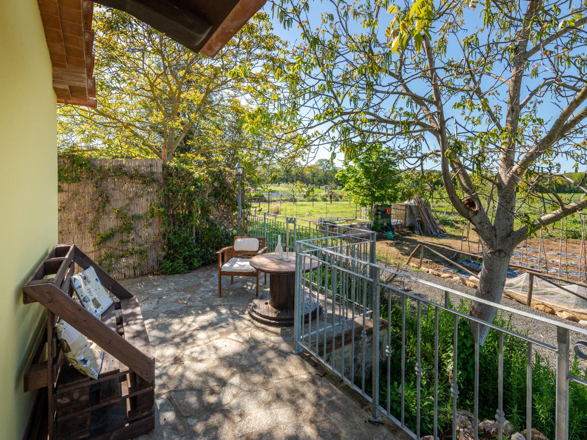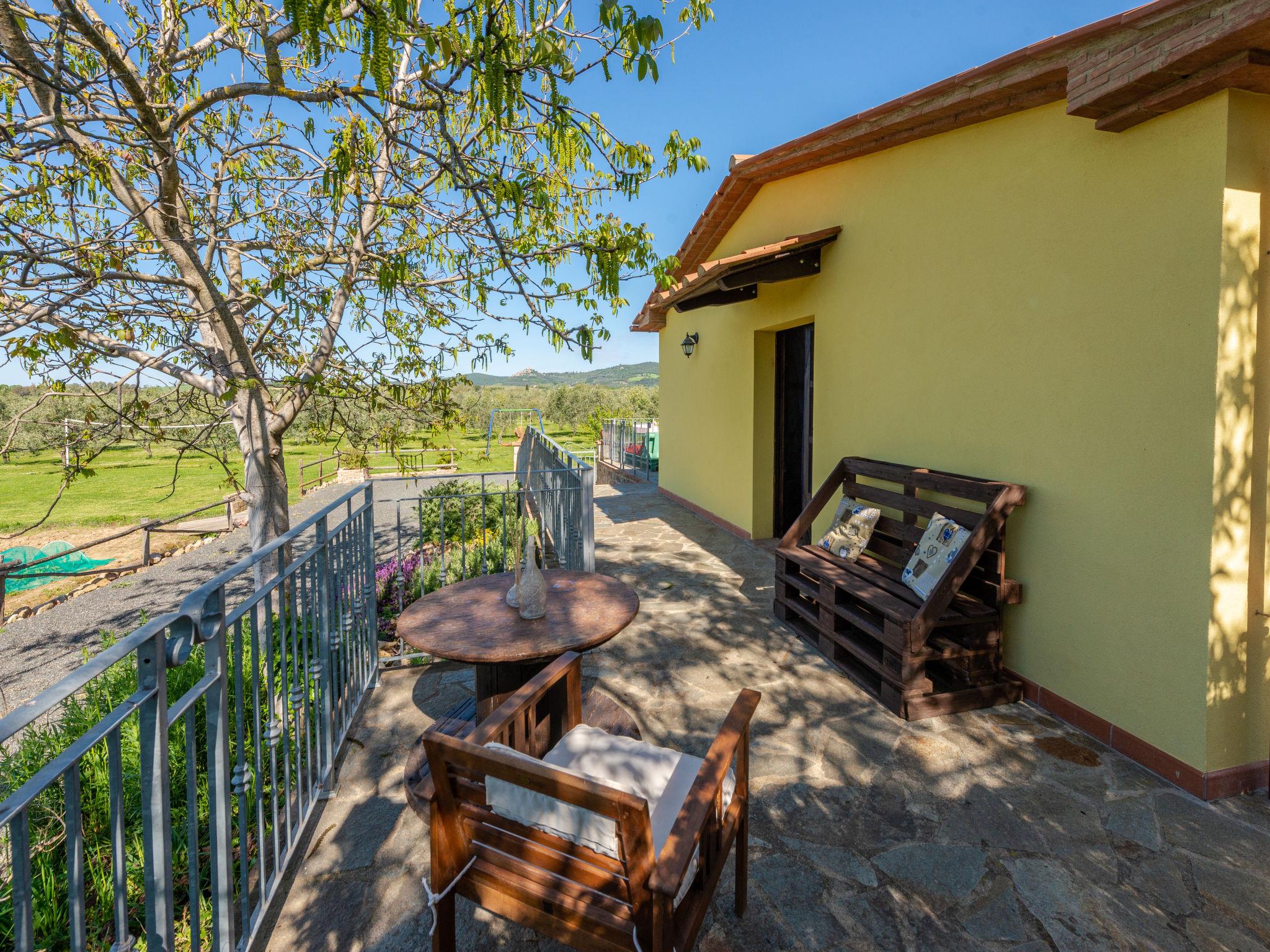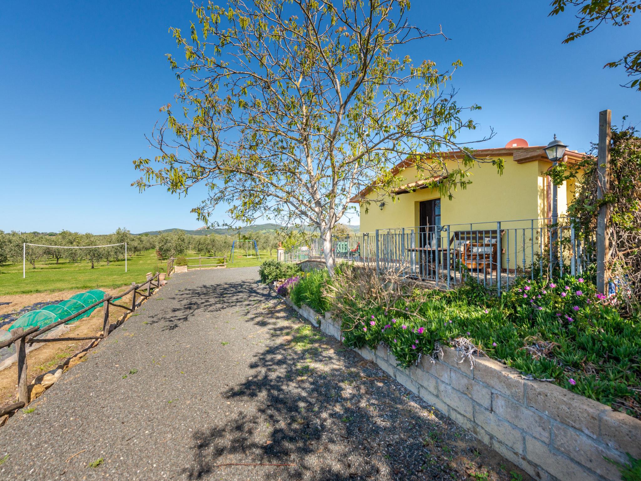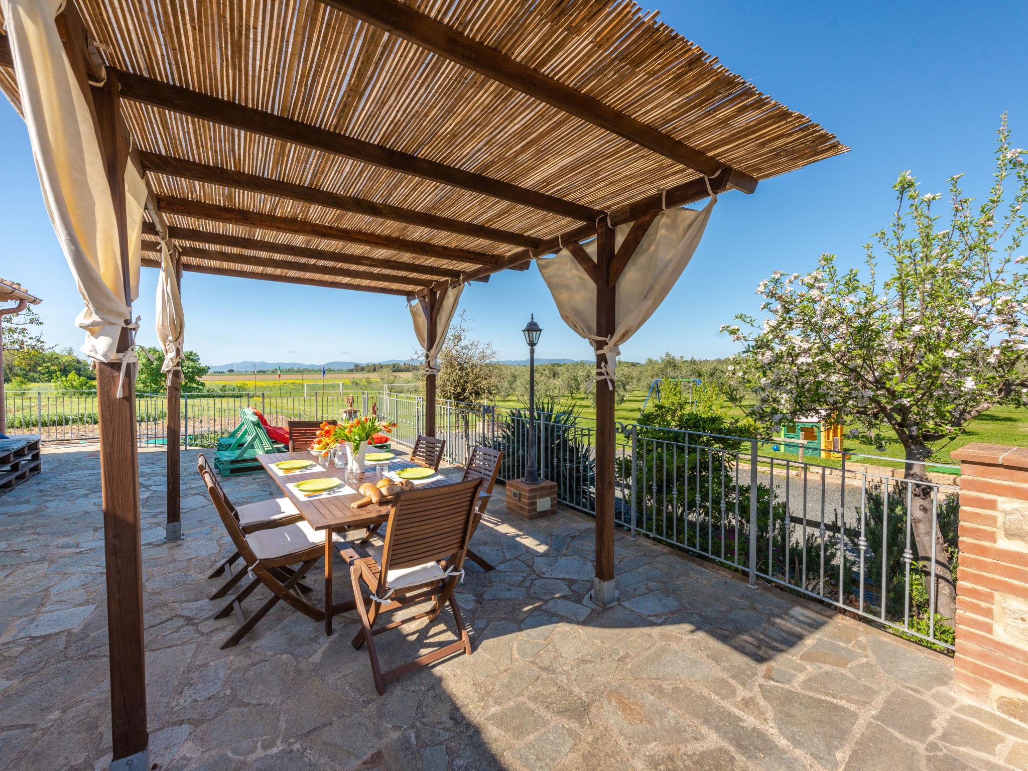 Beautiful country house "Bellosguardo", surrounded by trees and fields. 9 km from the centre of Roccastrada, 5 km from the centre of Montemassi, 35 km from the centre of Follonica, 35 km from the sea. For shared use: property 10 ha, orchard, swimming pool fenced (5 x 3 m, depth 120 cm, seasonal availability: 15.May. - 30.Sep.). Private: table tennis, volleyball court (swing). In the house: table football, heating available only from 12.Oct. - 26.Apr.. Parking on the premises. Shop 5 km, bus stop 500 m, railway station "Montepescali" 15 km, sandy beach 35 km. Golf course (18 hole) 26 km. Nearby attractions: Grosseto 28 km. Hiking paths: Mountain-bike 4 km. On the estate animal husbandry. Local sale of farm products. Please note: the owner lives on the same property. The owner has a dog.