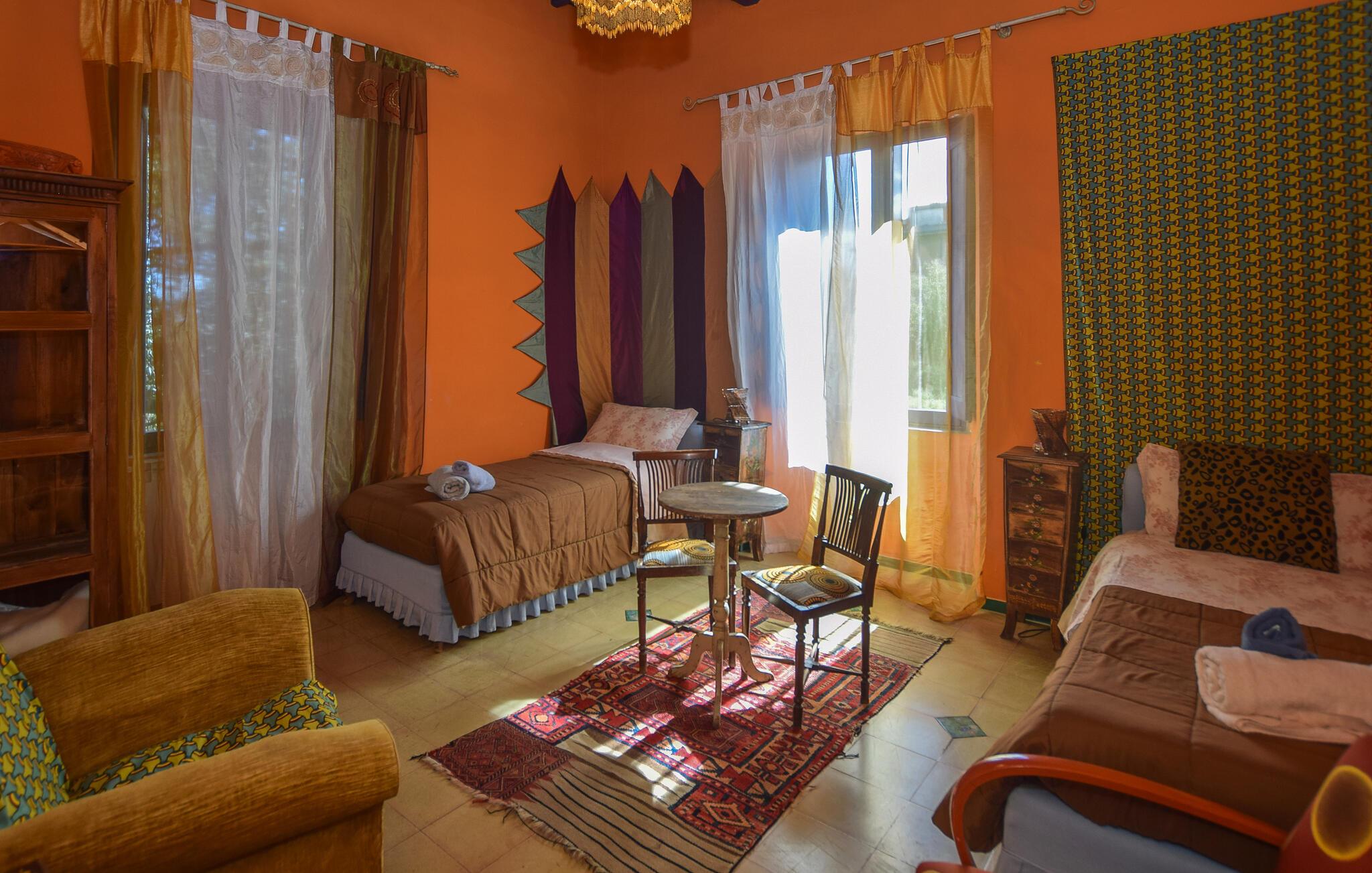 Velkommen til det idylliske, statelige hus med historie, hvor I kan slappe af i en hyggelig atmosfære. Nyd tiden sammen i charmerende værelser med gamle træhjørner, smukke klinkegulve og middelhavsfarver. Efter et godt måltid kan I finde jer tilpas i den rummelige stue om aftenen, tænde bålet i pejsen og snakke længe om dagens oplevelser.