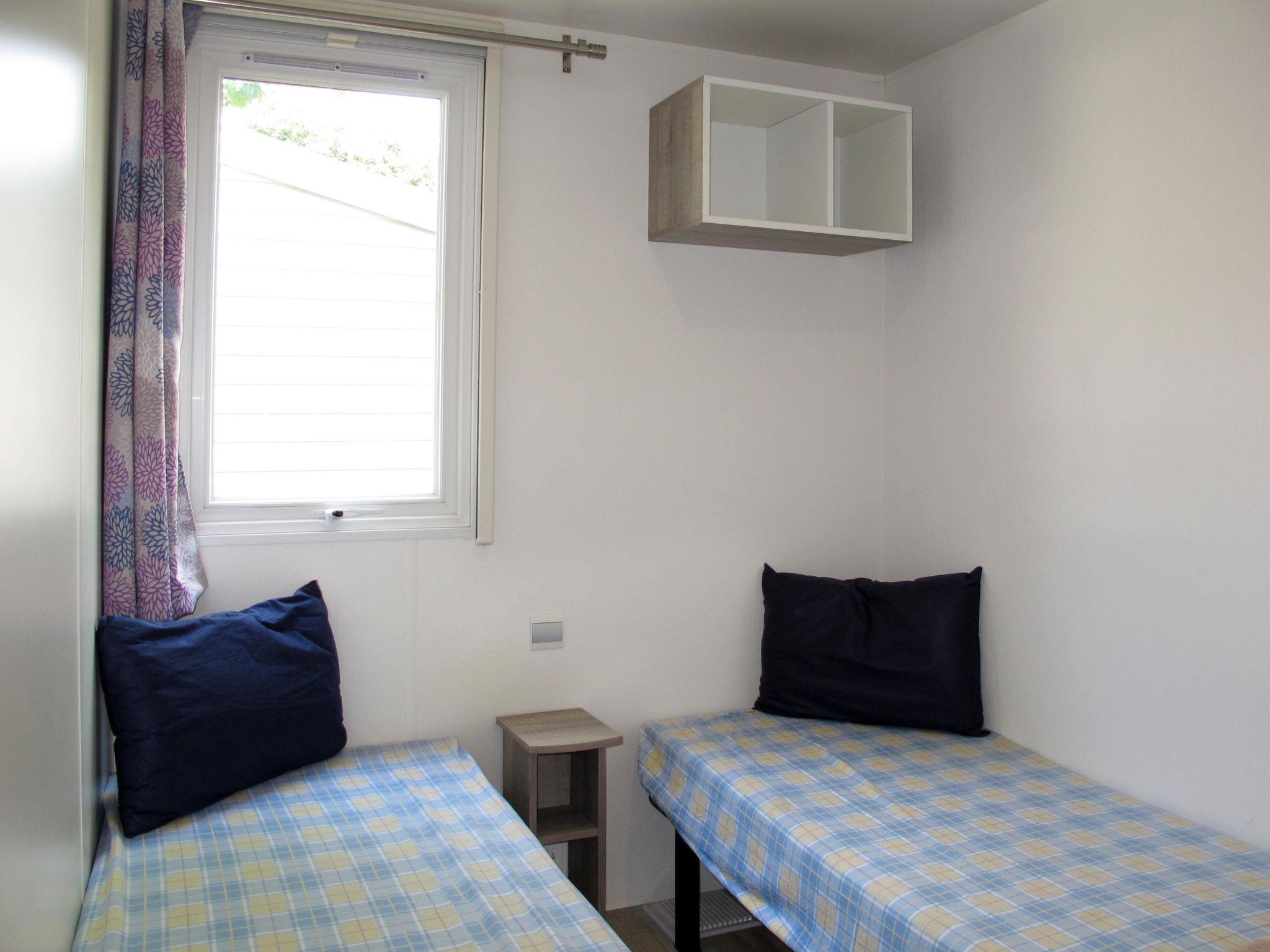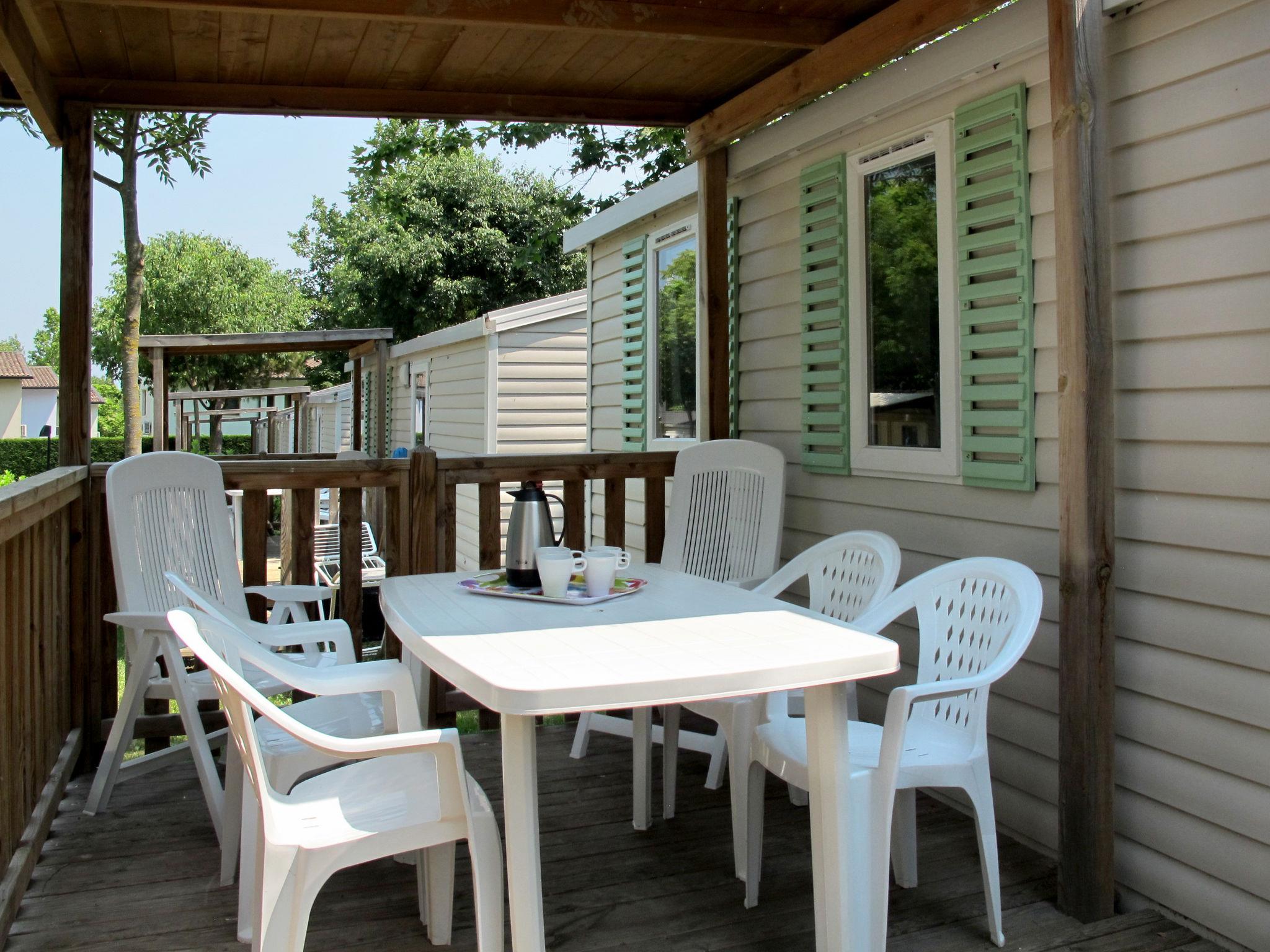 "Happy Premium", 4-room mobile home 30 m2. Comfortable furnishings: living/sleeping room with dining table, electric heating and air conditioning. 1 room with 1 french bed (140 cm, length 190 cm). 2 rooms, each room with 2 beds (70 cm, length 190 cm). Open kitchen (4 hot plates, microwave, freezer, electric coffee machine). Shower/WC. Air-conditioning (extra). Terrace partly roofed. Terrace furniture, electric barbecue (portable), deck chairs (2). Facilities: mosquito net. Parking (1 car). Please note: non-smokers only. Maximum 1 small pet/ dog allowed. IT029040B14KOQCKTE