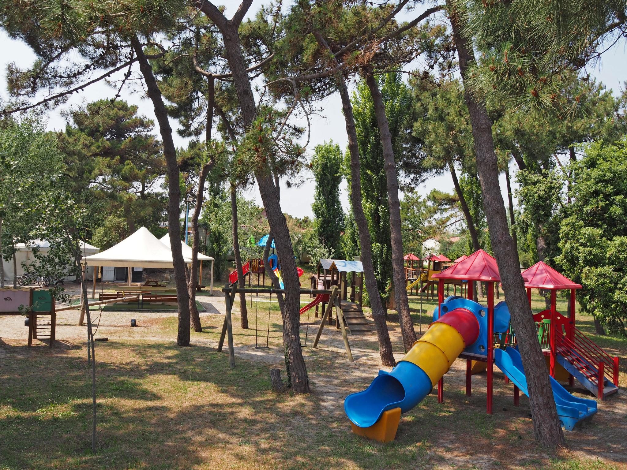 Large, child friendly holiday village "Rosapineta Sud". 260 houses in the resort. 400 m from the centre of Rosolina Mare, 22 km from the centre of Chioggia, 70 km from the centre of Venezia, 100 m from the sea, 100 m from the beach, direct access to the beach. For shared use: property 6 ha (fenced) with plants and trees, 2 swimming pools (25 x 11 m, 250 m2, seasonal availability: 23.May. - 12.Sep.). Children's pool, slide, outdoor shower, hot tub, table tennis, beach volleyball, barbecue, children's playground. In the complex: reception, restaurant, WiFi, fitness room, table tennis, shopping facilities, kiosk, washing machine (for shared use, extra), bicycle rental. Half board possible (extra). Parking at the house on the premises. E-charging station. Supermarket 50 m, bus stop "Rosolina" 10 km. Golf course (18 hole) 27 km. Nearby attractions: Giardino Botanico di Porto Caleri 5 km, Parco Naturale 'Delta del Po', Venezia 70 km. Please note: entertainment. Suitable for families. Obligation to wear bathing caps. Beach service: 2 sun loungers and 1 parasol per bungalow/mobile home are available on the beach throughout the season.