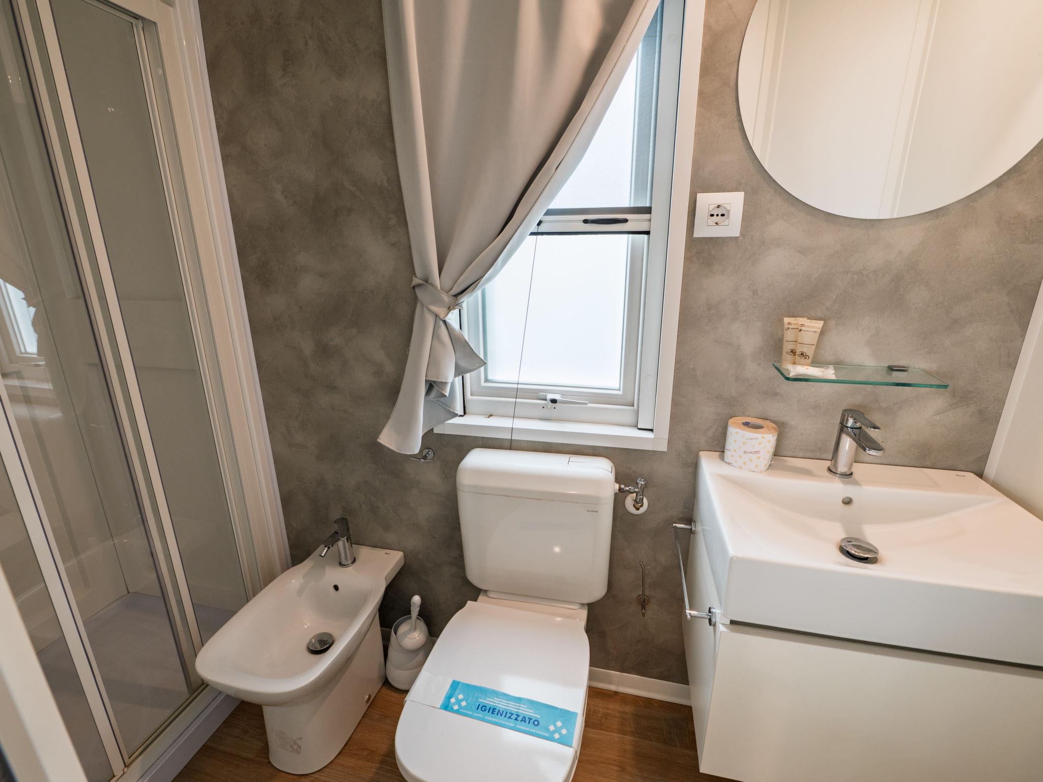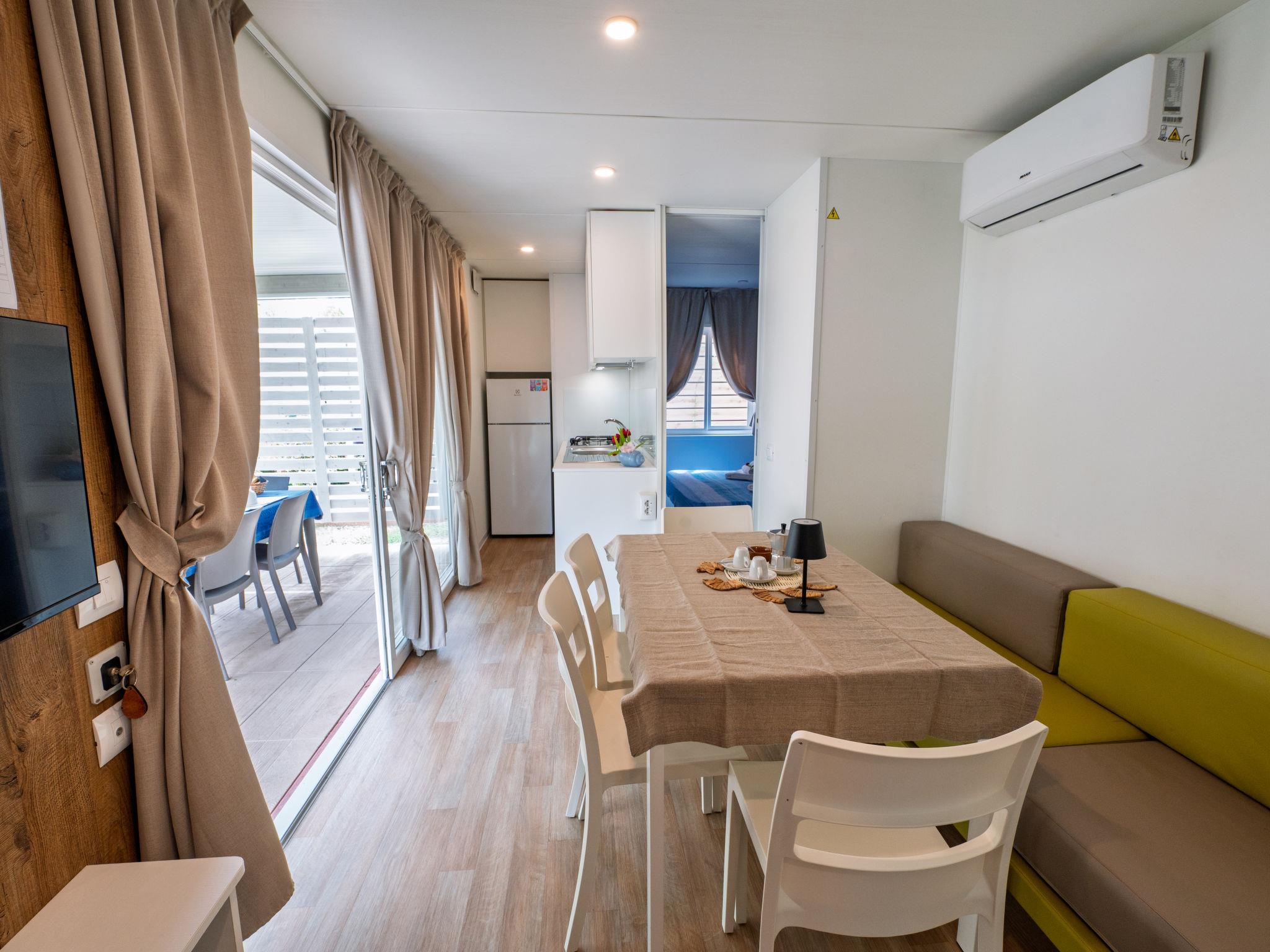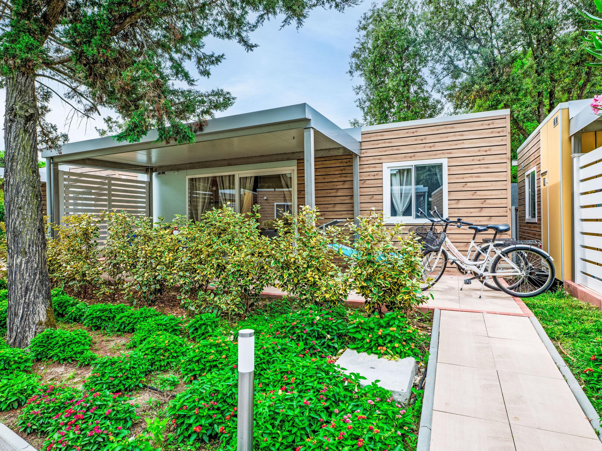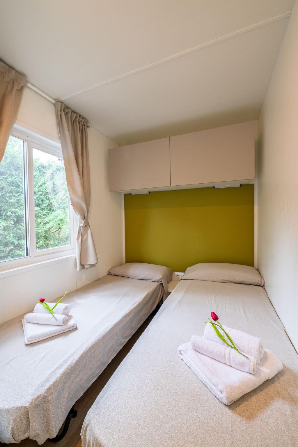 4-room mobile home 34 m2. Bright, modern furnishings: living/dining room with satellite TV. Exit to the terrace. 1 double bedroom with separate WC. 2 rooms, each room with 2 beds (70 cm, length 190 cm). Kitchenette (dishwasher, Gas stove, 4 gas rings, microwave, freezer) with satellite TV. Shower/bidet/WC, sep. WC. Air-conditioning, forced-air heating. Terrace 14 m2, roofed. Terrace furniture. Facilities: baby cot (extra). Internet (WiFi, free). Parking (1 car). Beach service: 4 deck-chairs and 2 parasols per mobile home are available on the beach throughout the season. IT029040B25Y8X5F8K