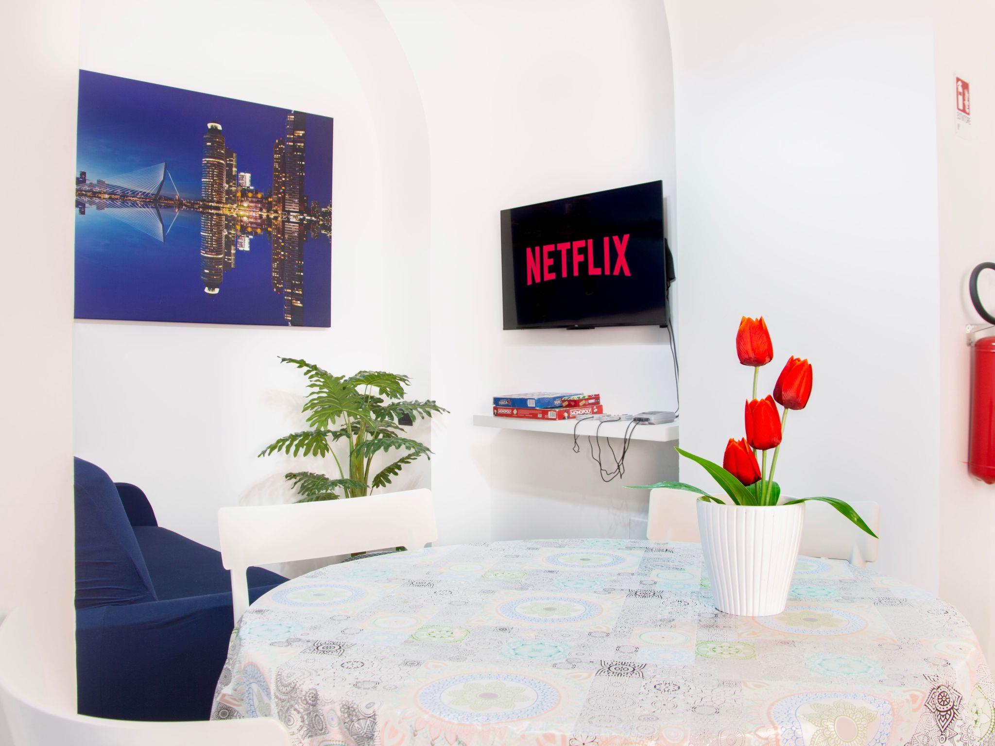 In the living room/kitchen you will find a comfortable double sofa bed, a 43' 4K smart TV, a game console and air conditioning.