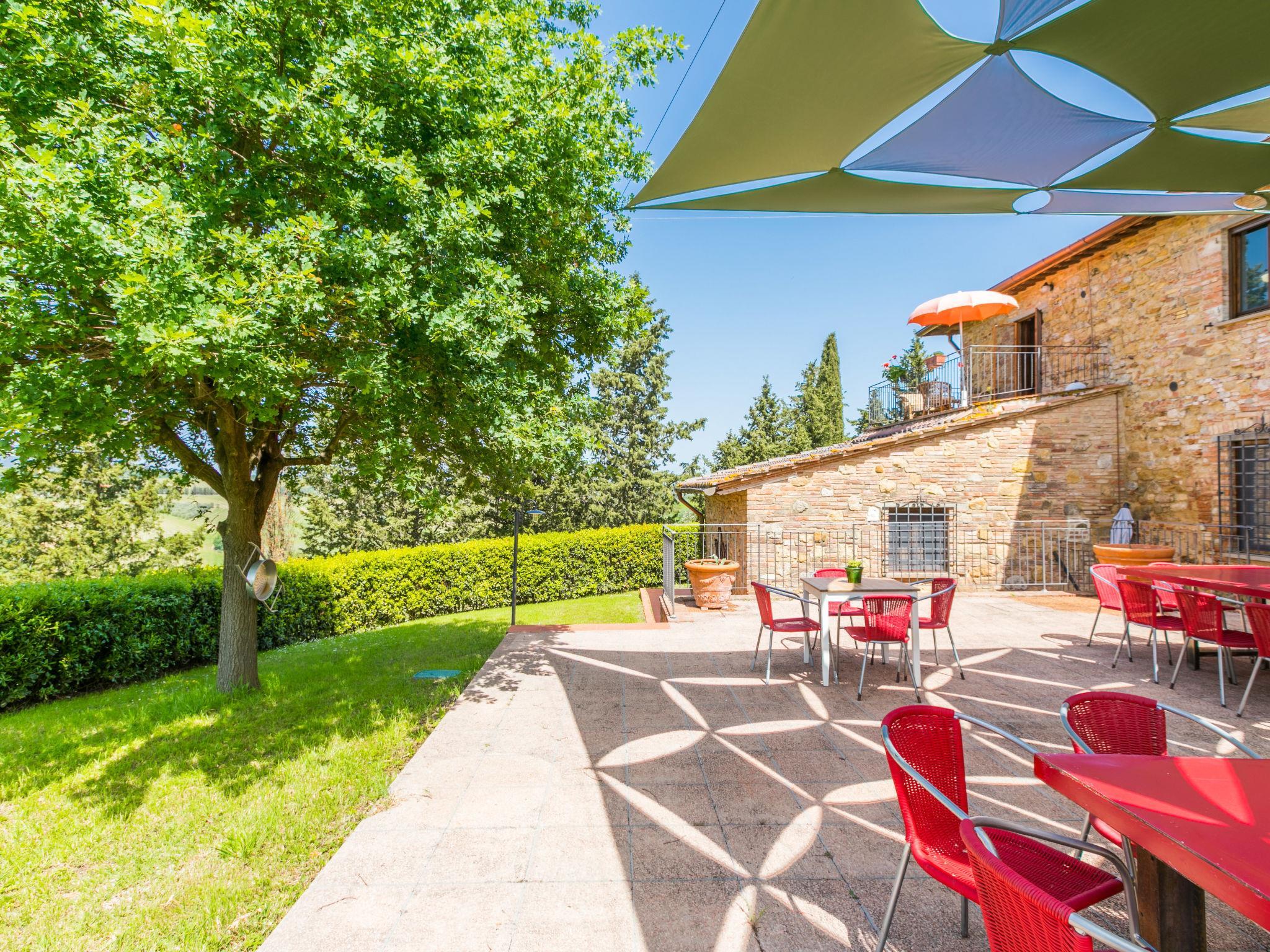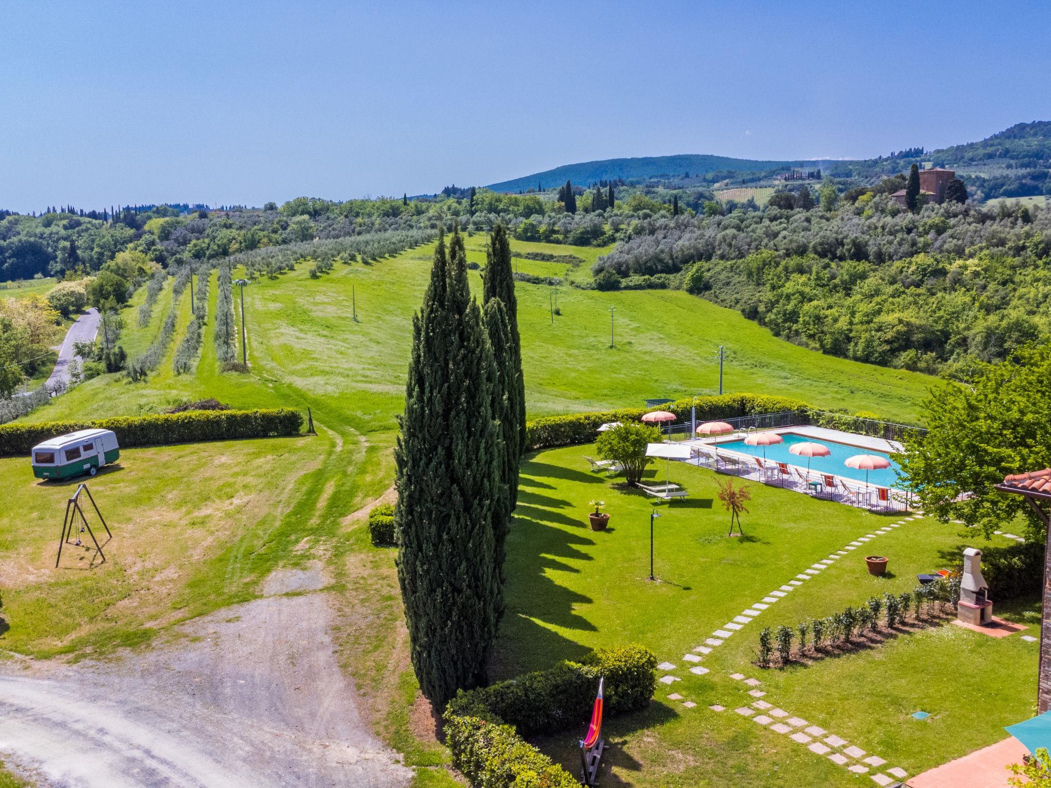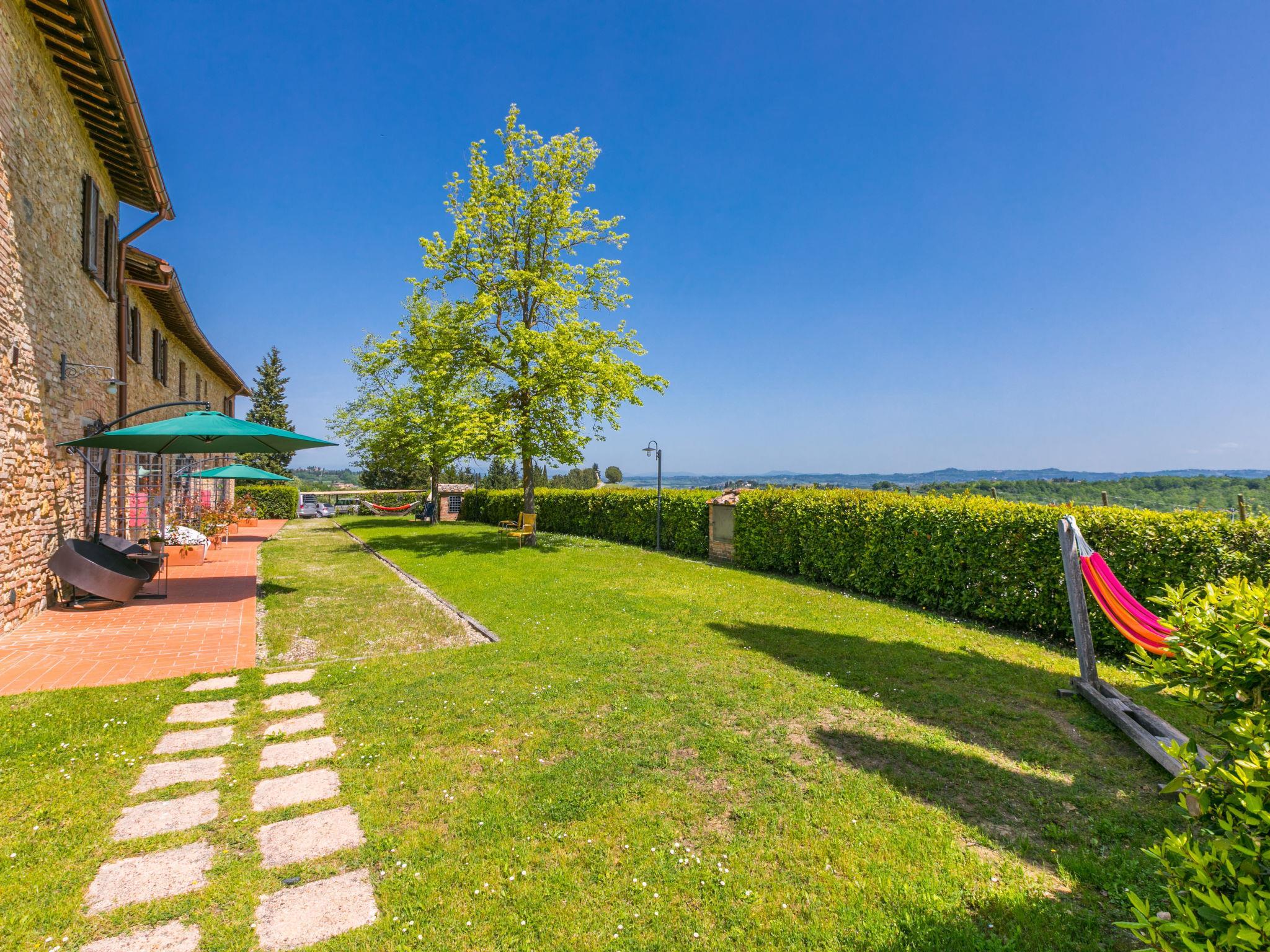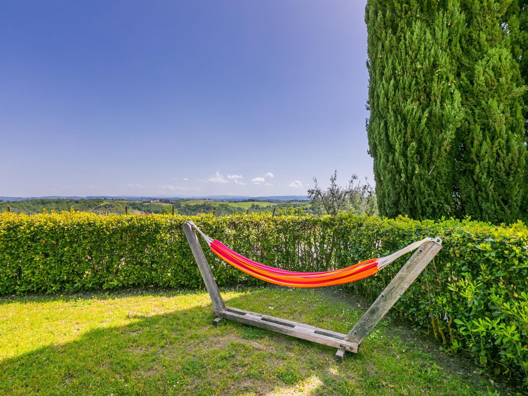 Beautiful, cosy on a vinyard country house "Casa Renai a San Gimignano", surrounded by trees, fields and vineyards. 8 apartments in the property. 7 km from the centre of San Gimignano, 4 km from the centre of Certaldo, 45 km from the centre of Siena, in a secluded, sunny, elevated position, 85 km from the sea, in the countryside. For shared use: property, garden 1 ha with plants and trees, meadow, swimming pool fenced (14 x 7 m, depth 120 - 220 cm, seasonal availability: 01.May. - 15.Oct.). Outdoor shower, terrace, garden furniture, barbecue (swing), pool maintenance by the owner/gardener. In the complex: reception, bar, internet access, WiFi, bicycle rental. Linen change (suppl. charge extra). Room cleaning 3 times per week (included). Cook on request (extra). Breakfast possible on request (extra). Motor access (300 m via unmade road). Roofed, parking on the premises. Shop 3 km, grocery 3 km, supermarket 4 km, restaurant 4 km, bakery 3 km, bicycle rental 4 km, bus stop 300 m, railway station "Certaldo" 4 km, indoor swimming pool 4 km. Tennis 4 km, walking paths from the house 100 m. Nearby attractions: Volterra 30 km, Pisa 65 km, Firenze 65 km, Montalcino 80 km. Please note: baby equipment (included). Suitable for events. Cooking courses bookable on request. Local sale of farm products. All houses/apartments are individually designed/furnished.