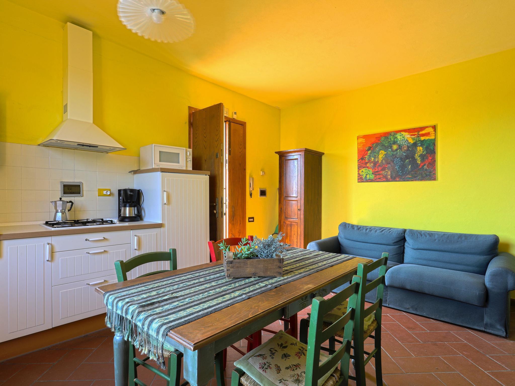 "Casa alle Vacche", 3-room apartment 70 m2 on 1st floor. Practical and rustic furnishings: living/sleeping room with 1 sofabed and open-hearth fireplace (only for decoration), dining table, TV and air conditioning. Exit to the terrace. 1 double bedroom with air conditioning. 1 room with 2 beds and air conditioning. Kitchenette (4 gas rings, electric coffee machine, combination microwave). Shower/bidet/WC. Oil heating (extra), air-conditioning (extra). Natural stone floors. Terrace. Terrace furniture, barbecue, deck chairs. Very beautiful view of the countryside. Facilities: children's high chair, baby cot for up to 2 year olds. Internet (WiFi, free). Parking at the house. Please note: non-smokers only. Maximum 2 pets/ dogs allowed. Private entrance. IT052028B5CUFQ2GAP