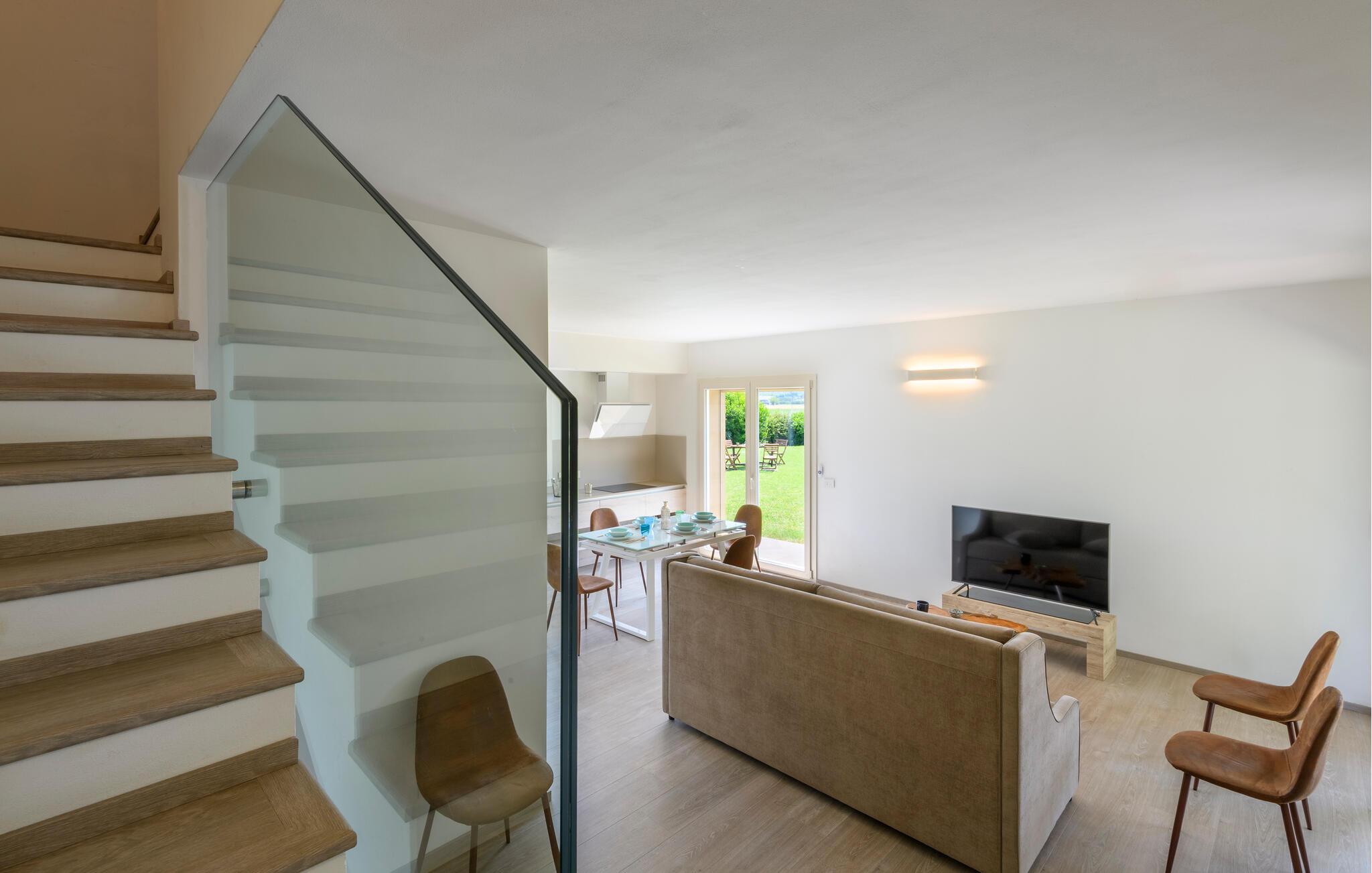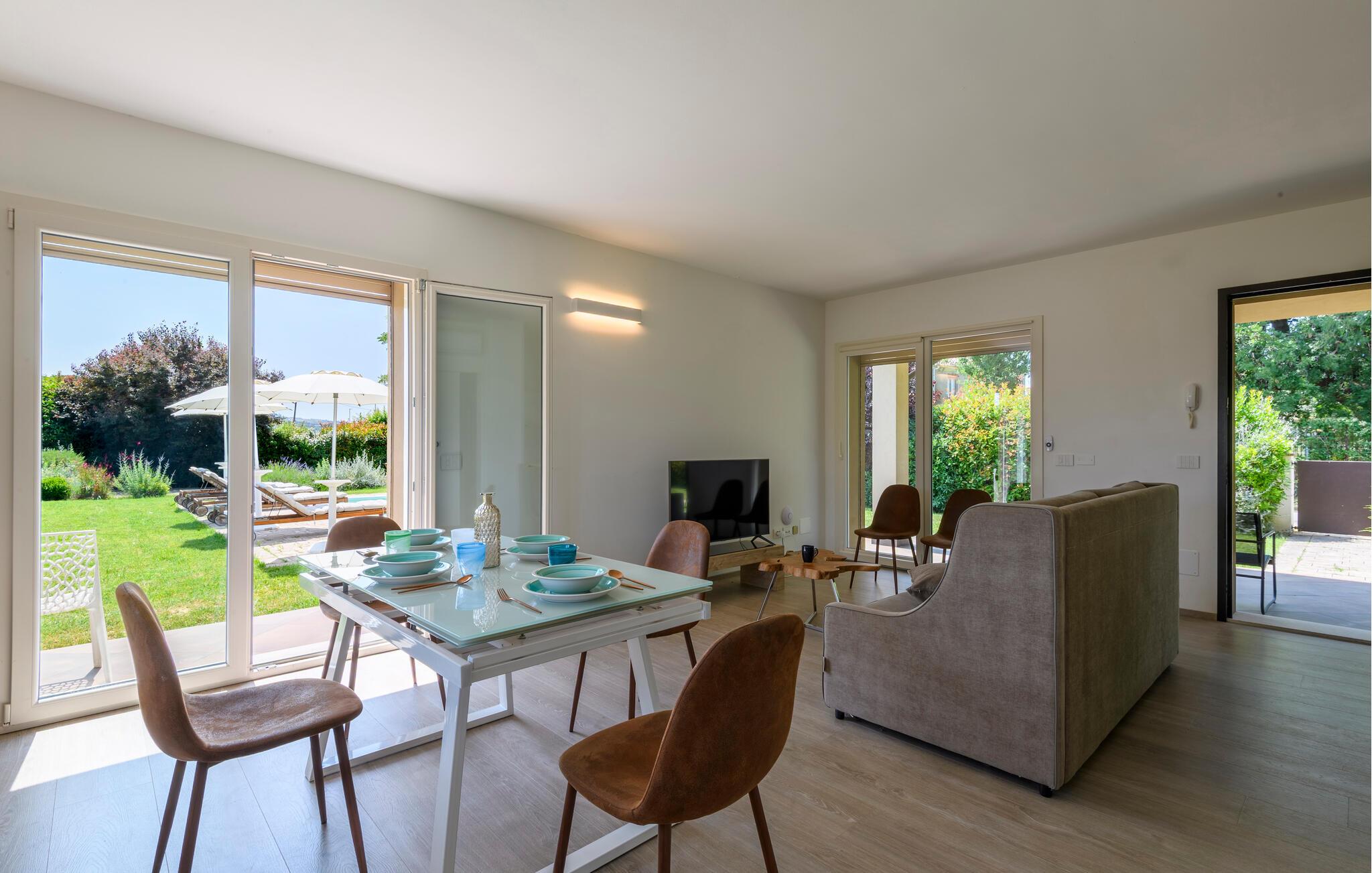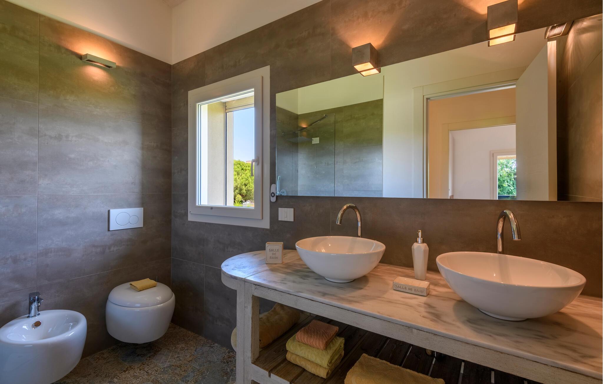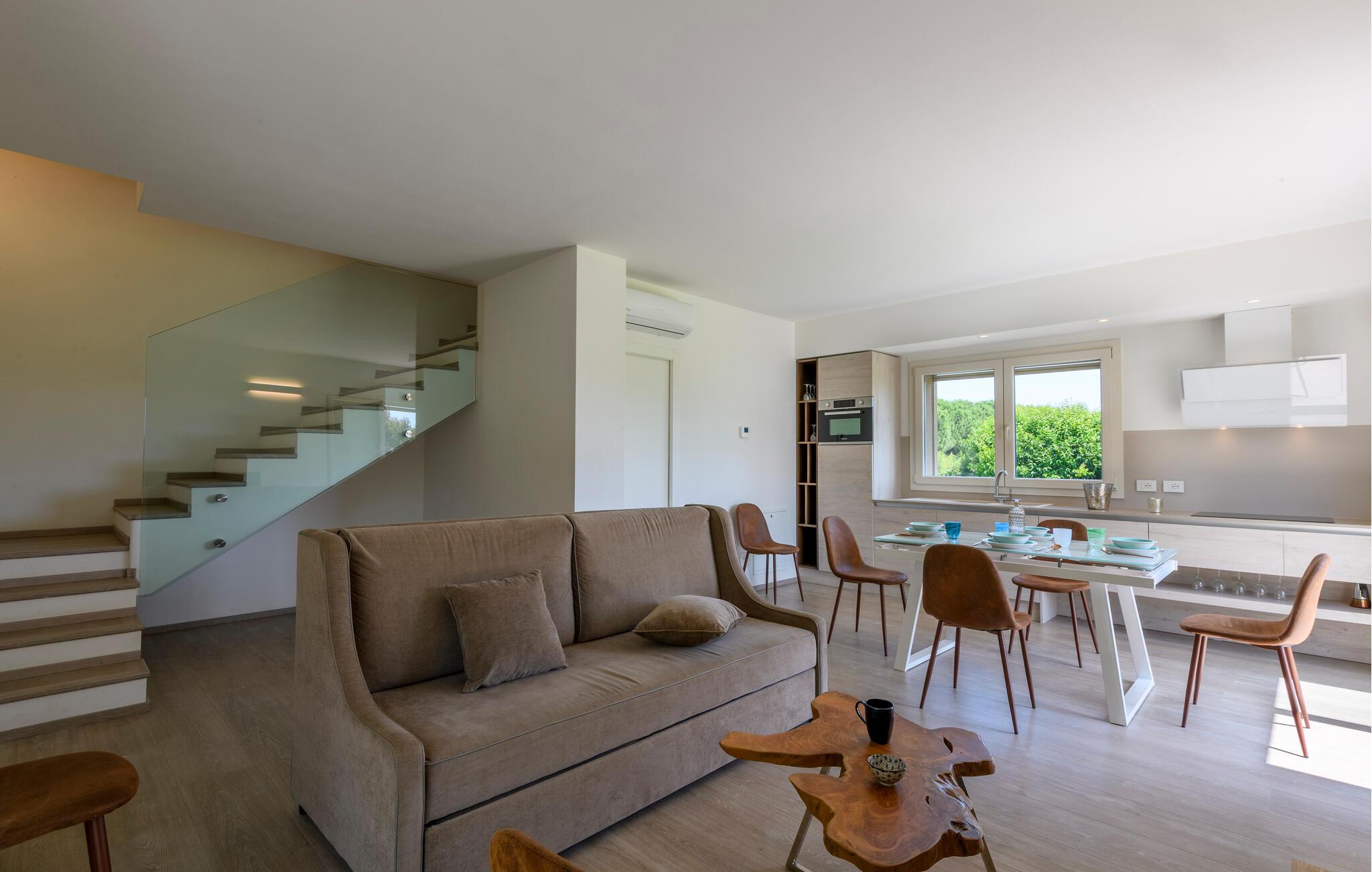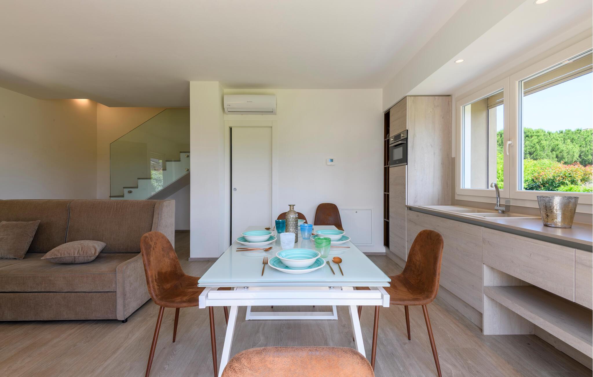 Glæd jer til maksimal komfort i dette rummelige feriehus, som er ideelt til flere familier eller en større gruppe, samtidig med at det giver mulighed for privatliv og fælles oplevelser. Oplev de tre separate og uafhængige boliger. Hver enhed har sit eget køkken og stilfulde opholdsstue, så I kan bevare jeres uafhængighed, mens I stadig bruger tid sammen. Den moderne stil og møbler af høj kvalitet sikrer en behagelig atmosfære.