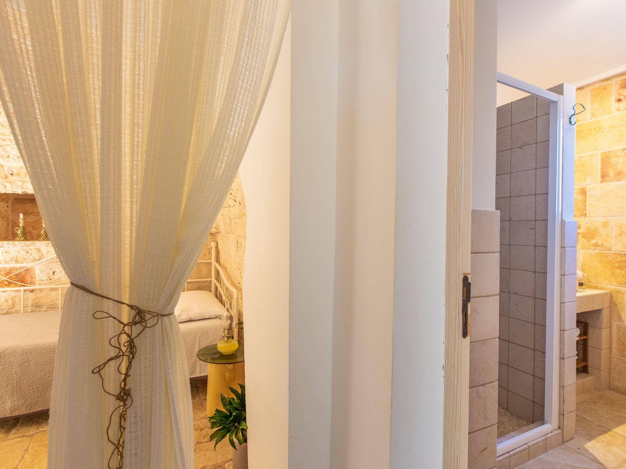 The living-dining room is air-conditioned, has a fully equipped kitchen and direct access to the garden. Three beds are placed in the niches of the trullo, one double and two singles. A bathroom with shower and a second outdoor shower as an after-beach.