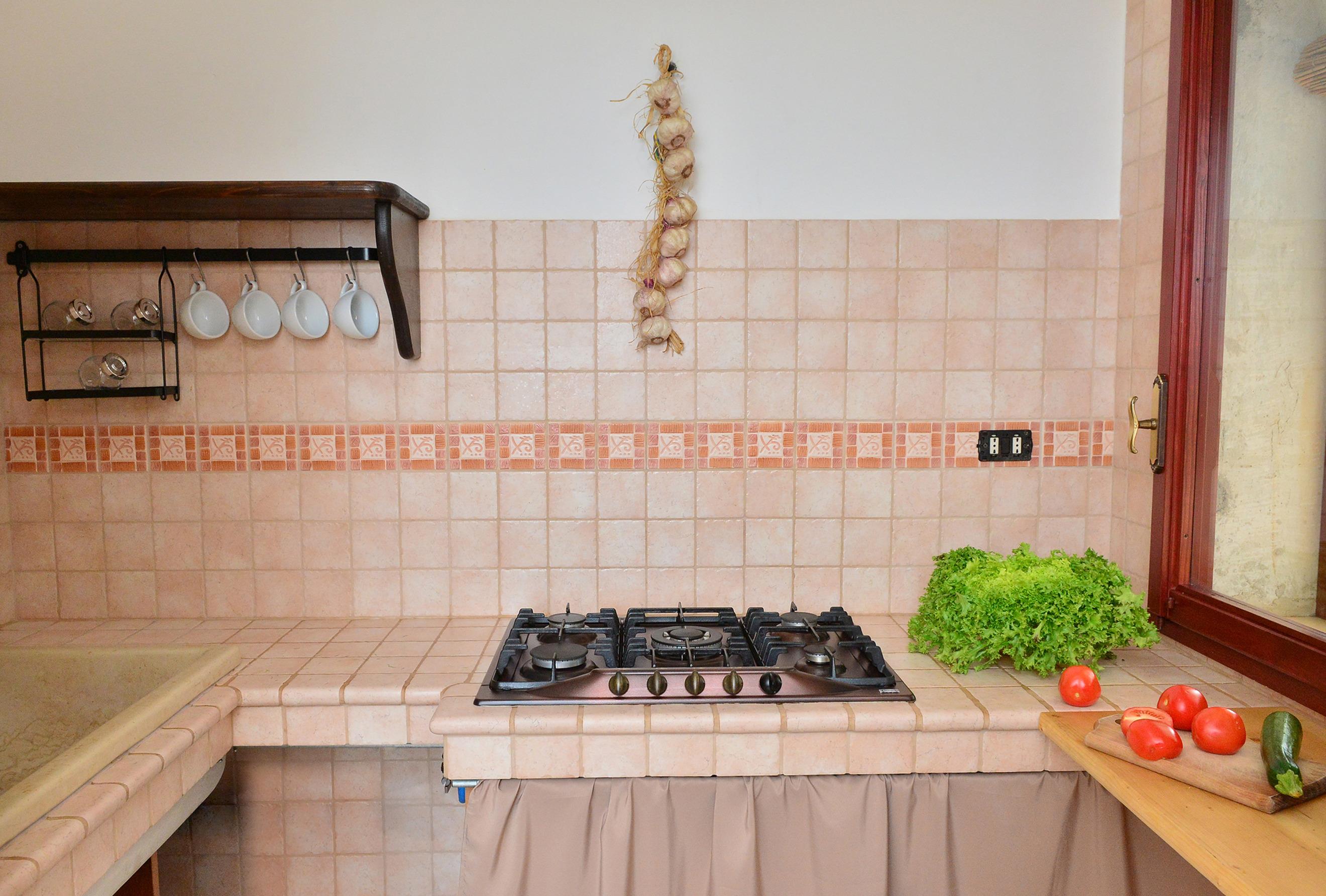 Hier dominiert ein Dach mit ´’ botte ’Gewölben, ein großer Kamin, ein Erkerfenster, das Zugang zu zwei Veranden bietet. Die Küchenzeile ist aus Mauerwerk und bietet ein Fenster zum Garten.
