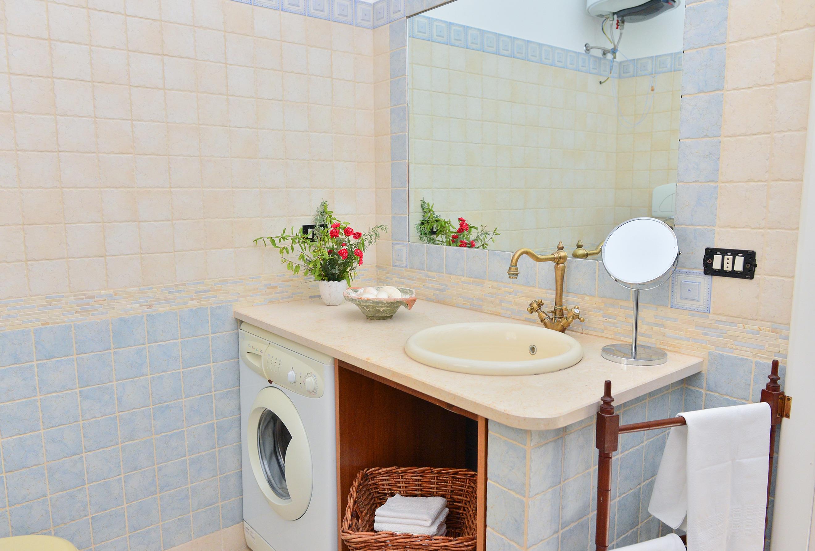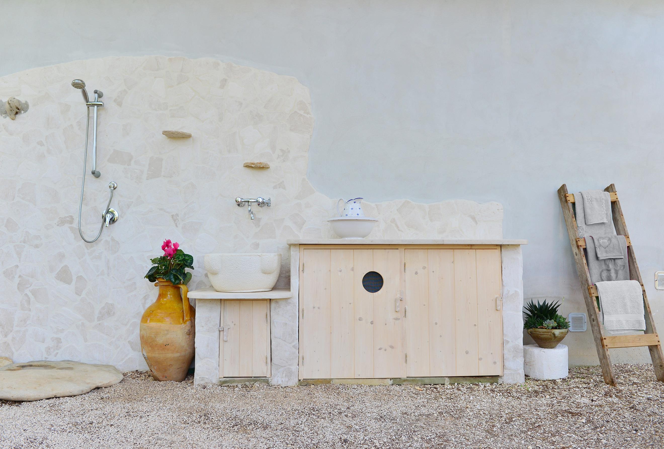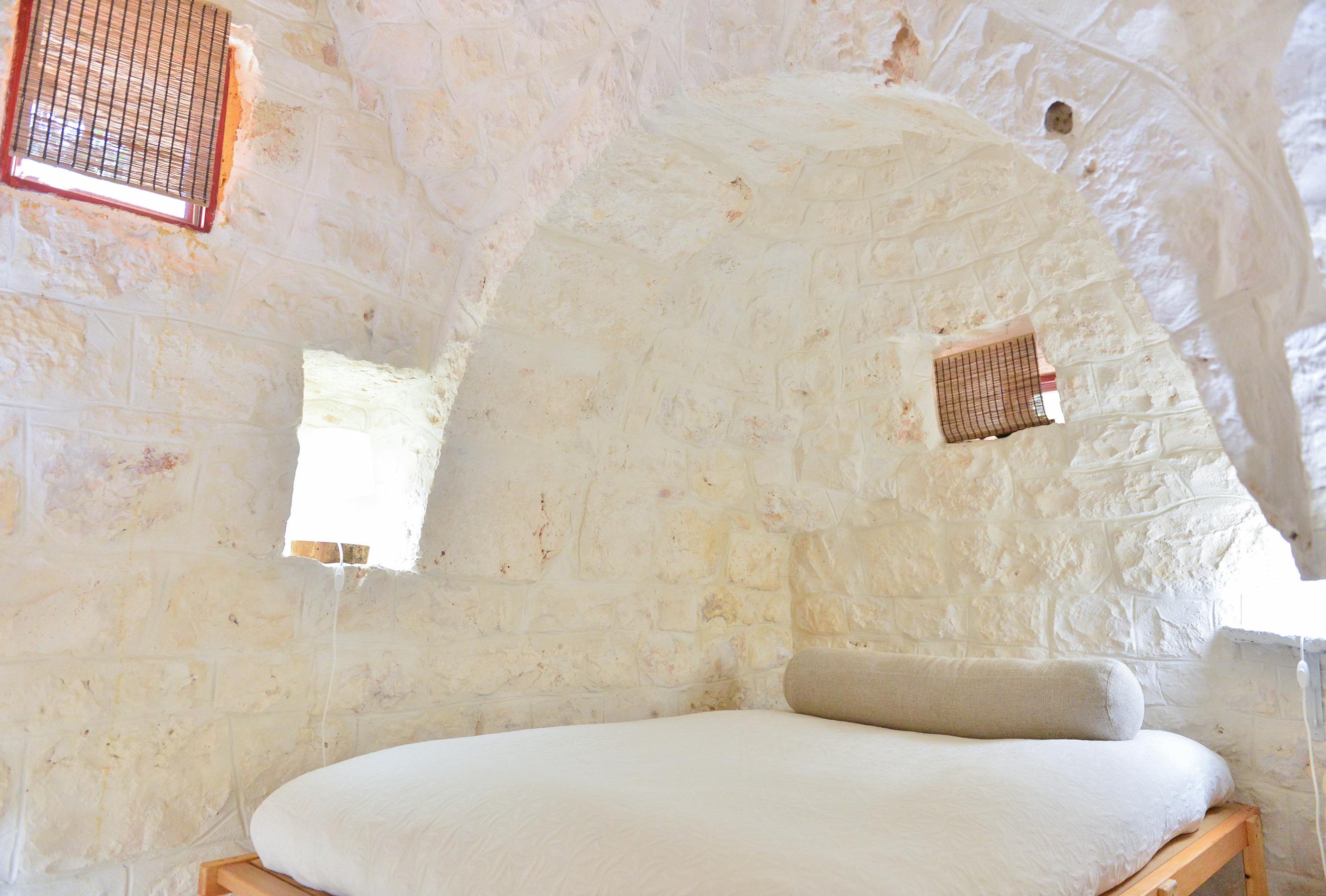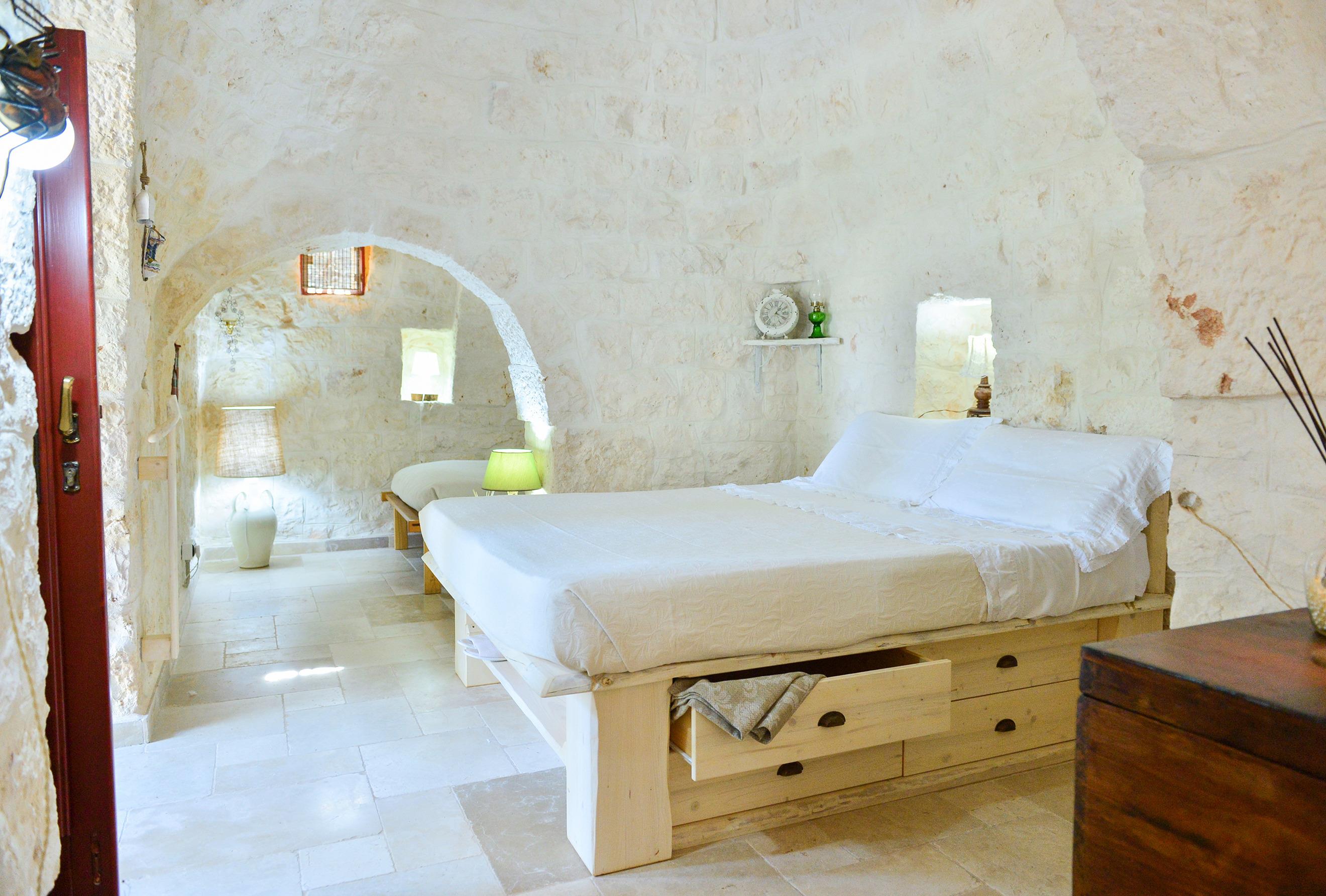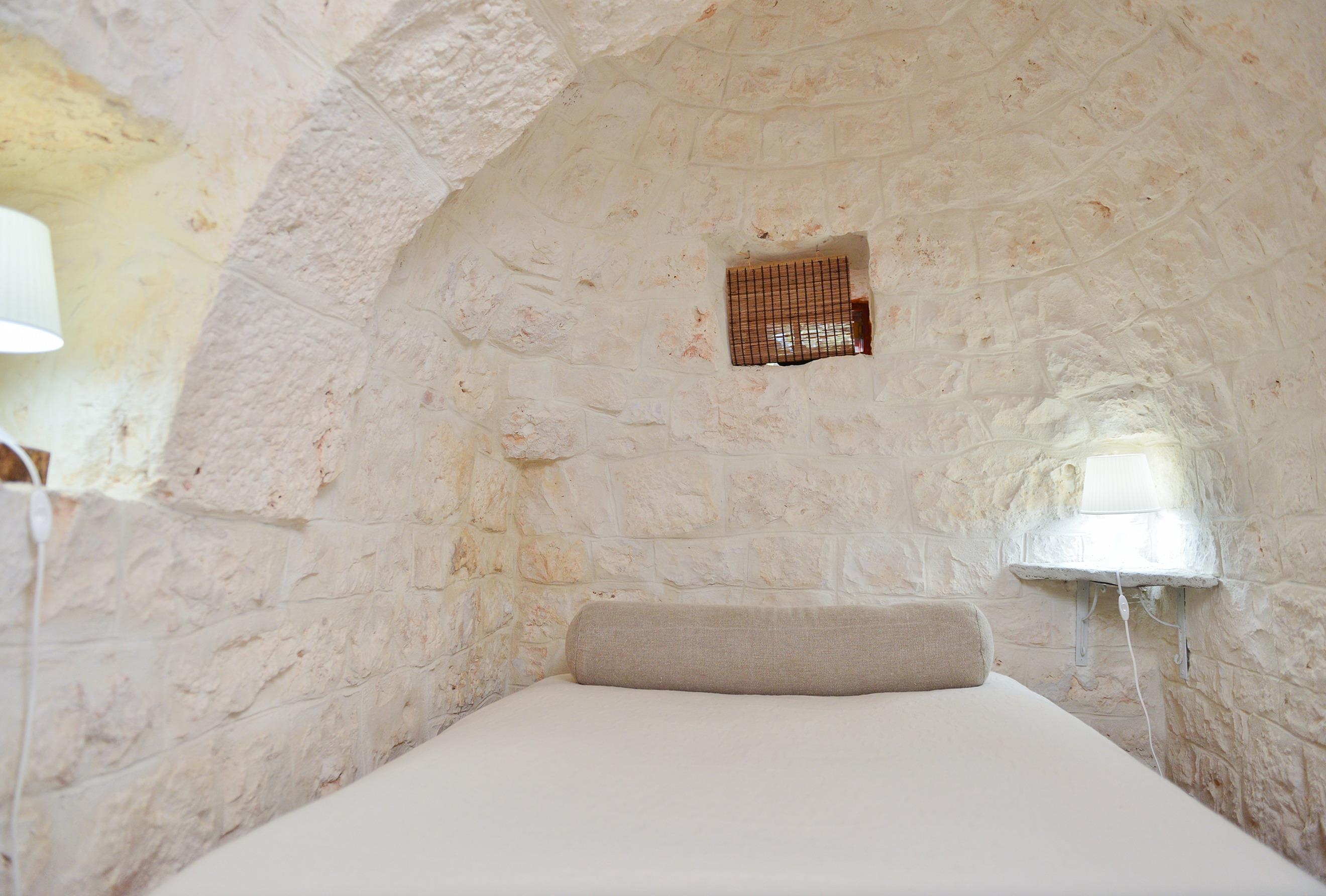 GÄSTEZUGANG: Es gibt 5 Betten: ein Doppelbett und ein französisches Bett im Trullo. Im Wohnzimmer ist es möglich, ein offenes Bett hinzuzufügen und das 65 cm breite Sofa zu benutzen, das für Kinder geeignet ist. Das Badezimmer ist eins und hat eine Dusche.