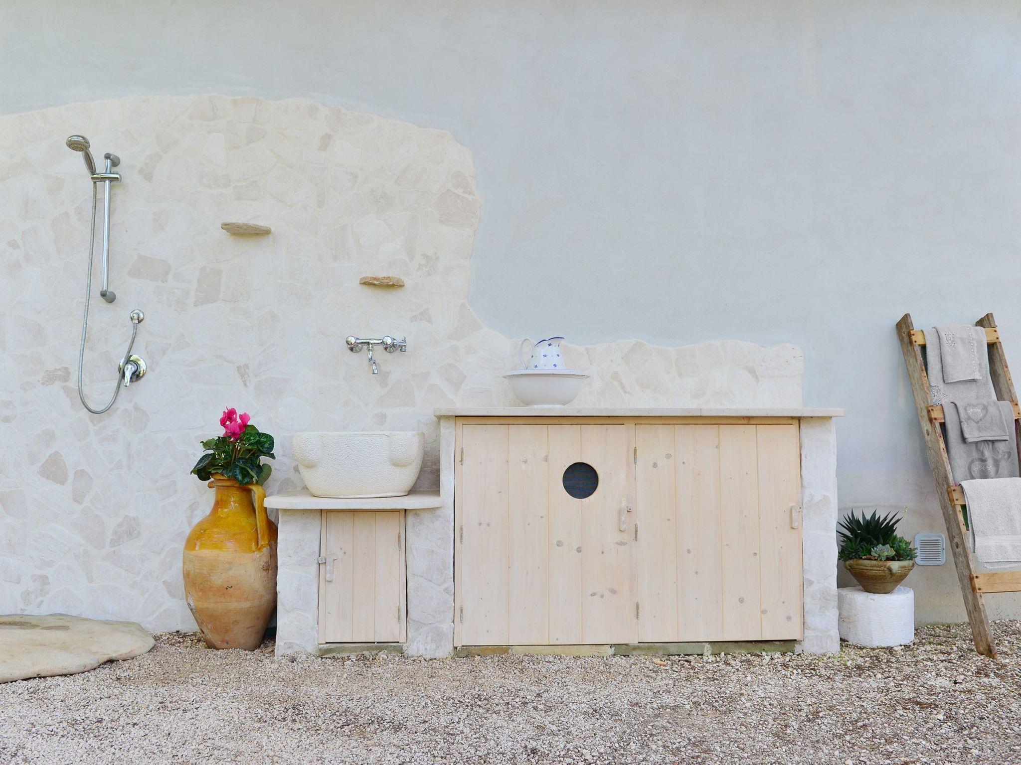 Well furnished trulli for rent in Puglia near the sea. Enjoy 4 beds in 2 romantic ''alcove '', 2 patios overlooking olive trees and a convenient outdoor shower after the beach. It is located in San Michele Salentino within 15 minutes from the beaches of the Oasis of Torre Guaceto.