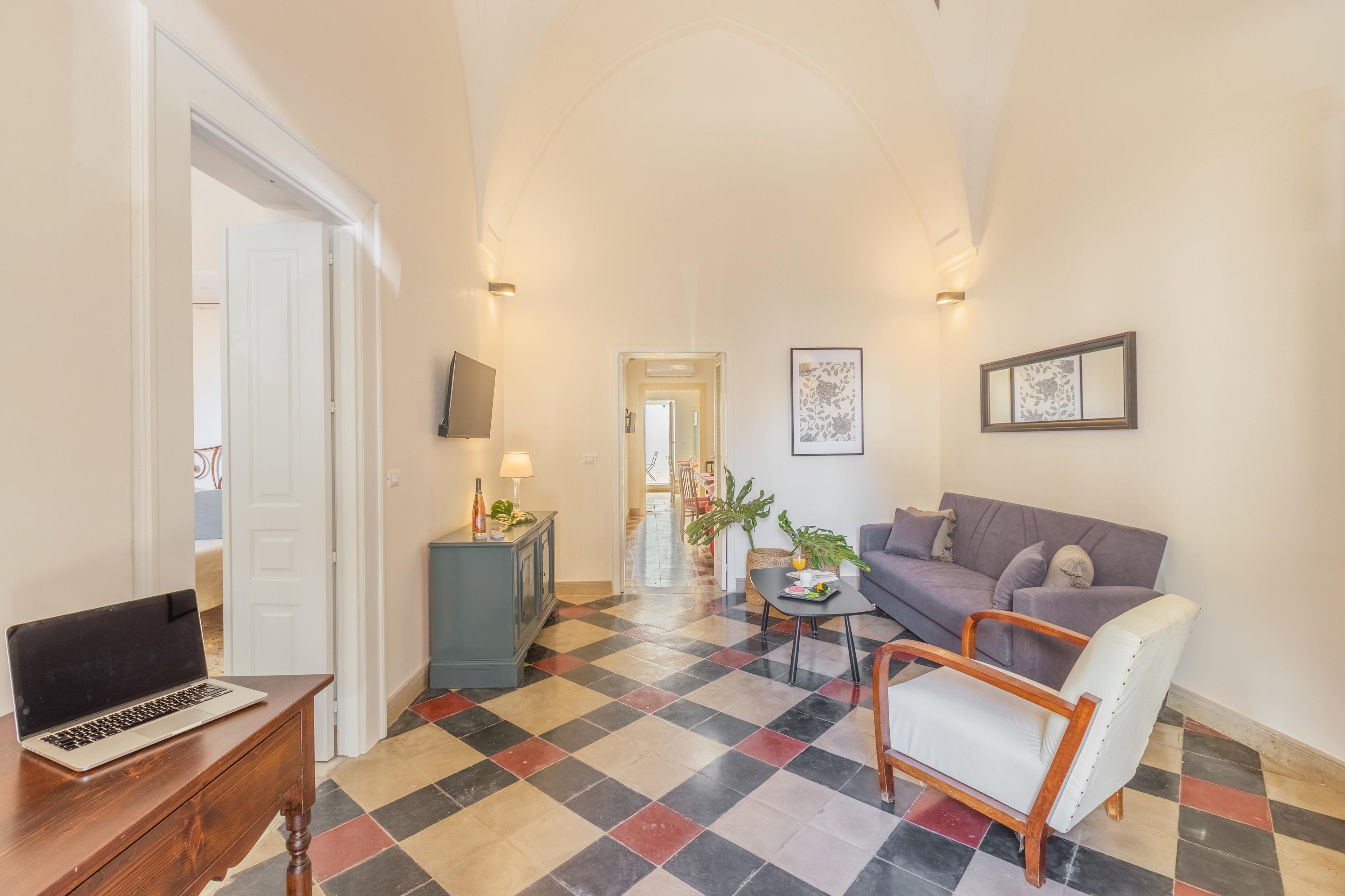 n.1 klimatisierte Doppelzimmer, n.1 klimatisierte Zimmer mit Zugang zur Terrasse, n. 1 Wohnzimmer mit TV und Schlafsofa, n.1 Esszimmer mit TV, n.1 Küche, n.1 Badezimmer mit Dusche.