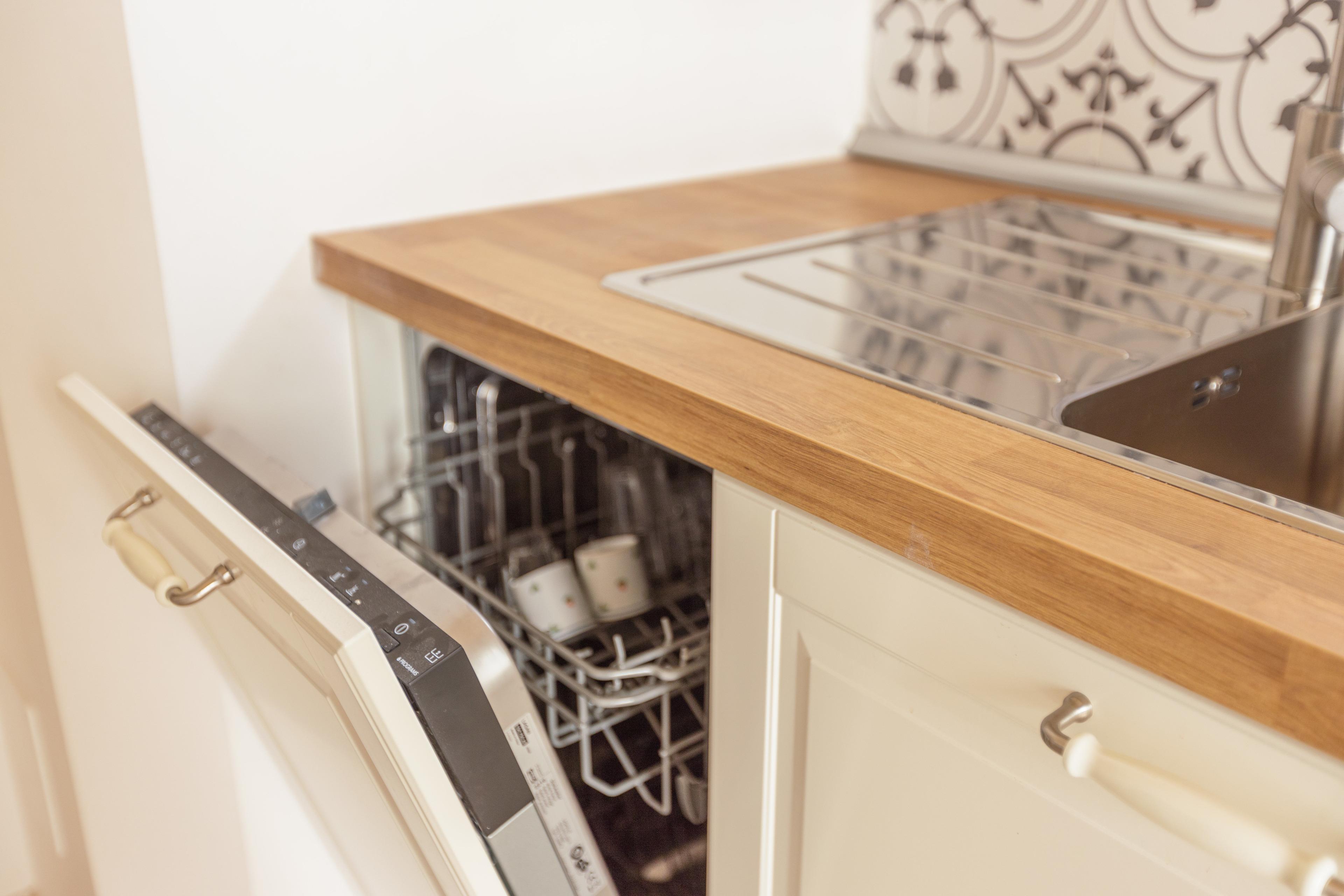 Die Küche ist mit Geschirrspüler, Mikrowelle und Kaffeemaschine ausgestattet;