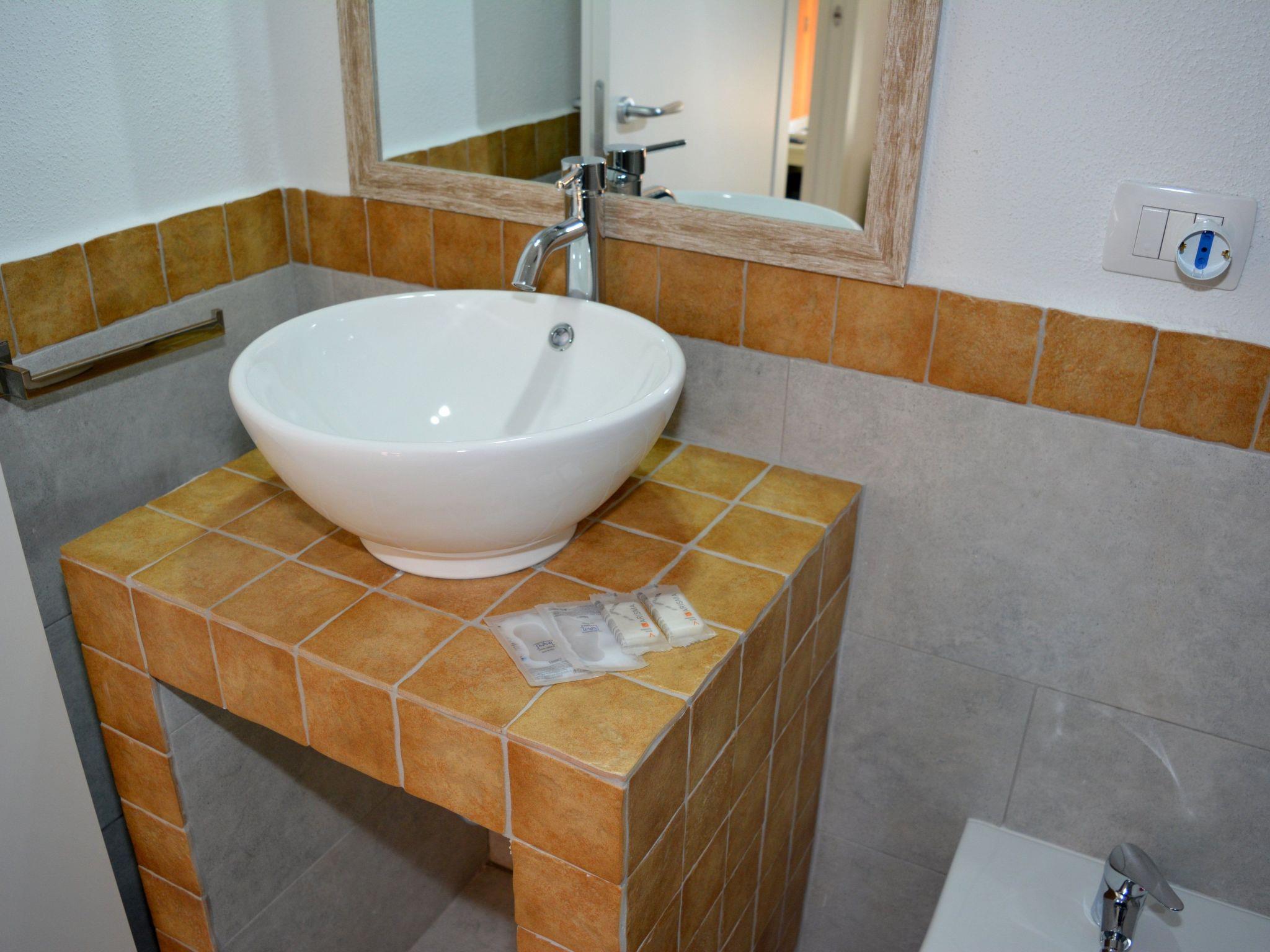 The bathroom, finished with local terracotta inserts, is equipped with shower and sink design.