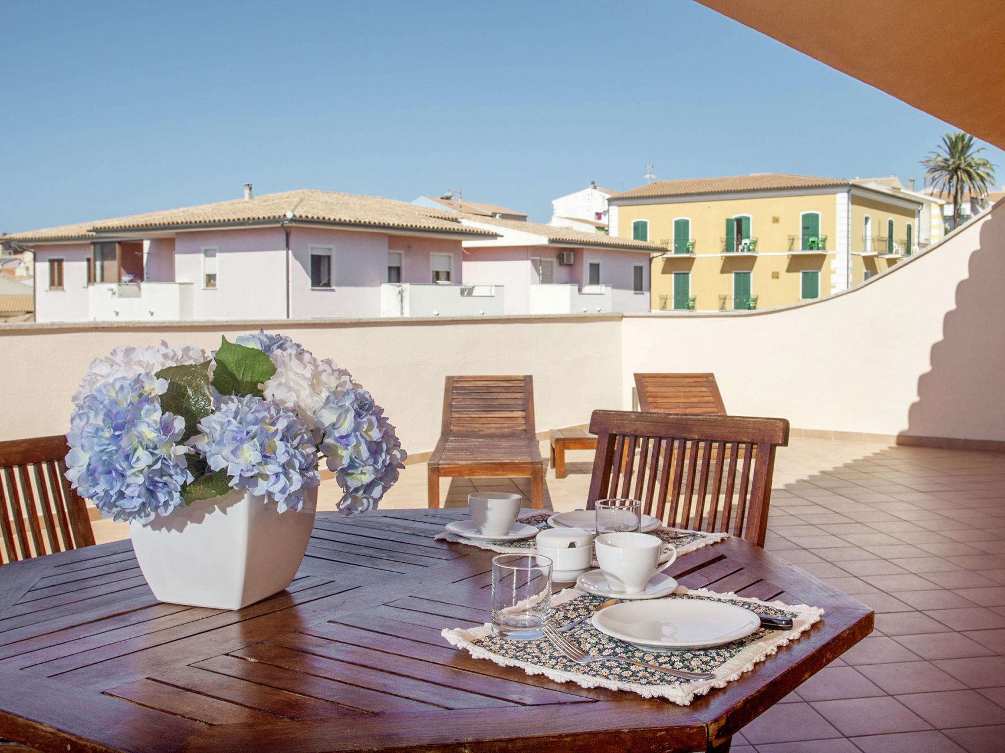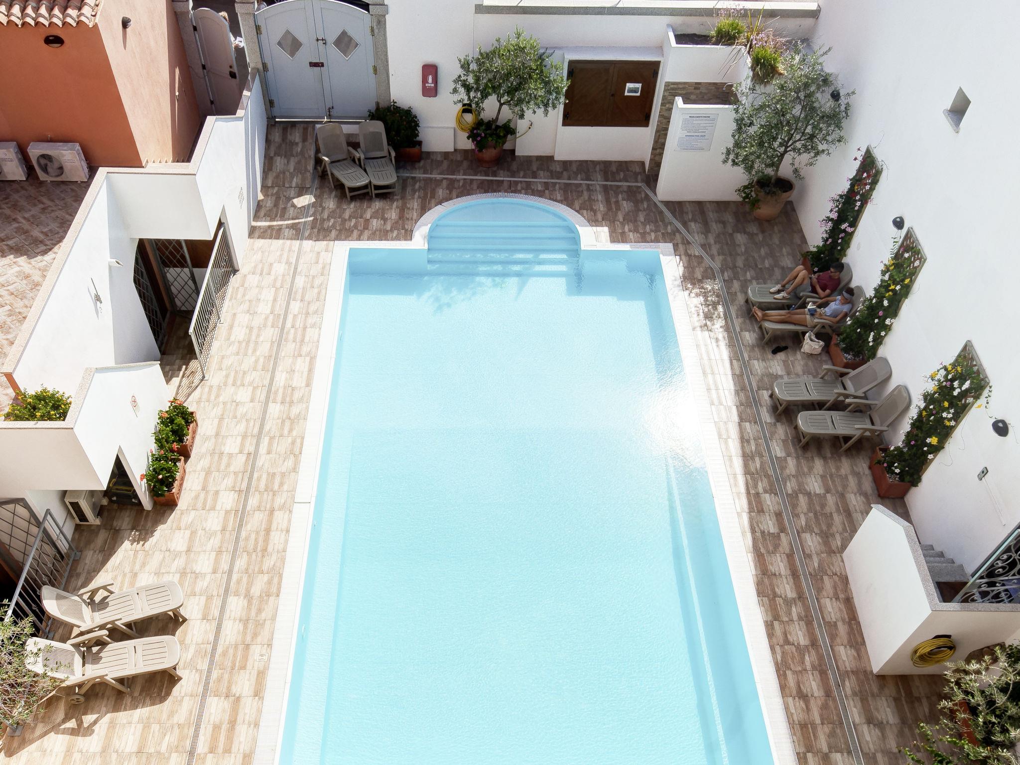Small residence "Cristal Blu", 3 storeys. 21 apartments in the residence. In the district of Santa Teresa di Gallura 300 m from the centre of Santa Teresa di Gallura, in a central position, 800 m from the sea. For shared use: courtyard, swimming pool (12 x 6 m, depth 80 - 160 cm, seasonal availability: 03.Apr. - 23.Oct.). Outdoor shower. In the complex: reception, lounge, internet access, WiFi, washing machine, tumble dryer (for shared use). Public parking on the road extra. Bus stop 450 m, sandy beach "'Rena Bianca'" 800 m. Marina 200 m. The photo is just an example. The holiday properties may differ in living space, floorplan, equipment and furnishing.