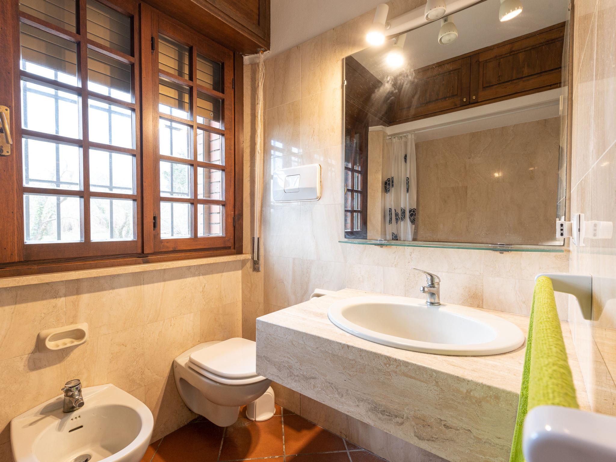 6-room villa 240 m2 on 2 levels. Spacious and bright, tasteful furnishings: large living room with veranda, panoramic window with open-hearth fireplace (only for decoration). Exit to the garden, to the veranda. 1 double bedroom. 1 small room with 1 bed (140 cm). Large, open kitchen (oven, dishwasher, 5 gas rings, toaster, kettle, microwave, freezer, grill, electric coffee machine) with open-hearth fireplace and dining table. Exit to the garden. Bath/bidet/WC, sep. WC. Upper floor: 1 large double bedroom with shower/bidet/WC, double hand-basin and air conditioning. Exit to the terrace. With sloping ceilings, Studio. 1 large room with 4 beds and air conditioning. Shower/bidet/WC. Gas heating. Heating available only from 15.10. to 15.04. Large terrace, patio. Terrace furniture, barbecue. Facilities: washing machine, baby cot for up to 2 year olds, hair dryer. Internet (WiFi, free). Please note: non-smokers only. Maximum 2 pets/ dogs allowed. Smoke alarm, fire extinguisher. Outside there is a pizza oven with sink adjacent to the equipped space where you can eat outdoors. IT053014C2UHVXIEYG