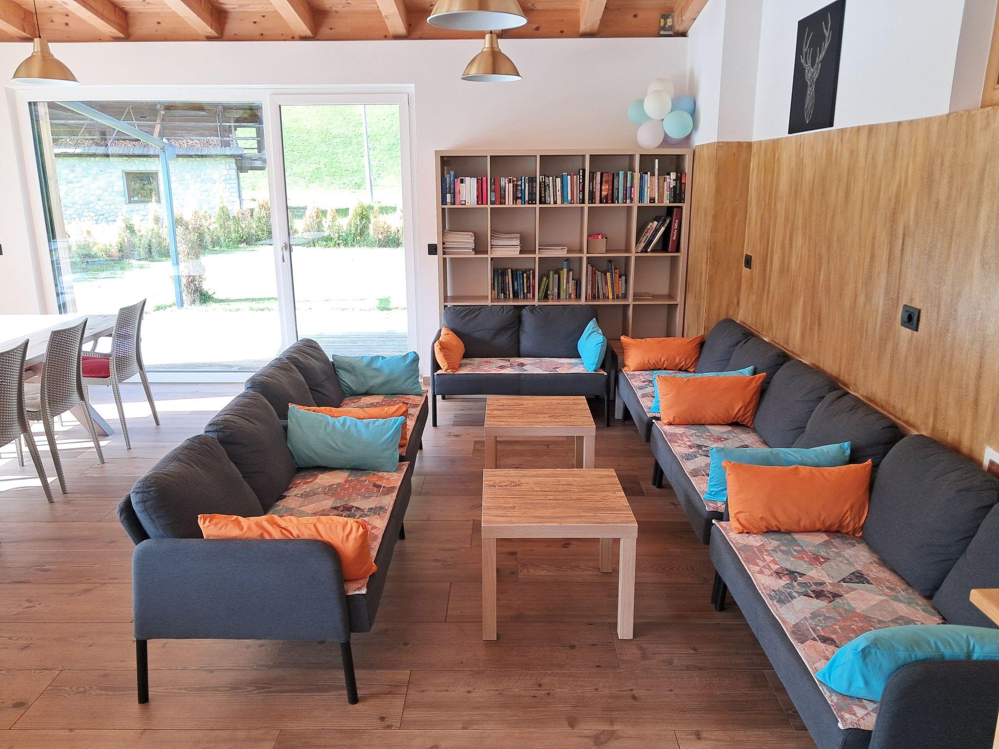 an approx. 52 m2 dining and lounge area with a 6 metre long table, satellite TV, board games, WiFi, sitting area.
