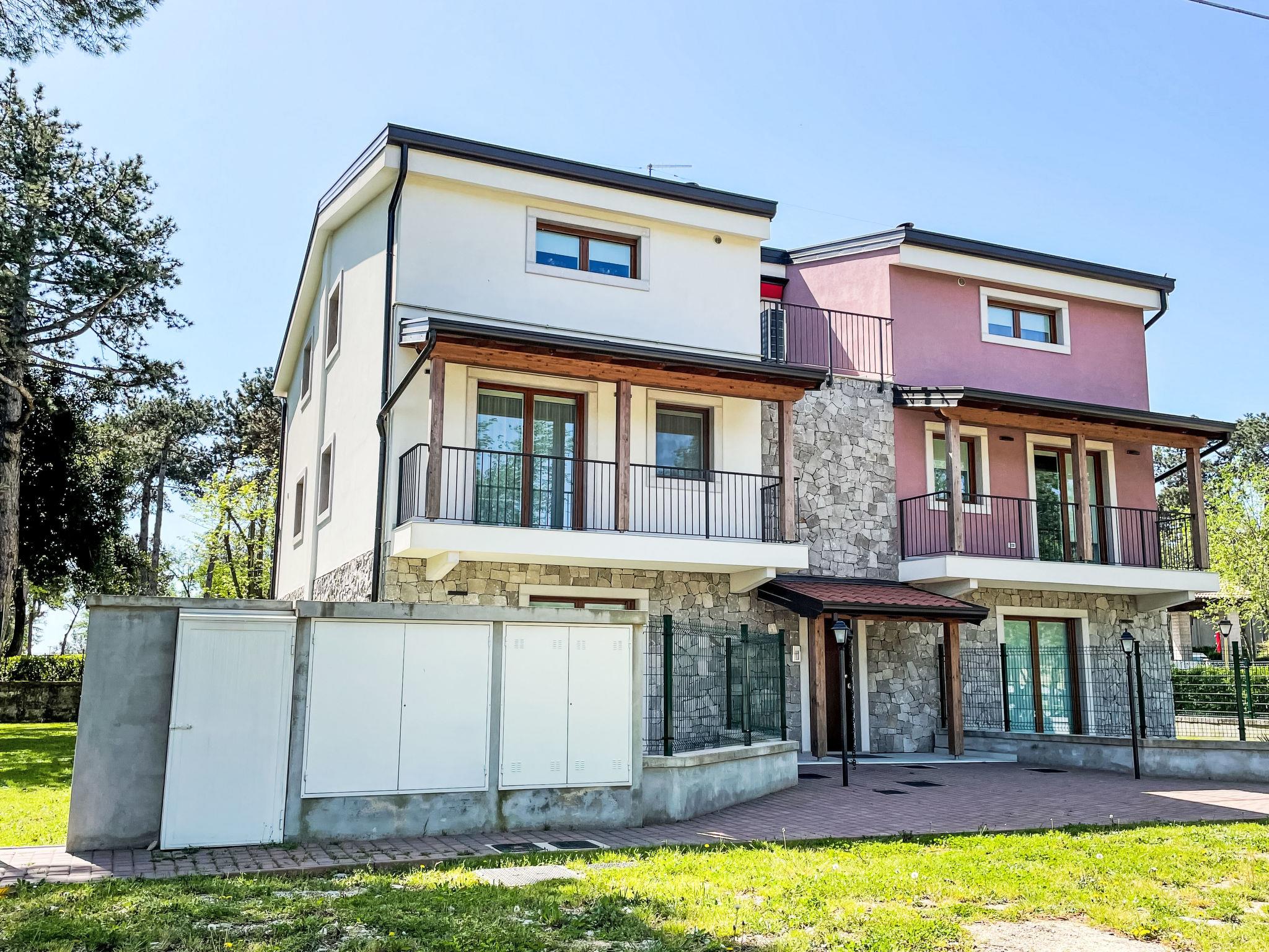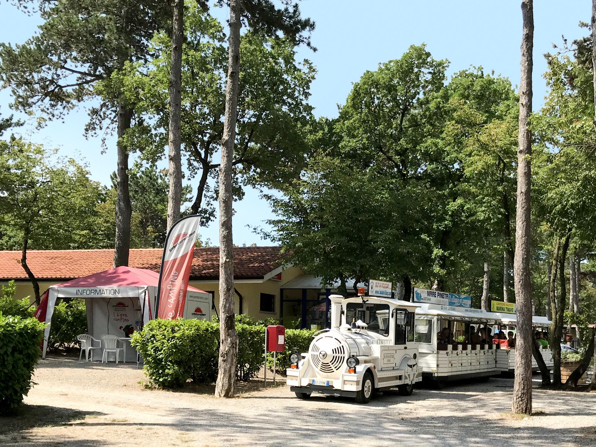 Large, child friendly holiday village "Camping Village Mare Pineta". 115 houses in the resort. 6 apartments in the residence. 1 km from the centre of Sistiana, 18 km from the centre of Trieste, in an elevated position on a slope, 1.6 km from the sea, 1.6 km from the beach. For shared use: property 10 ha (fenced) with trees, swimming pool (30 x 20 m, seasonal availability: 23.May. - 15.Sep.). Children's pool, outdoor shower, tennis (extra), table tennis, basketball (extra), beach volleyball, children's playground. In the complex: reception, bistro, shopping facilities, washing machine (for shared use, extra). Grocery 100 m, supermarket 1 km, bus stop 200 m, railway station "Trieste Centrale" 18 km, rocky beach "Baia Sistiana" 1.6 km. Nearby attractions: Castello di Duino 2 km, Castello di Miramare 13 km, Sentiero Rilke 350 m. Please note: entertainment in the season. Suitable for families. Obligation to wear bathing caps.