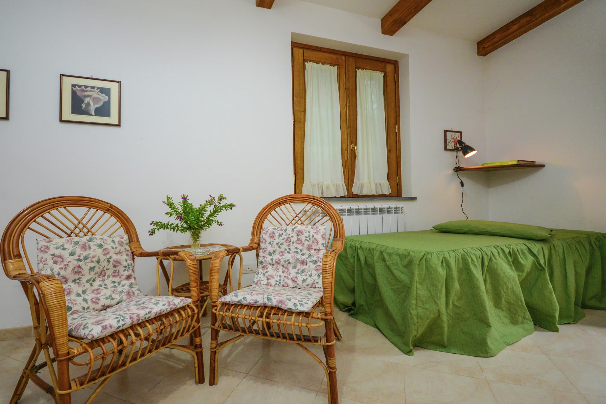 Stueetage: (Stue(2x enkeltseng, Fjernsyn), åbent køkken(kaffemaskine(kaffetragt)), soveværelse(dobbeltseng), badeværelse(bruser, håndvask, toilet, bidet)) vaskemaskine, varme, klimaanlæg, have(deles med andre gæster, 300 m2), havemøbler