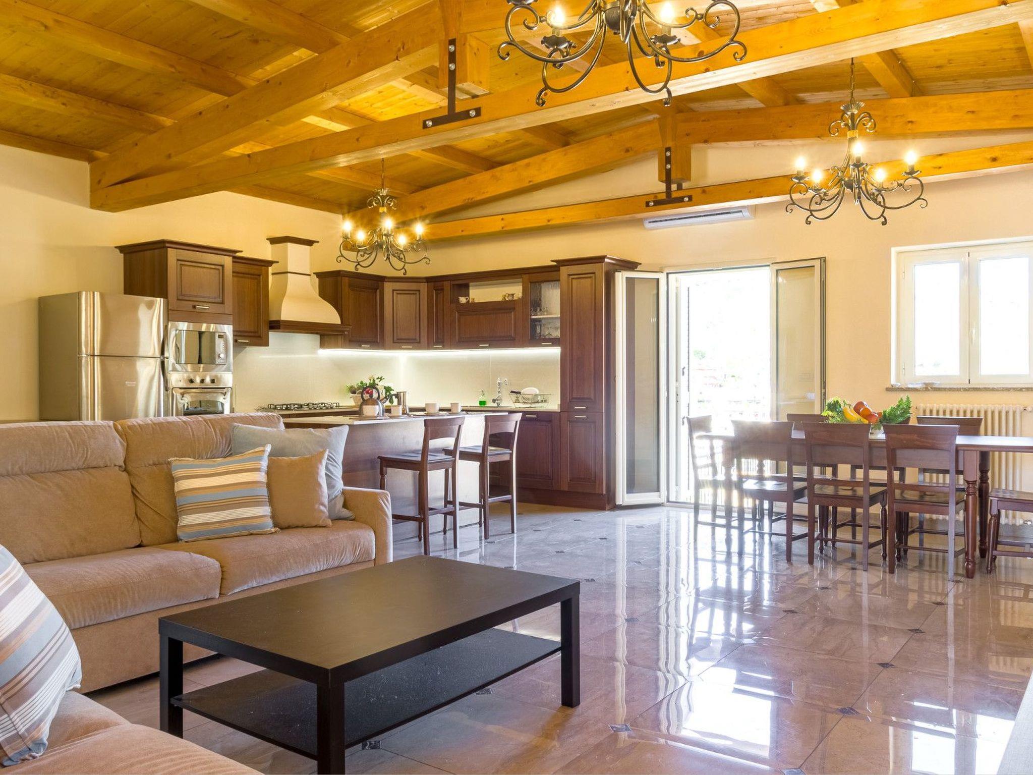 The interior of the house is designed to offer you maximum comfort during your stay. The flat is spread over two levels, with four cosy bedrooms, each designed to provide privacy and relaxation for its guests. Two of these have en-suite bathrooms, while the other two share a bathroom located on the floor. On the second level, you will find a large living area with an American-style kitchen, ideal for convivial moments, crowned by a charming roof with exposed wooden beams, which adds a touch of warmth to the environment. To complete the interior comforts, there is a private laundry room with washing machine, facilitating the needs of each guest.