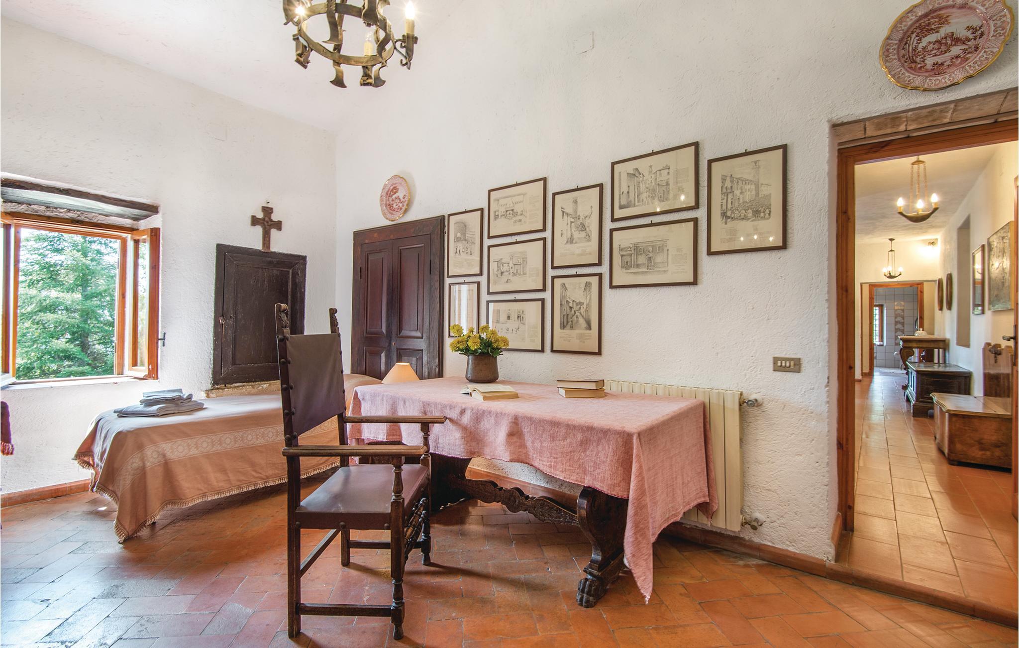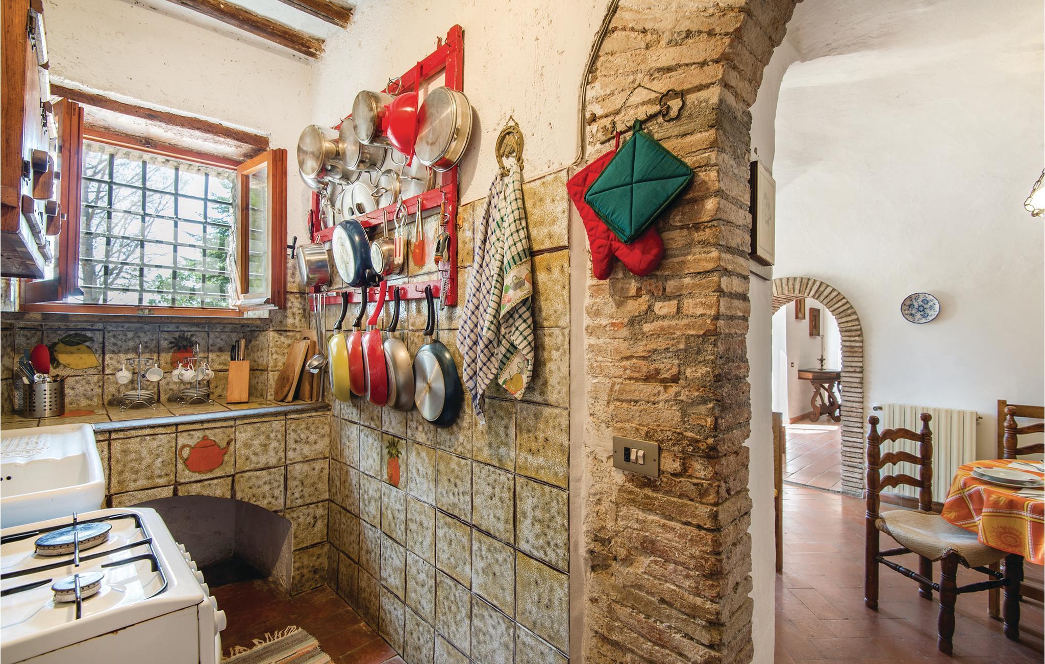 Karakteristisk forhenværende bondehus af sten, som er fuldstændig renoveret og ombygget til et hyggeligt beboelseshus. Det ligger ved siden af en forhenværende sognekirke, som i dag bebos af ejeren. Stedet ligger halvvejs oppe af en bakke over Neradalen i nærheden af Termi og er en del af et landbrug med olivenlunde. Rundt om huset er der en skyggefuld plæne med swimmingpool og en udstyret loggia til jeres måltider. Det er muligt at købe olivenolie, som er produceret på stedet. 2 hunde (ejerens) på grunden. Hushjælp på forespørgsel (afregning på stedet). På efterspørgsel og mod betaling: hushjælp og børneseng (30 Euro/uge). I stueetagen er en stor salon med kamin, dobbeltsovesofa og to udgange til havven, spisestue med kamin og udgang til haven, lille køkken (ovn og køleskab, et soveværelse med to enkeltsenge med indgang gennem pergolaen, et badeværelse med brusebad. Mellemetage: toilet med vaskemaskine, 1ste sal: lille stue, soveværelse med dobbeltseng, soveværelse med enkeltseng, badeværelse med badekar. Afstande: Terni (forretninger af alle slags) 2 km, det berømte vandfald i Marmore 9 km, Piedilucosøen (Italinens centrum for kanosejlads) 16 km, Spoleto 30 km, Assisi og Perugia 85 km, Rom 100 km.