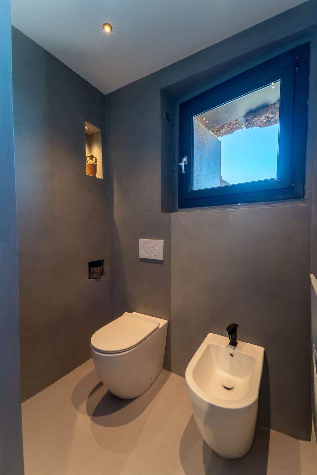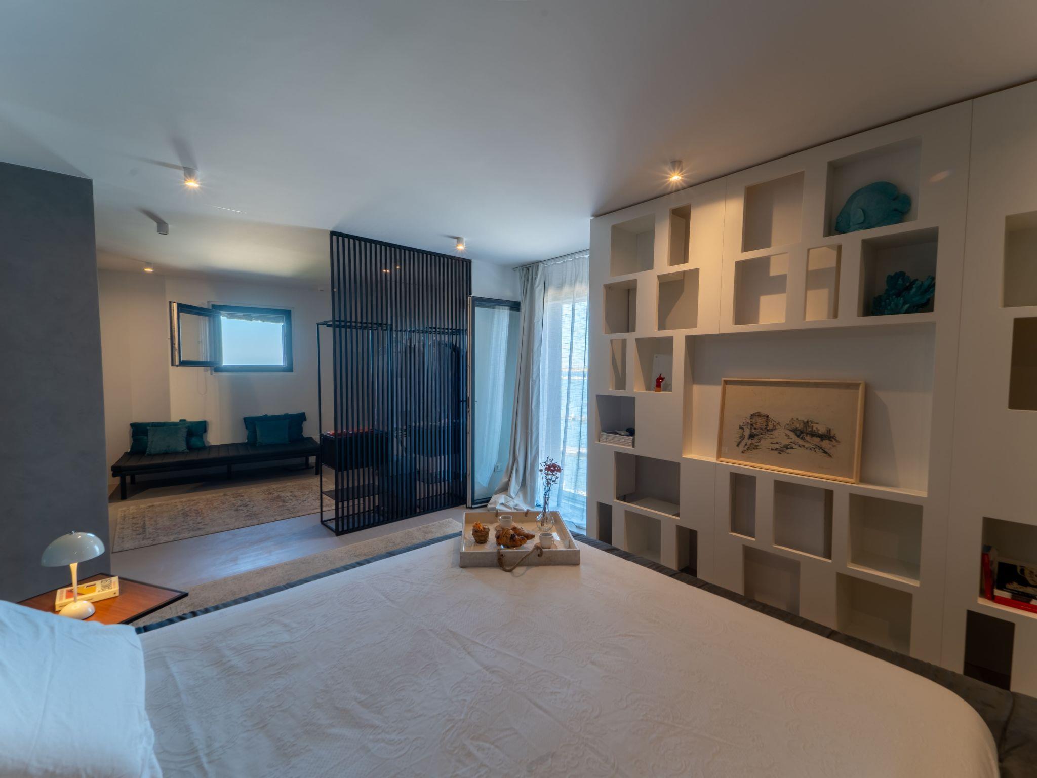 One of the rooms is set on an elegant mezzanine, accessible via a comfortable staircase, while the main suite—located on the lower level of the living area—enjoys a stunning view of the Terrasini harbor thanks to the elevated position of the house. Spacious and bright, it stands out for its generous layout and serene atmosphere.