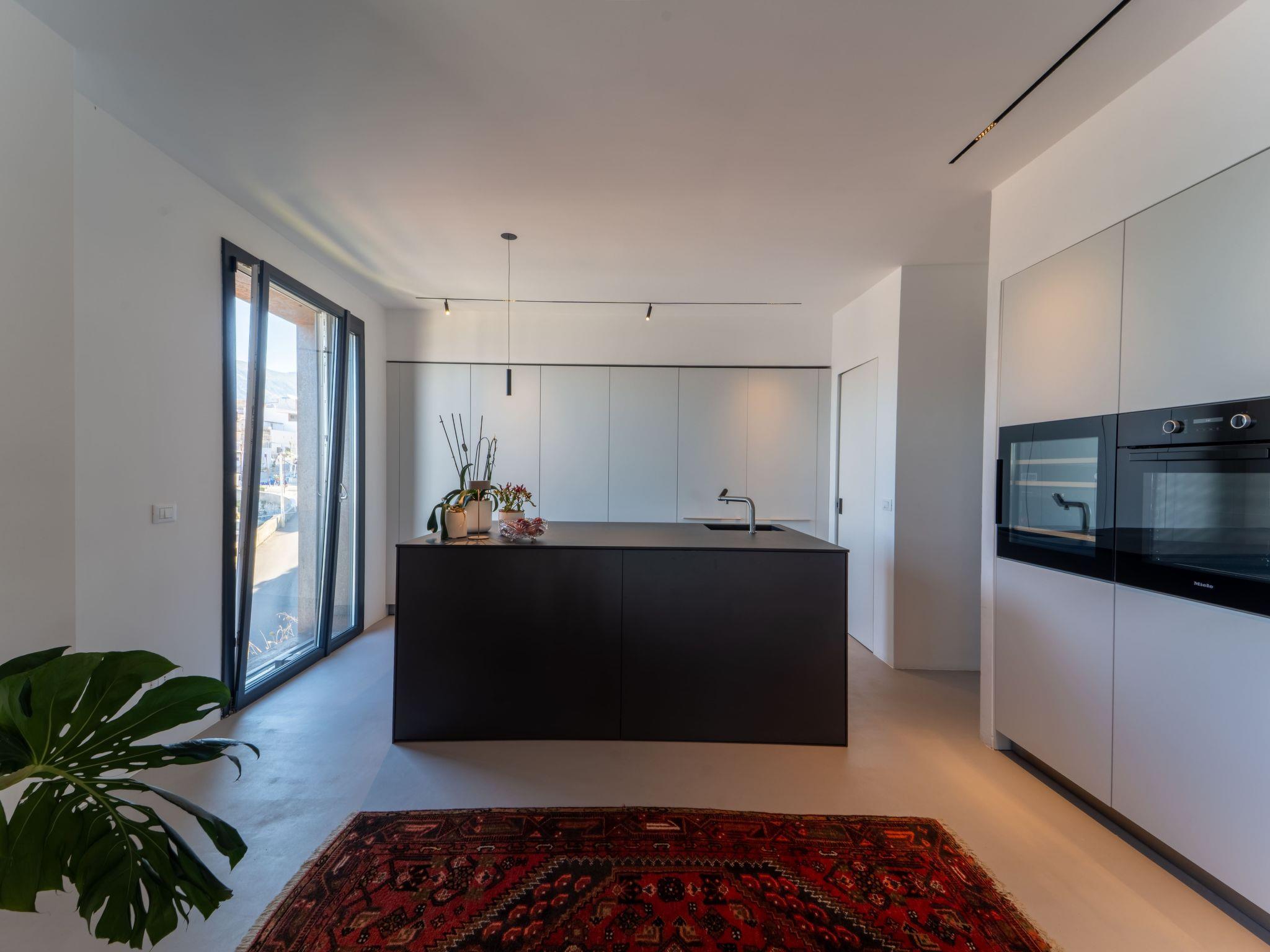 The space unfolds in a large, high-design open area where the living room, dining room, and kitchen blend seamlessly in an essential yet sophisticated style.