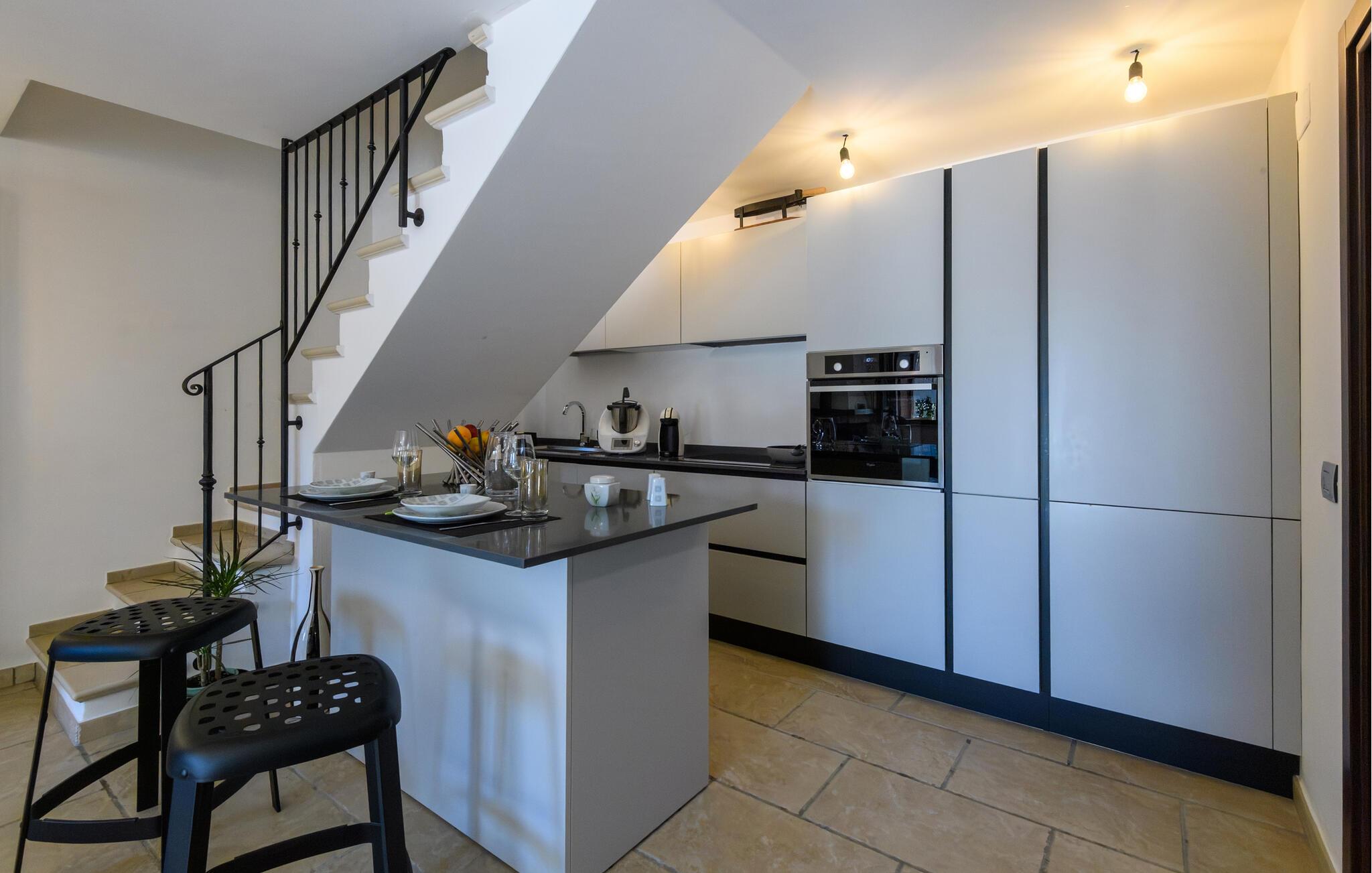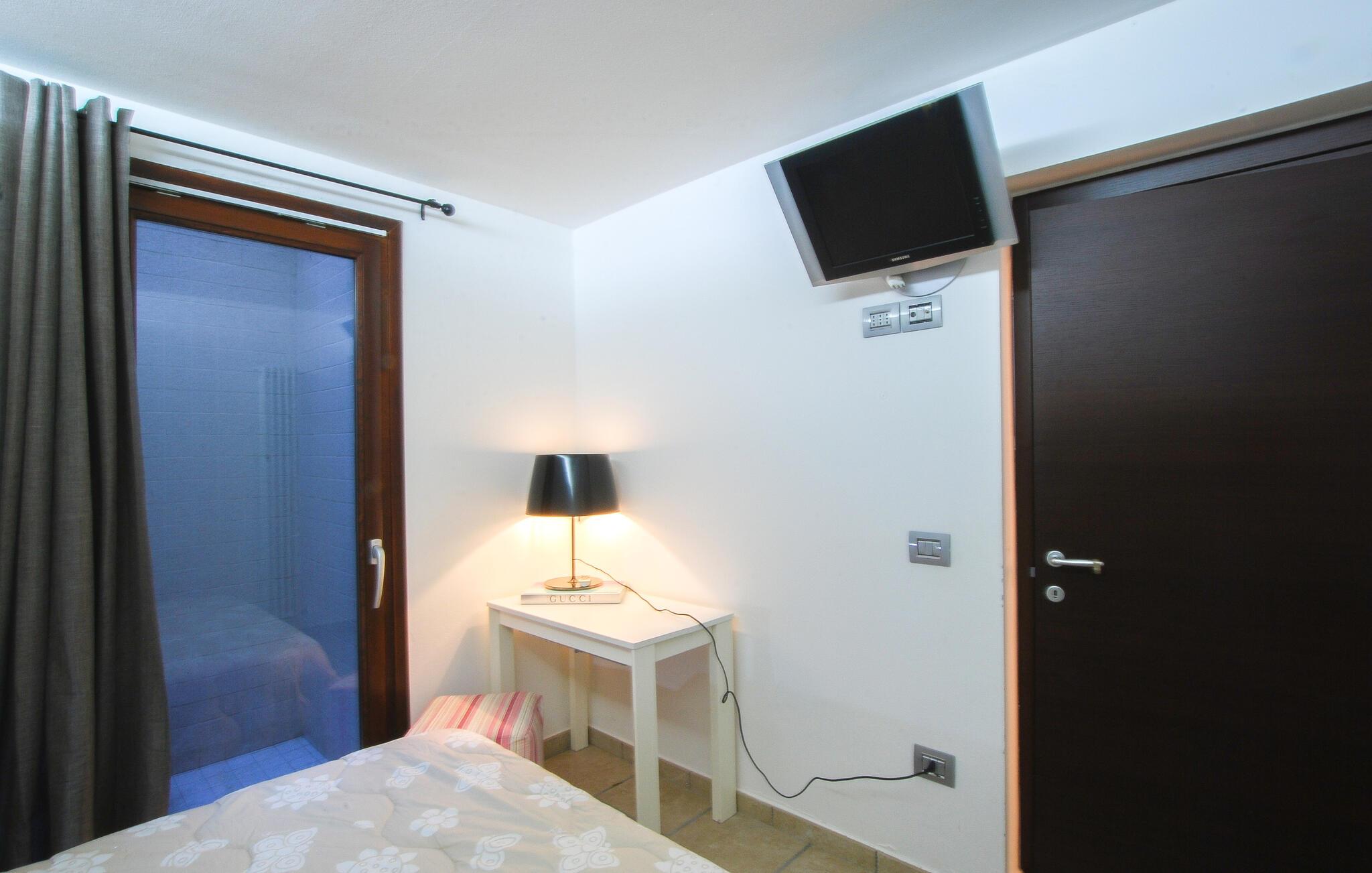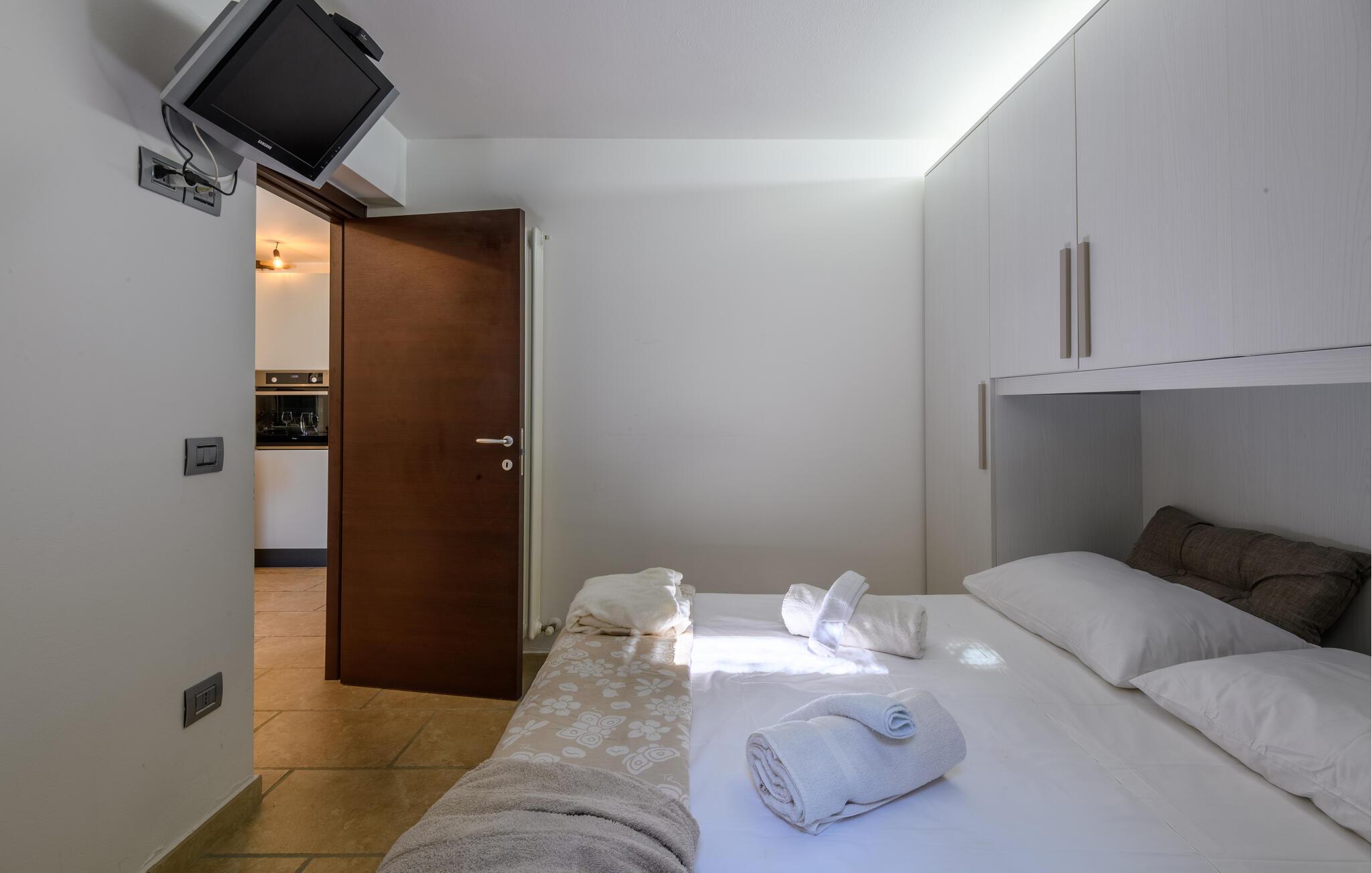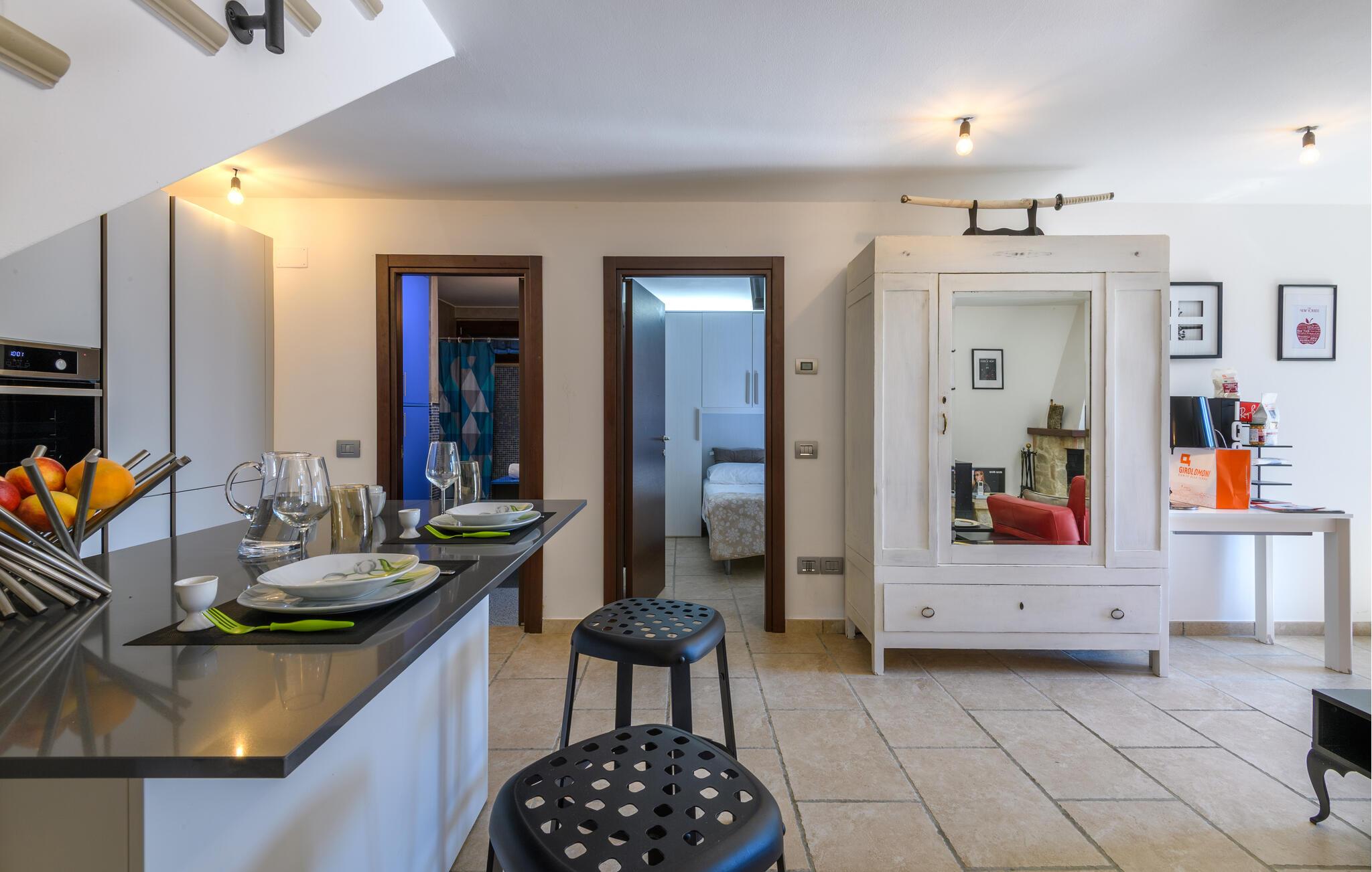 Den hyggelige lejlighed er noget særligt med møbler af høj kvalitet og kærligt designede møbler. Den åbne pejs i opholdsrummet skaber en hyggelig atmosfære, ideel til jeres afslappede ferieaftener. Start dagen på den lille terrasse foran jeres lejlighedsdør eller nyd den rummelige have med pool, som lægger op til solbadning og forfriskning. Udsigten over de omkringliggende bølgende bakker skaber en idyllisk feriefølelse.