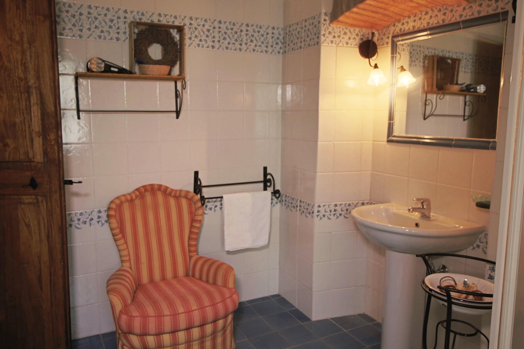 Stueetage: (åbent køkken(mikrobølgeovn, opvaskemaskine ), stue / spisestue(dobbeltsovesofa, Fjernsyn, spisebord, pejs)) På 1. etage: (soveværelse(2x enkeltseng), soveværelse(dobbeltseng), badeværelse(bruser, håndvask, toilet, bidet)) Bubble bath(betalt), sauna(paid), vaskemaskine(deles med andre gæster, betalt), varme(central), klimaanlæg, have, havemøbler, grill, swimmingpool(deles med andre gæster, 14 x 7 m., opened from May upto and including 1/2 Sep), petanquebane, legeredskaber, bordtennisbord