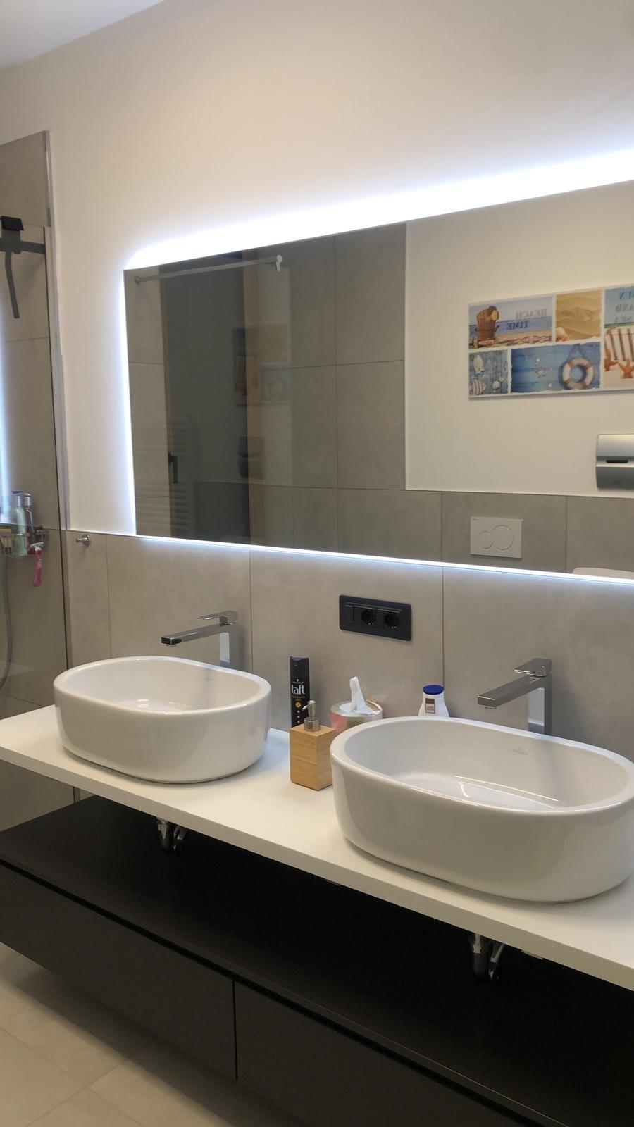 Das helle, moderne Badezimmer verfügt über einen Doppelwaschtisch, einer großräumigen, barrierefreien Dusche und einem bodenlangen Fenster. Die mit Gartenmöbel ausgestattete überdachte Balkon-Terrasse, ist von allen Räumen des Apartments mit einer eigenen Terrassentüren zugänglich.