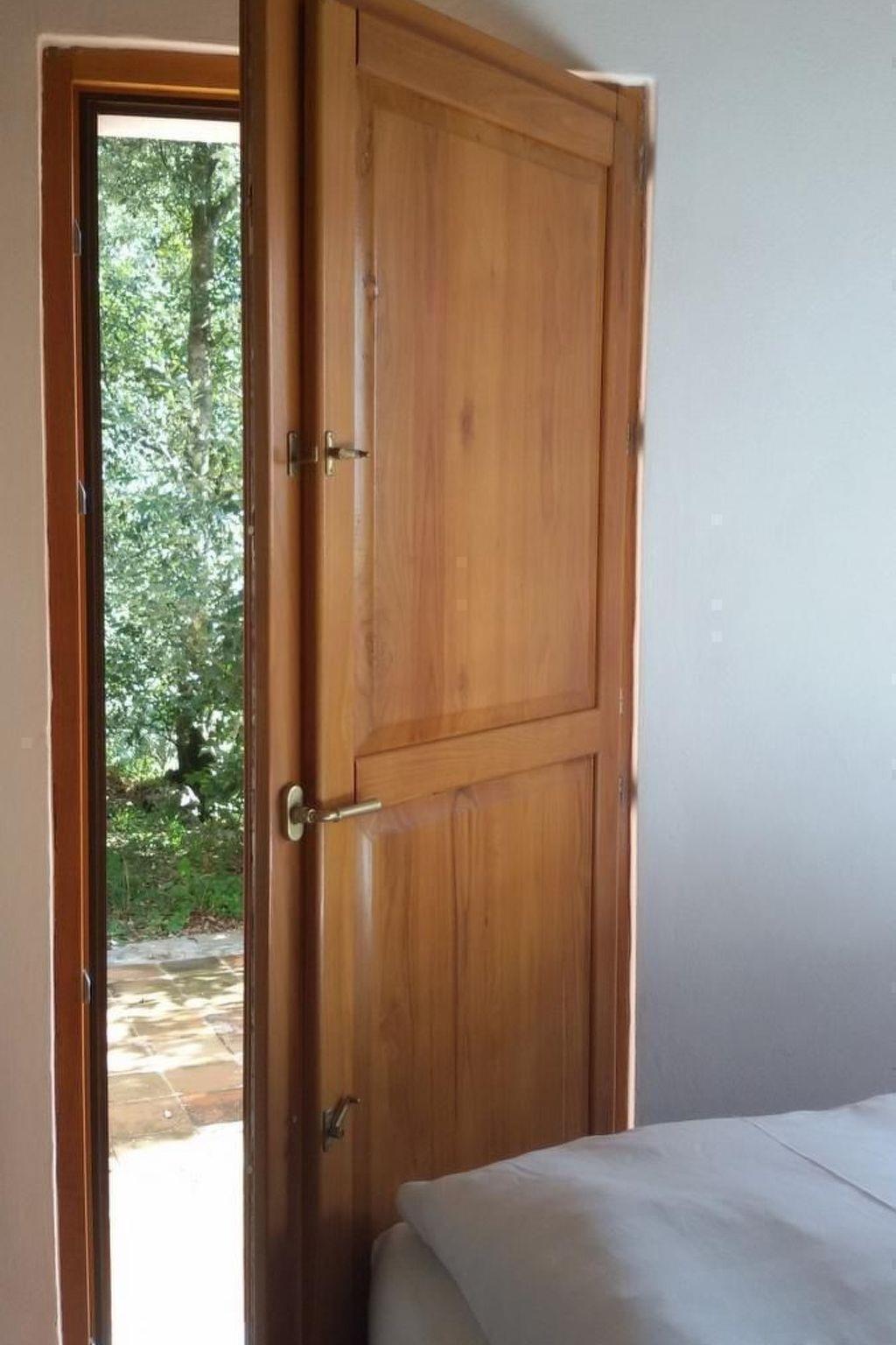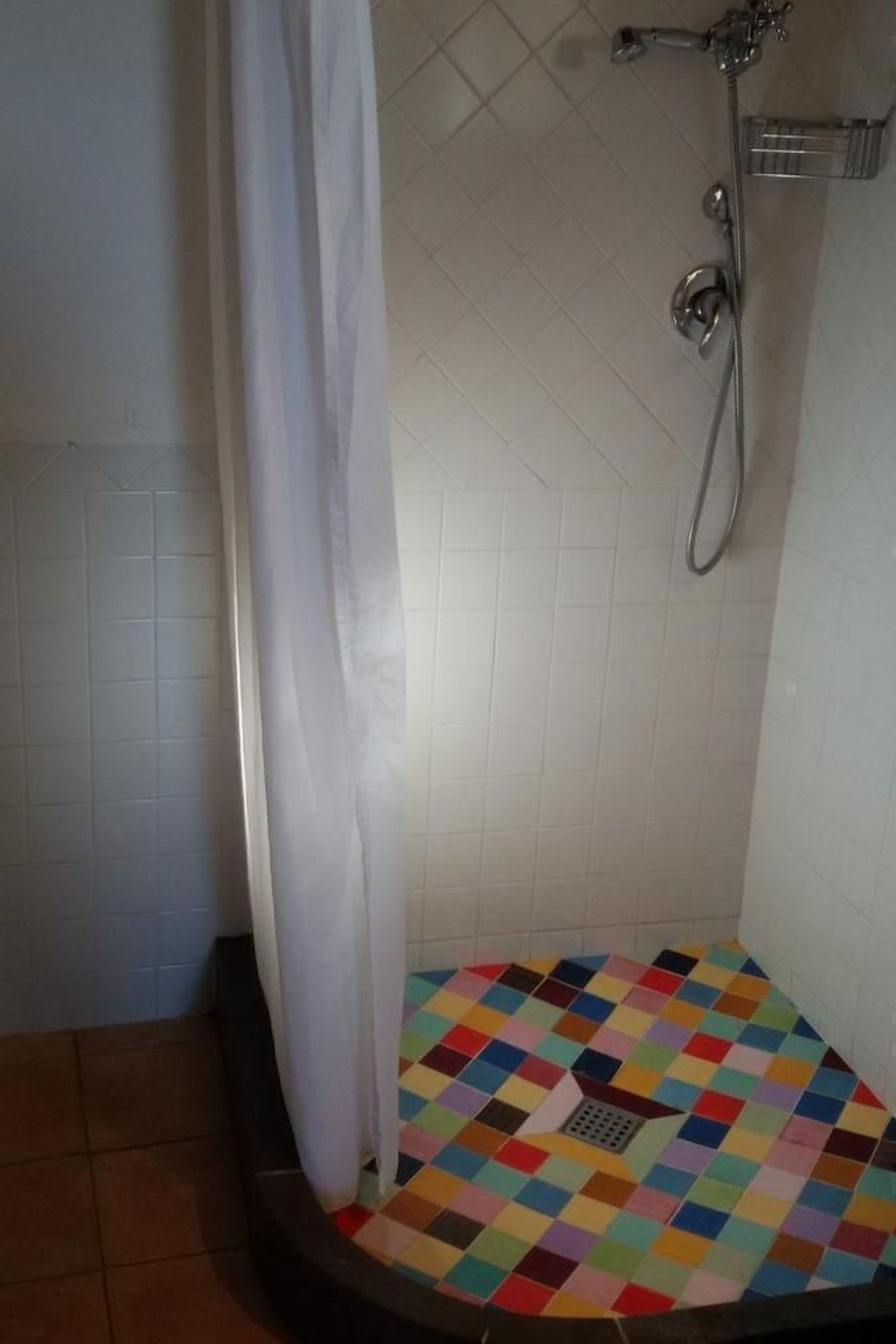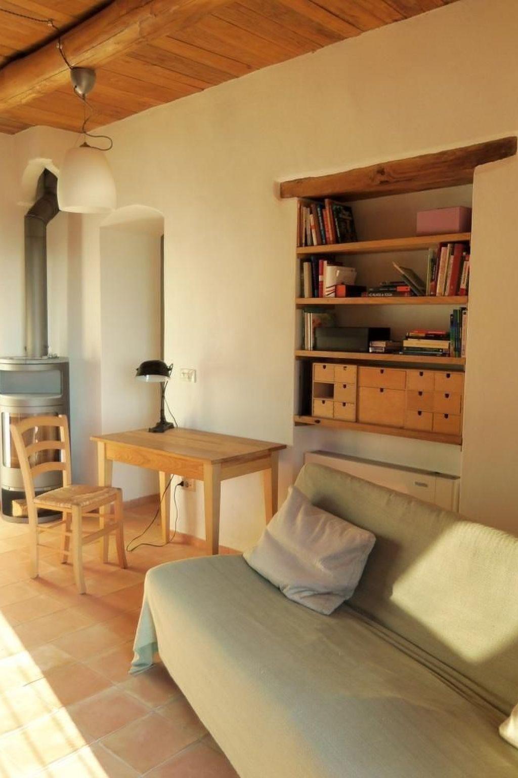 You enter a 25 m² eat-in kitchen with a cooking island, handmade stone sink and wood-burning stove via a cotto-tiled terrace. There is a sofa with a real mattress (120 cm wide) and a dining table with chairs in the eat-in kitchen. Internet (WLAN) is also available. A dressing room on the left leads to a bathroom with shower, washbasin, toilet and bidet. To the right is a small bedroom with a double bed (160 cm x 200 cm) and access to a small terrace in the holm oak forest. The stove is in a central position so that the doorless bedroom also benefits from it.