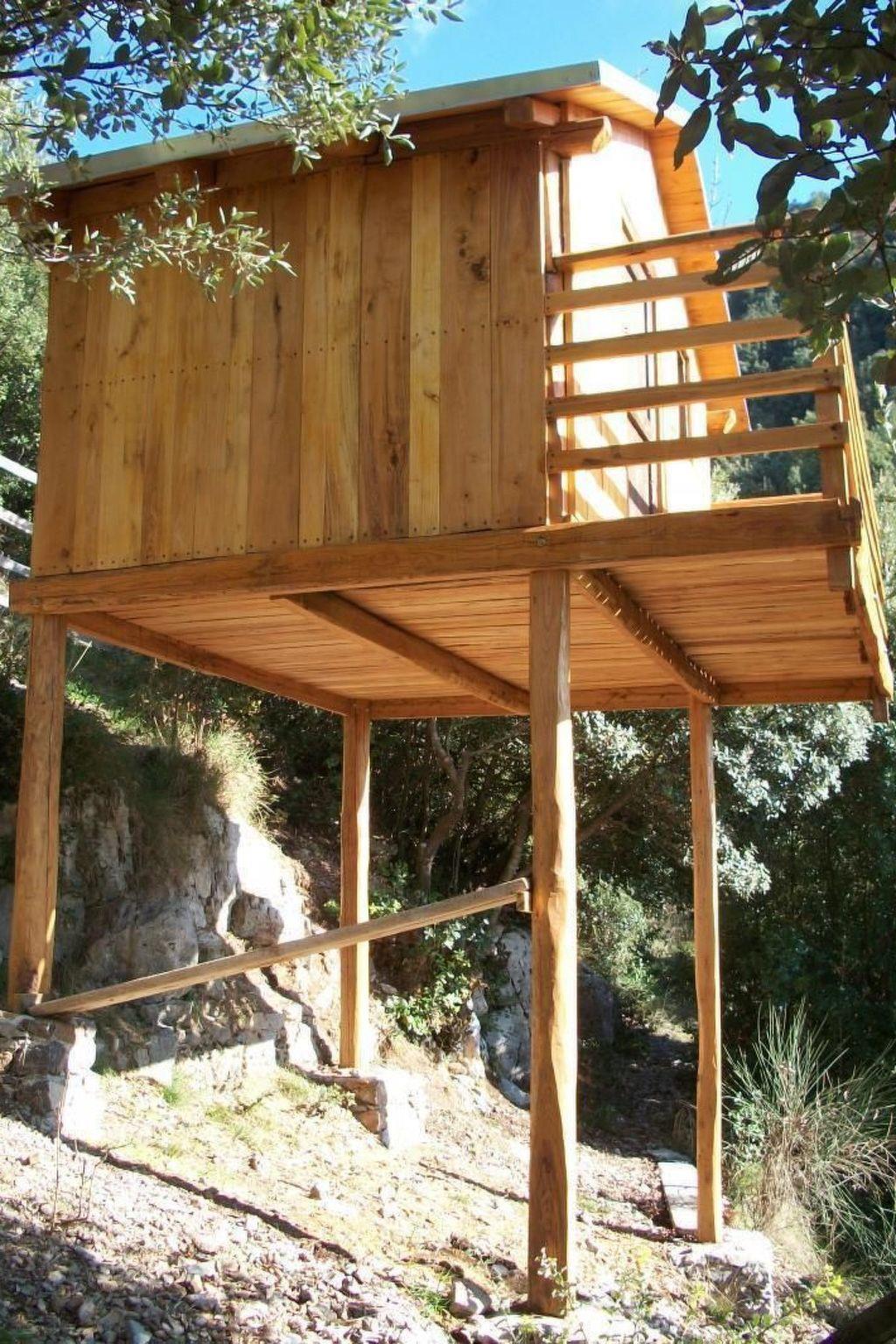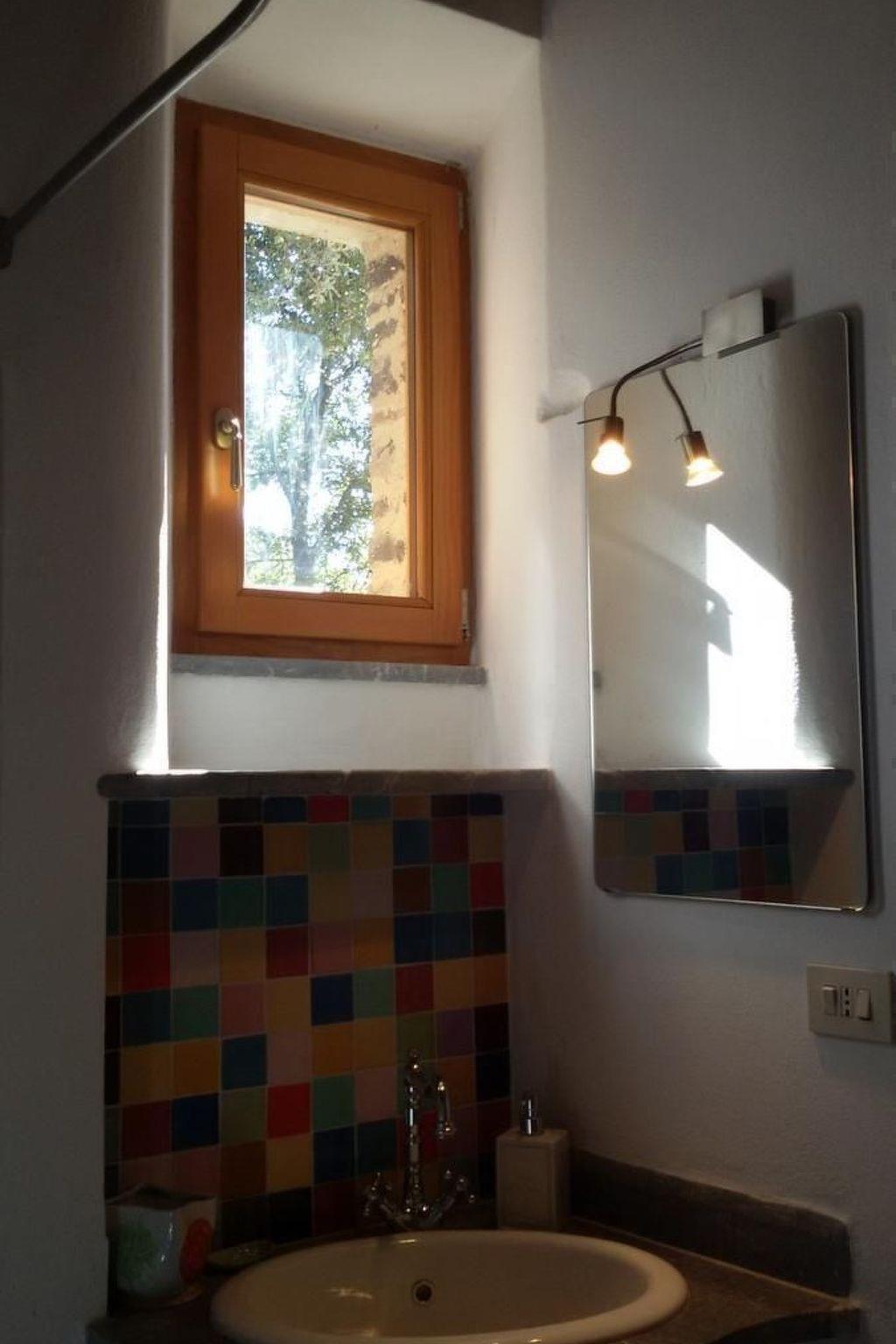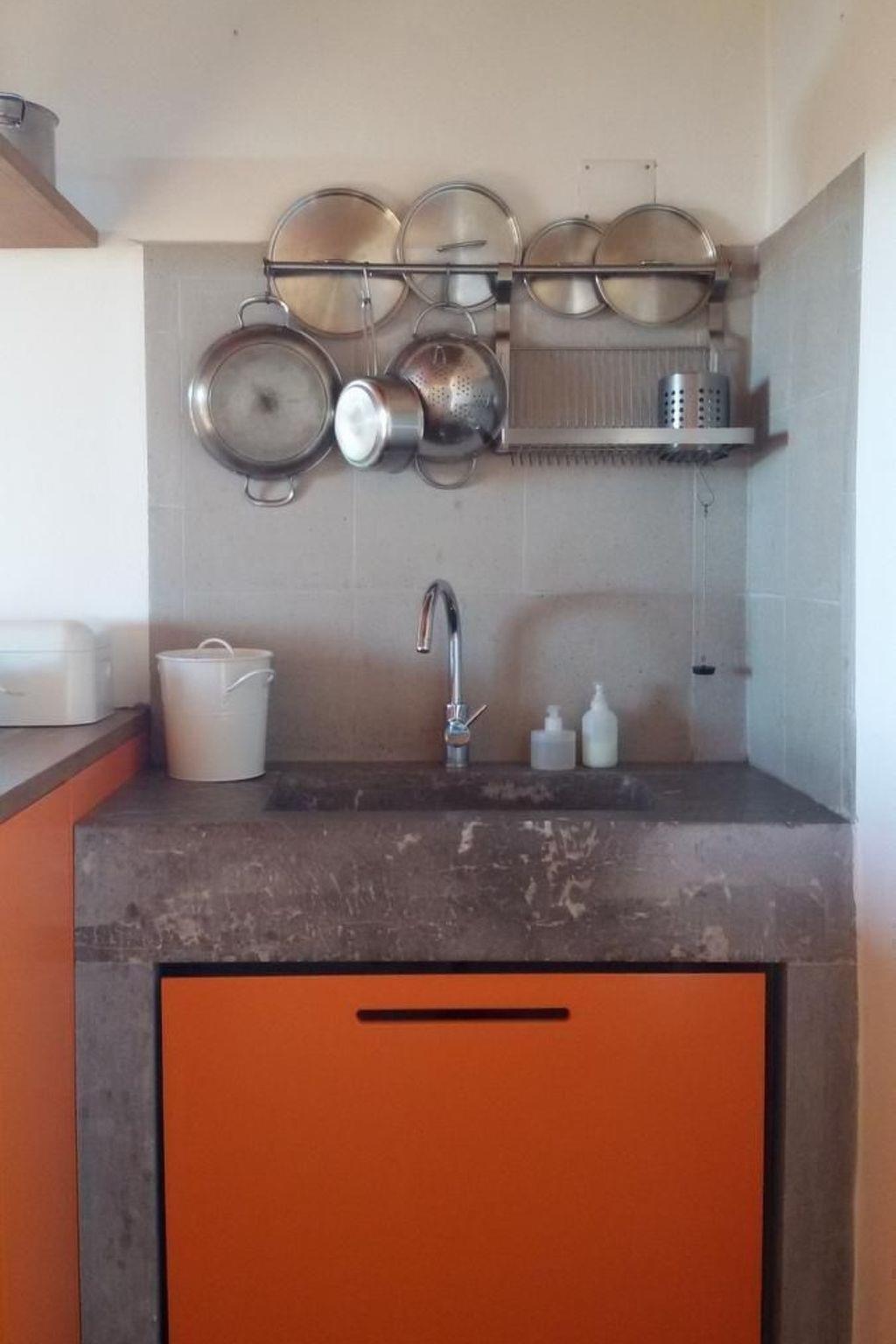 You enter a 25 m² eat-in kitchen with a cooking island, handmade stone sink and wood-burning stove via a cotto-tiled terrace. There is a sofa with a real mattress (120 cm wide) and a dining table with chairs in the eat-in kitchen. Internet (WLAN) is also available. A dressing room on the left leads to a bathroom with shower, washbasin, toilet and bidet. To the right is a small bedroom with a double bed (160 cm x 200 cm) and access to a small terrace in the holm oak forest. The stove is in a central position so that the doorless bedroom also benefits from it.