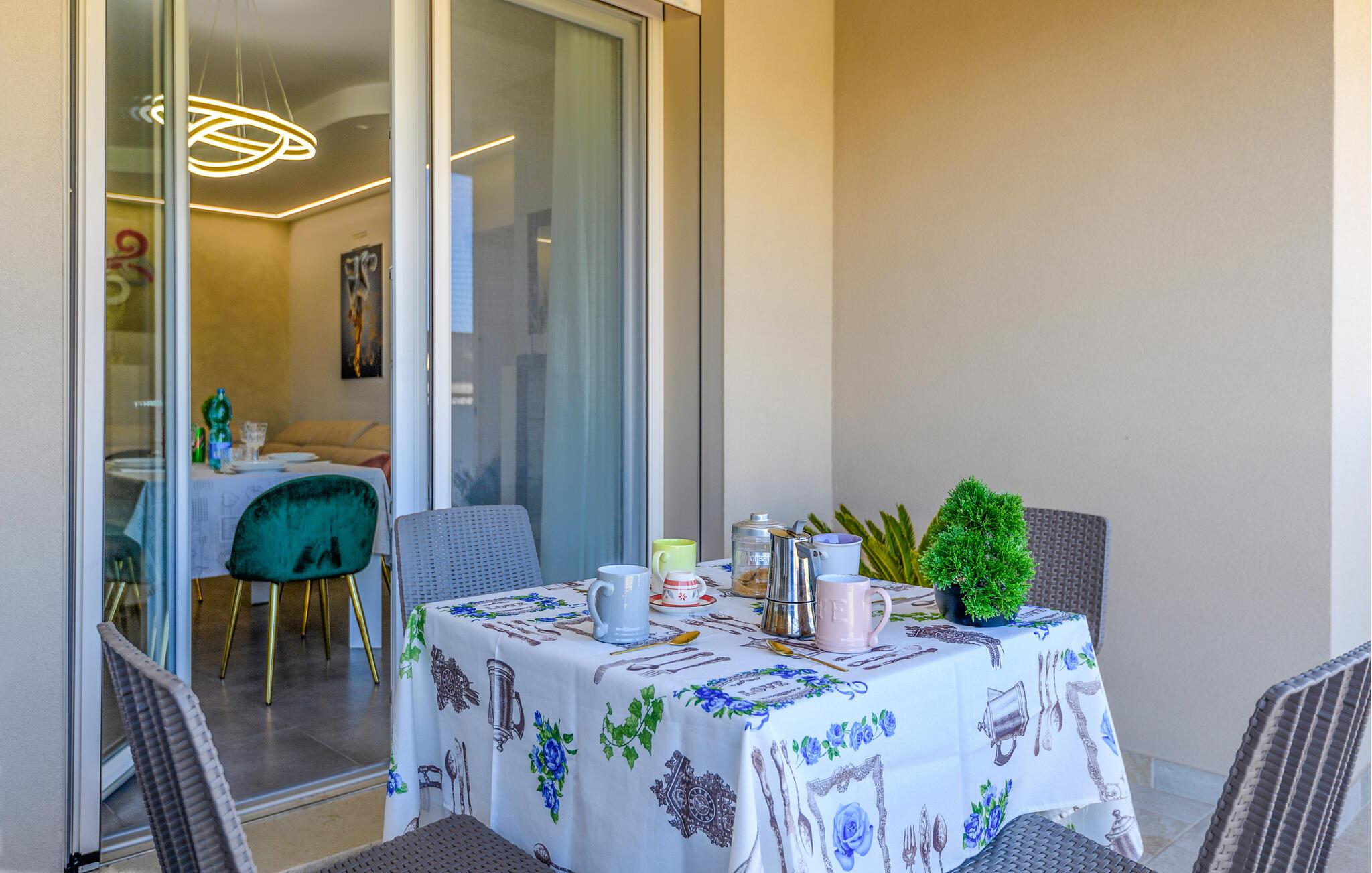 Den rummelige balkon indbyder jer til at nyde måltiderne i det fri og afslutte dagen med et glas vin i hånden.